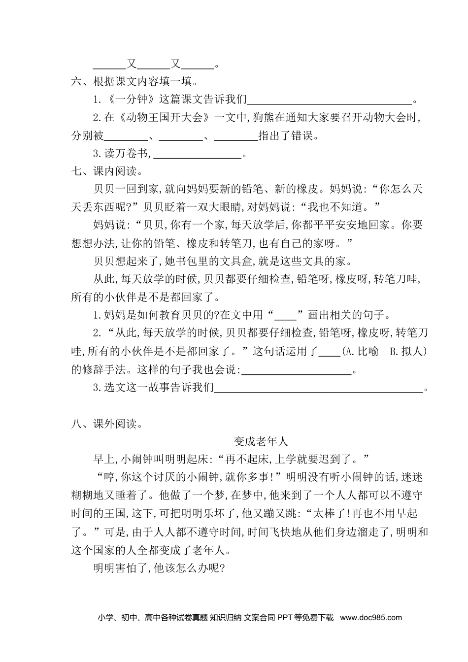 第七单元提升练习一、读拼音,写字词。1.张平zuò()在沙发上yǐjīnɡ()把书bāo()收拾好,只等着出发了。2.弟弟fēichánɡ()喜欢吃西ɡuā(),这cì()奶奶又买了一大kuài()给他。他吃完了,hái()用shé()尖舔舔嘴角,那样子真逗人。二、一锤定音。(给字选择正确的读音)三、形近字,巧辨析。己()已()刀()力()瓜()爪()人()入()四、读一读,连一连。五、读一读,写一写。1.例:一直不见公共汽车的踪影,元元决定走到学校去。一直,决定。2.例:他看见玉米结的又大又多。小学、初中、高中各种试卷真题知识归纳文案合同PPT等免费下载www.doc985.com又又。六、根据课文内容填一填。1.《一分钟》这篇课文告诉我们。2.在《动物王国开大会》一文中,狗熊在通知大家要召开动物大会时,分别被、、指出了错误。3.读万卷书,。七、课内阅读。贝贝一回到家,就向妈妈要新的铅笔、新的橡皮。妈妈说:“你怎么天天丢东西呢?”贝贝眨着一双大眼睛,对妈妈说:“我也不知道。”妈妈说:“贝贝,你有一个家,每天放学后,你都平平安安地回家。你要想想办法,让你的铅笔、橡皮和转笔刀,也有自己的家呀。”贝贝想起来了,她书包里的文具盒,就是这些文具的家。从此,每天放学的时候,贝贝都要仔细检查,铅笔呀,橡皮呀,转笔刀哇,所有的小伙伴是不是都回家了。1.妈妈是如何教育贝贝的?在文中用“”画出相关的句子。2.“从此,每天放学的时候,贝贝都要仔细检查,铅笔呀,橡皮呀,转笔刀哇,所有的小伙伴是不是都回家了。”这句话运用了(A.比喻B.拟人)的修辞手法。这样的句子我也会说:。3.选文这一故事告诉我们。八、课外阅读。变成老年人早上,小闹钟叫明明起床:“再不起床,上学就要迟到了。”“哼,你这个讨厌的小闹钟,就你多事!”明明没有听小闹钟的话,迷迷糊糊地又睡着了。他做了一个梦,在梦中,他来到了一个人人都可以不遵守时间的王国,这下,可把明明乐坏了,他又蹦又跳:“太棒了!再也不用早起了。”可是,由于人人都不遵守时间,时间飞快地从他们身边溜走了,明明和这个国家的人全都变成了老年人。明明害怕了,他该怎么办呢?小学、初中、高中各种试卷真题知识归纳文案合同PPT等免费下载www.doc985.com1.早晨,小闹钟叫明明起床,明明是怎么回答的?从文中找出相关的句子,用“”画出来。2.明明做了一个什么样的梦呢?3.明明害怕了,他应该怎么办?九、看图写话。小朋友,请仔细看图,看看图上都有谁,他们在哪里?做什么?请你展开想象写一写。第七单元提升练习参考答案一、1.坐已经包2.非常瓜次块还舌二、bǎibāizhǔnsuì四、五、1.示例:也没有下雨小明按原计划行动2.示例:妈妈做的蛋糕香甜六、1.要珍惜时间,严格要求自己2.狐狸大灰狼梅花鹿3.行万里路七、1.贝贝,你有一个家,每天放学后,你都平平安安地回家。你要想想办法,让你的铅笔、橡皮和转笔刀,也有自己的家呀。2.B小鸟在枝头唱歌3.示例:爱护学习用品小学、初中、高中各种试卷真题知识归纳文案合同PPT等免费下载www.doc985.com八、1.“哼,你这个讨厌的小闹钟,就你多事!”2.他来到了一个人人都可以不遵守时间的王国,这下,可把明明乐坏了,他又蹦又跳:“太棒了!再也不用早起了。”可是,由于人人都不遵守时间,时间飞快地从他们身边溜走了,明明和这个国家的人全变成了老年人。3.示例:他应该珍惜时间,不要睡懒觉,抓紧时间起床去上学。九、示例:周末,妈妈带着冬冬去外婆家,外婆准备了好多好吃的。白里透红的桃子,鲜美多汁的西瓜……外婆让冬冬吃,冬冬拿起一块儿西瓜递给外婆,说:“外婆,你先吃。”小学、初中、高中各种试卷真题知识归纳文案合同PPT等免费下载www.doc985.com