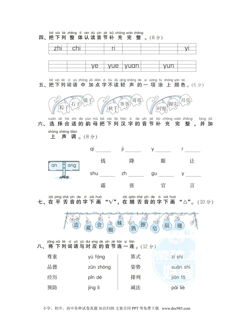 1汉语拼音班级__________姓名__________得分__________时间:40分钟满分:100分小学、初中、高中各种试卷真题知识归纳文案合同PPT等免费下载www.doc985.com小学、初中、高中各种试卷真题知识归纳文案合同PPT等免费下载www.doc985.com1汉语拼音一、qwertyuiopɑsdfghjklzxcvbnm二、DGEBACFH排序:ABCDEFGH三、前鼻韵母:ɑneninunün后鼻韵母:ɑngengingong声母:bpmfdtnlgkhjqxzhchshrzcsyw四、shizicisiwuyuyinying五、涂颜色的有:石子秋千脚尖六、ánàngǎnàngāngāngānán七、造√藏√擦√皂√食△蜘△蛛△熟△晨△翅△八、小学、初中、高中各种试卷真题知识归纳文案合同PPT等免费下载www.doc985.com