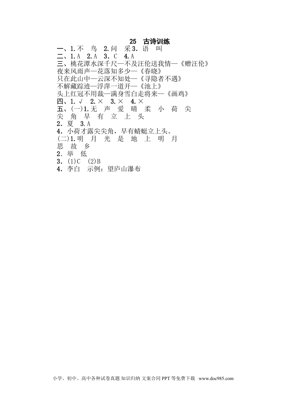 25古诗训练班级__________姓名__________得分__________时间:40分钟满分:100分小学、初中、高中各种试卷真题知识归纳文案合同PPT等免费下载www.doc985.com小学、初中、高中各种试卷真题知识归纳文案合同PPT等免费下载www.doc985.com25古诗训练一、1.不鸟2.问采3.语叫二、1.A2.A3.C4.A三、桃花潭水深千尺—不及汪伦送我情—《赠汪伦》夜来风雨声—花落知多少—《春晓》只在此山中—云深不知处—《寻隐者不遇》不解藏踪迹—浮萍一道开—《池上》头上红冠不用裁—满身雪白走将来—《画鸡》四、1.√2.×3.×4.×五、(一)1.无声爱晴柔小荷尖尖角早有立上头2.夏3.A4.小荷才露尖尖角,早有蜻蜓立上头。(二)1.明月光是地上明月思故乡2.举低3.(1)C(2)B4.李白示例:望庐山瀑布小学、初中、高中各种试卷真题知识归纳文案合同PPT等免费下载www.doc985.com