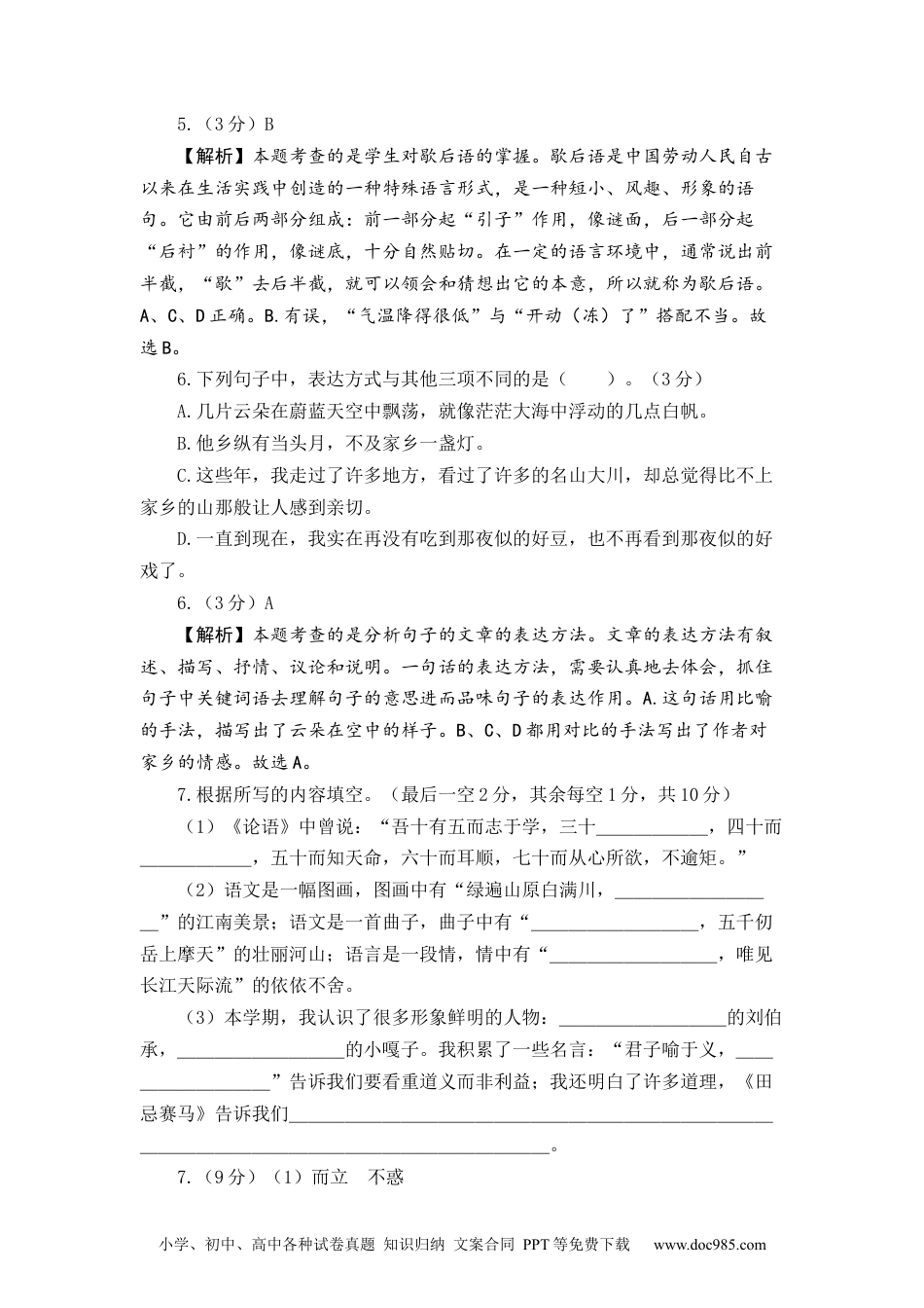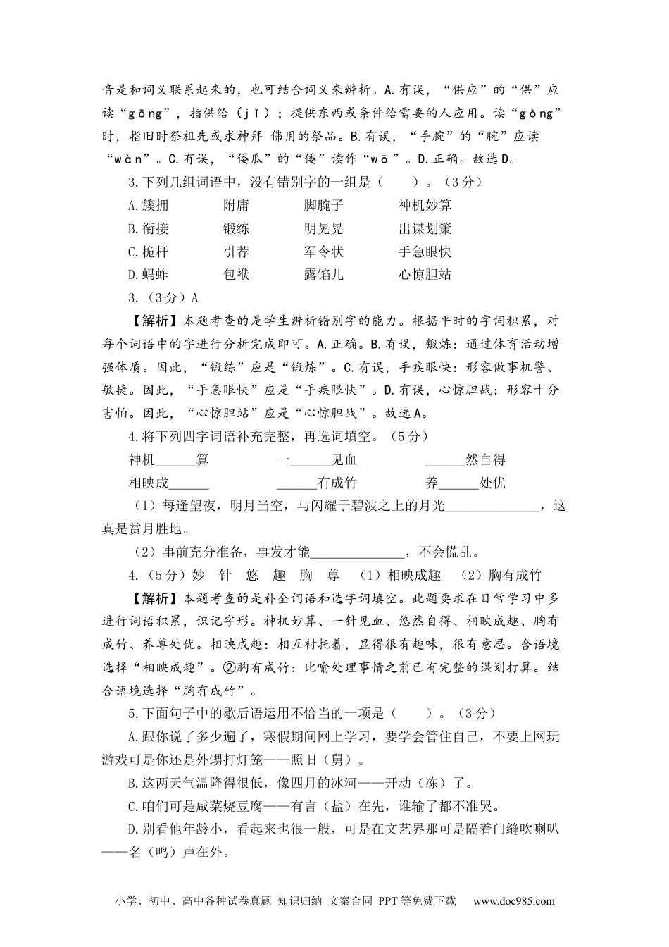 小学、初中、高中各种试卷真题知识归纳文案合同PPT等免费下载www.doc985.com绝密★启用前2023-2024学年五年级语文下册期末模拟卷二注意事项:1.本试卷共8页。全卷总分100分。考试时间90分钟。2.答题前,考生在试卷和答题卡上务必用直径0.5毫米黑色墨水签字笔将自己的姓名、学号填写清楚。3.请用直径0.5毫米黑色签字笔在答题卡上各题的答题区域内作答,在试题卷上作答无效。4.考试结束,将本试卷和答题卡一并交回。一、积累与运用。(42分)1.认真抄写下面这段话,注意书写正确、端正,格式整齐,注意标点符号在句子中的位置。(2分)汉字横平竖直,方方正正,正如中国人的做人秉性,顶天立地,堂堂正正。汉字字形藏理,字音通意,正如中国人的文化特质,阴阳互补,和谐统一。____________________________________________________________________________1.(2分)汉字横平竖直,方方正正,正如中国人的做人秉性,顶天立地,堂堂正正。汉字字形藏理,字音通意,正如中国人的文化特质,阴阳互补,和谐统一。【解析】本题考查的是学生对于所学汉字的书写能力。认真抄写题目中句子,将字写工整、正确、舒展、美观。2.下列加点字注音完全正确的一项是()。(3分)A.供应(gòng)呐喊(nà)痴迷(chī)拧螺丝(nǐng)B.摇晃(huàng)威吓(hè)殉葬(xùn)作祷告(dǎo)C.倭瓜(wěi)霹雳(pī)调换(diào)蘸药末(zhàn)D.燕山(yān)龇牙(zī)圆晕(yùn)黏着物(zhuó)2.(3分)D【解析】本题考查的是字音的辨析。注意平翘舌的发音及声调的不同,字小学、初中、高中各种试卷真题知识归纳文案合同PPT等免费下载www.doc985.com音是和词义联系起来的,也可结合词义来辨析。A.有误,“供应”的“供”应读“gōng”,指供给(jǐ);提供东西或条件给需要的人应用。读“gòng”时,指旧时祭祖先或求神拜佛用的祭品。B.有误,“手腕”的“腕”应读“wàn”。C.有误,“倭瓜”的“倭”读作“wō”。D.正确。故选D。3.下列几组词语中,没有错别字的一组是()。(3分)A.簇拥附庸脚腕子神机妙算B.衔接锻练明晃晃出谋划策C.桅杆引荐军令状手急眼快D.蚂蚱包袱露馅儿心惊胆站3.(3分)A【解析】本题考查的是学生辨析错别字的能力。根据平时的字词积累,对每个词语中的字进行分析完成即可。A.正确。B.有误,锻炼:通过体育活动增强体质。因此,“锻练”应是“锻炼”。C.有误,手疾眼快:形容做事机警、敏捷。因此,“手急眼快”应是“手疾眼快”。D.有误,心惊胆战:形容十分害怕。因此,“心惊胆站”应是“心惊胆战”。故选A。4.将下列四字词语补充完整,再选词填空。(5分)神机___算一___见血___然自得相映成______有成竹养___处优(1)每逢望夜,明月当空,与闪耀于碧波之上的月光_______,这真是赏月胜地。(2)事前充分准备,事发才能_______,不会慌乱。4.(5分)妙针悠趣胸尊(1)相映成趣(2)胸有成竹【解析】本题考查的是补全词语和选字词填空。此题要求在日常学习中多进行词语积累,识记字形。神机妙算、一针见血、悠然自得、相映成趣、胸有成竹、养尊处优。相映成趣:相互衬托着,显得很有趣味,很有意思。合语境选择“相映成趣”。②胸有成竹:比喻处理事情之前已有完整的谋划打算。结合语境选择“胸有成竹”。5.下面句子中的歇后语运用不恰当的一项是()。(3分)A.跟你说了多少遍了,寒假期间网上学习,要学会管住自己,不要上网玩游戏可是你还是外甥打灯笼——照旧(舅)。B.这两天气温降得很低,像四月的冰河——开动(冻)了。C.咱们可是咸菜烧豆腐——有言(盐)在先,谁输了都不准哭。D.别看他年龄小,看起来也很一般,可是在文艺界那可是隔着门缝吹喇叭——名(鸣)声在外。小学、初中、高中各种试卷真题知识归纳文案合同PPT等免费下载www.doc985.com5.(3分)B【解析】本题考查的是学生对歇后语的掌握。歇后语是中国劳动人民自古以来在生活实践中创造的一种特殊语言形式,是一种短小、风趣、形象的语句。它由前后两部分组成:前一部...