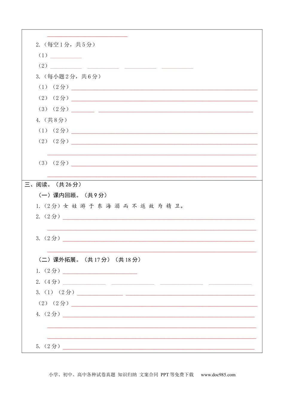 小学、初中、高中各种试卷真题知识归纳文案合同PPT等免费下载www.doc985.com2024年小升初语文模拟卷一答题卡一、夯实基础。(18分)(第5~8题请用2B铅笔填涂)1.2.___________3._________________________________4.______________________5.[A][B][C][D]6.[A][B][C][D]7.[A][B][C][D]8.[A][B][C][D]二、日积月累。(26分)1.(每空1分,共7分)(1)____________________________(2)____________________________(3)____________________________(4)____________________________(5)________________________________________________________姓名:__________________________准考证号:请在各题目的答题区域内作答,超出黑色矩形边框限定区域的答案无效!形贴条码区1.答题前,考生先将自己的姓名,学号填写清楚,并认真核准条形码上的姓名、学号,在规定位置贴好条形码。2.选择题必须用2B铅笔填涂;非选择题必须用0.5mm黑色签字笔答题,不得用铅笔或圆珠笔答题;字体工整、笔迹清晰。3.请按题号顺序在各题目的答题区域内作答,超出区域书写的答案无效;在草稿纸、试题卷上答题无效。4.保持卡面清洁,不要折叠、不要弄破。注意事项小学、初中、高中各种试卷真题知识归纳文案合同PPT等免费下载www.doc985.com____________________________2.(每空1分,共5分)(1)___________(2)____________________________________________3.(每小题2分,共6分)(1)(2分)_________________________________________________________________(2)(2分)_________________________________________________________________(3)(2分)______________________________________________________________4.(共8分)(1)(2分)_________________________________________________________________(2)(2分)__________________________________________________________________________________________________________________________________________(3)(2分)__________________________________________________________________________________________________________________________________________三、阅读。(共26分)(一)课内回顾。(共9分)1.(2分)女娃游于东海溺而不返故为精卫。2.(2分)____________________________________________________________________________________________________________________________________________3.(2分)____________________________________________________________________________________________________________________________________________(二)课外拓展。(共17分)(共18分)1.(2分)__________________________2.(4分)____________________________________________________________3.(1)(2分)_____________________________________________________________(2)(2分)_________________________________________________________________4.(2分)_____________________________________________________________________________________________________________________________________________________________________________________________________________________5.(2分)___________________________________________________________________小学、初中、高中各种试卷真题知识归纳文案合同PPT等免费下载www.doc985.com__________________________________________________________________________________________________________________________________________________四、习作。(40分)小学、初中、高中各种试卷真题知识归纳文案合同PPT等免费下载www.doc985.com小学、初中、高中各种试卷真题知识归纳文案合同PPT等免费下载www.doc985.com小学、初中、高中各种试卷真题知识归纳文案合同PPT等免费下载www.doc985.com