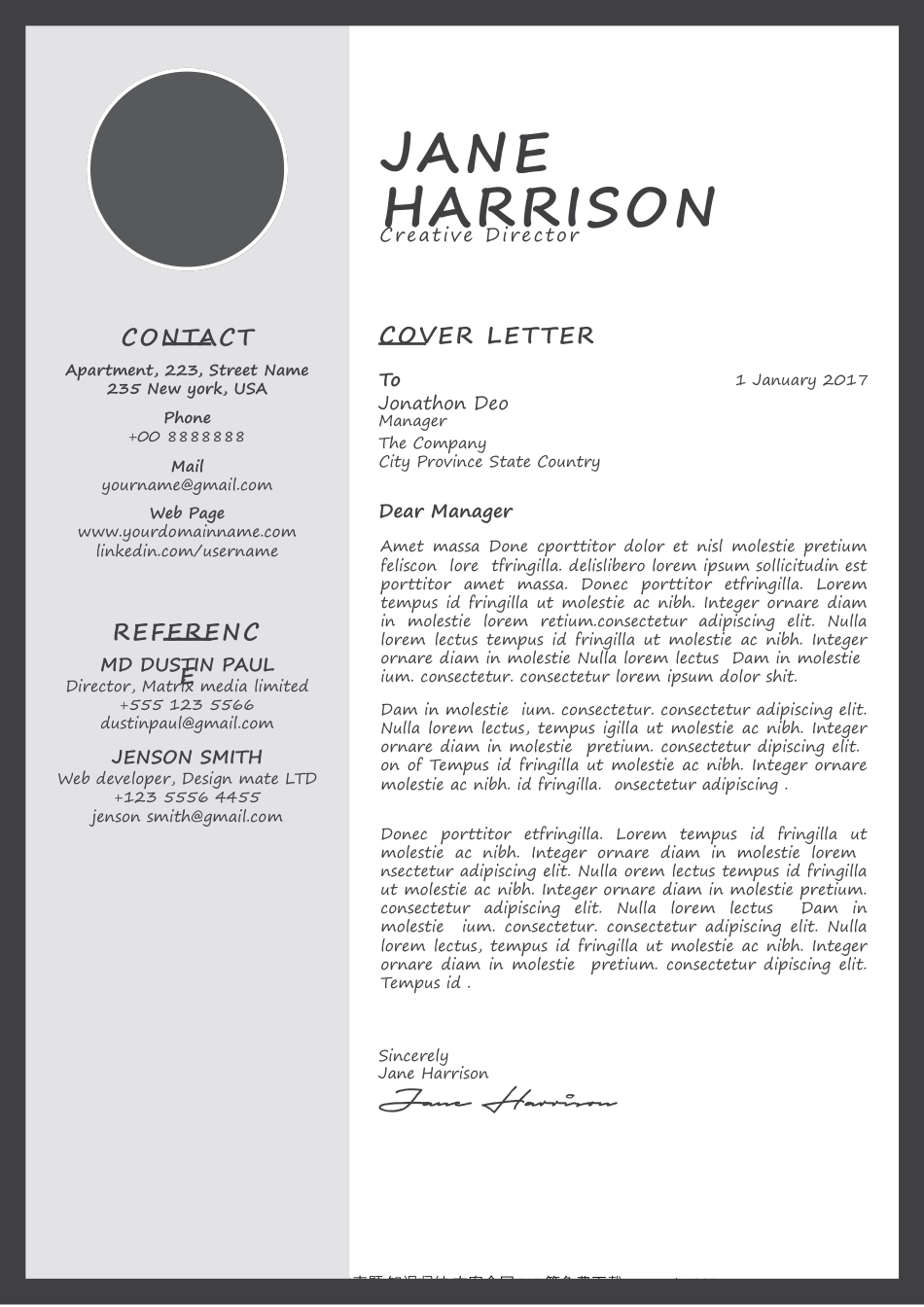 小学、初中、高中各种卷真试题知识归纳文案合同PPT等免下费载www.doc985.comSincerelyJaneHarrisonDearManagerCOVERLETTERManagerTheCompanyCityProvinceStateCountryJonathonDeoToCreativeDirectorJANEHARRISONAmetmassaDonecporttitordoloretnislmolestiepretiumfelisconloretfringilla.delisliberoloremipsumsollicitudinestporttitorametmassa.Donecporttitoretfringilla.Loremtempusidfringillautmolestieacnibh.Integerornarediaminmolestieloremretium.consecteturadipiscingelit.Nullaloremlectustempusidfringillautmolestieacnibh.IntegerornarediaminmolestieNullaloremlectusDaminmolestieium.consectetur.consecteturloremipsumdolorshit.Daminmolestieium.consectetur.consecteturadipiscingelit.Nullaloremlectus,tempusigillautmolestieacnibh.Integerornarediaminmolestiepretium.consecteturdipiscingelit.onofTempusidfringillautmolestieacnibh.Integerornaremolestieacnibh.idfringilla.onsecteturadipiscing.Donecporttitoretfringilla.Loremtempusidfringillautmolestieacnibh.Integerornarediaminmolestieloremnsecteturadipiscingelit.Nullaoremlectustempusidfringillautmolestieacnibh.Integerornarediaminmolestiepretium.consecteturadipiscingelit.NullaloremlectusDaminmolestieium.consectetur.consecteturadipiscingelit.Nullaloremlectus,tempusidfringillautmolestieacnibh.Integerornarediaminmolestiepretium.consecteturdipiscingelit.Tempusid.1January2017CONTACTApartment,223,StreetName235Newyork,USAPhone+008888888Mailyourname@gmail.comWebPagewww.yourdomainname.comlinkedin.com/usernameMDDUSTINPAULDirector,Matrixmedialimited+5551235566dustinpaul@gmail.comJENSONSMITHWebdeveloper,DesignmateLTD+12355564455jensonsmith@gmail.comREFERENCE