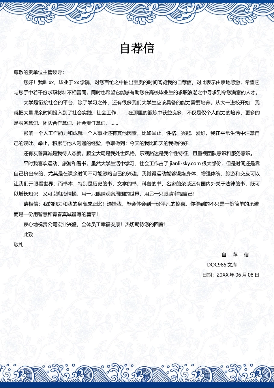 姓名:DOC985文库电话:18688888888毕业院校:北京大学专业:会计自荐信尊敬的贵单位主管领导:您好!我叫xx,毕业于xx学院,对您百忙之中抽出宝贵的时间阅览我的自荐信,对此表示由衷地感激,希望它与您手中若干份求职材料不相雷同,同时也希望它能够有助您在高校毕业生的求职浪潮之中寻求到令您满意的人才。大学是衔接社会的平台,除了学习之外,还有很多我们大学生应该具备的能力需要培养。从大一进校开始,我就把大量课余时间投入到了社会实践、社会工作,......在那里的锻炼中获益良多,不仅是仅个人能力的培养,更多的是服务意识、团队合作意识、社会责任意识。……影响一个人工作能力和成就一个人事业还有其他因素,比如举止、性格、兴趣、爱好。我在平常生活中注意自己的谈吐、举止,积累与他人沟通的经验,争取做到:今天的我比昨天的我做的好!还有友善真诚是我待人态度,顾全大局是我处世风格,乐观豁达是我个性特征,且重视团队意识和服务意识。平时我喜欢运动、旅游和看书,虽然大学生活中学习、社会工作占了jianli-sky.com很大部份,但是时间还是靠自己挤出来的,尤其是在课余时间不可能忽略自己的兴趣。我觉得运动能够锻炼身体、增强体魄;旅游和交友可以让我们开眼看世界;而书本,特别是历史的书、文学的书、科普的书、名家的杂谈还有国内外关于法律的书,既可以增长知识,又可以陶冶情操。用一只眼睛观察周围的世界,用另一只眼睛审视自己!请相信:我的能力和我的身高成正比!选择我,您会体会到一份平凡的惊喜。你得到的不只是一份简单的承诺而是一份用智慧和青春真诚谱写的篇章!衷心地祝贵公司宏业兴盛,全体员工幸福安康!热切期待您的回音!此致敬礼自荐信:DOC985文库日期:20XX年06月08日基本信息BasicInformation姓名:DOC985文库性别:男民族:汉族学历:本科出生日期:1989.08健康状况:健康专业:广告设计毕业学校:某某大学地址:某某市某某区邮编:0023XXXX联系电话:18688888888电子邮件:888888@qq.com求职意向JobObjective广告设计师\美术指导\助理设计师\网页设计师\电脑美工\网页设计\Flash设计教育背景EducationBackground2002.09-2005.07某某高中2005.09-2008.07某某大学专业技能ProfessionalSkills熟练掌握Photoshop\CorelDRAW\Illustrator\Flash等平面设计和网页制作工作经历WorkExperience2007.09-2008.03某某广告有限公司设计师2007.09-2008.03某某文化传播有限公司设计师2007.09-2008.03某某广告策划有限公司主笔设计师2007.09-2008.03某某创意广告设计有限公司美术指导自我评价SelfAssessment我才华出众,激情四溢,以广告事业为终生职业的广告人我充满活力,善于思考,用于创新,敬业高效,精益求精追求:尽善尽美,客户满意宗旨:实现客户利益最大化信念:以人为本,诚信至上理念:以专业化的思想,专业化的执行,做专业的广告