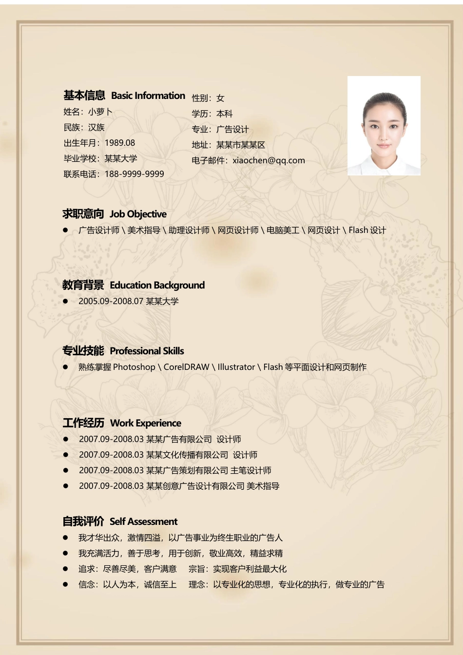 人个简历姓名:小卜萝系方式:联13888888888求意向:职设计师基本信息BasicInformation姓名:小萝卜民族:汉族出生年月:1989.08毕业学校:某某大学联系电话:188-9999-9999求职意向JobObjective广告设计师\美术指导\助理设计师\网页设计师\电脑美工\网页设计\Flash设计教育背景EducationBackground2005.09-2008.07某某大学专业技能ProfessionalSkills熟练掌握Photoshop\CorelDRAW\Illustrator\Flash等平面设计和网页制作工作经历WorkExperience2007.09-2008.03某某广告有限公司设计师2007.09-2008.03某某文化传播有限公司设计师2007.09-2008.03某某广告策划有限公司主笔设计师2007.09-2008.03某某创意广告设计有限公司美术指导自我评价SelfAssessment我才华出众,激情四溢,以广告事业为终生职业的广告人我充满活力,善于思考,用于创新,敬业高效,精益求精追求:尽善尽美,客户满意宗旨:实现客户利益最大化信念:以人为本,诚信至上理念:以专业化的思想,专业化的执行,做专业的广告性别:女学历:本科专业:广告设计地址:某某市某某区电子邮件:xiaochen@qq.com尊敬的贵单位主管领导:您好!我叫xx,毕业于xx学院,对您百忙之中抽出宝贵的时间阅览我的自荐信,对此表示由衷地感激,希望它与您手中若干份求职材料不相雷同,同时也希望它能够有助您在高校毕业生的求职浪潮之中寻求到令您满意的人才。大学是衔接社会的平台,除了学习之外,还有很多我们大学生应该具备的能力需要培养。从大一进校开始,我就把大量课余时间投入到了社会实践、社会工作,......在那里的锻炼中获益良多,不仅是仅个人能力的培养,更多的是服务意识、团队合作意识、社会责任意识。……影响一个人工作能力和成就一个人事业还有其他因素,比如举止、性格、兴趣、爱好。我在平常生活中注意自己的谈吐、举止,积累与他人沟通的经验,争取做到:今天的我比昨天的我做的好!还有友善真诚是我待人态度,顾全大局是我处世风格,乐观豁达是我个性特征,且重视团队意识和服务意识。平时我喜欢运动、旅游和看书,虽然大学生活中学习、社会工作占了jianli-sky.com很大部份,但是时间还是靠自己挤出来的,尤其是在课余时间不可能忽略自己的兴趣。我觉得运动能够锻炼身体、增强体魄;旅游和交友可以让我们开眼看世界;而书本,特别是历史的书、文学的书、科普的书、名家的杂谈还有国内外关于法律的书,既可以增长知识,又可以陶冶情操。用一只眼睛观察周围的世界,用另一只眼睛审视自己!请相信:我的能力和我的身高成正比!选择我,您会体会到一份平凡的惊喜。你得到的不只是一份简单的承诺,而是一份用智慧和青春真诚谱写的篇章!衷心地祝贵公司宏业兴盛,全体员工幸福安康!热切期待您的回音!此致敬礼系我请联自荐书自荐人:小萝卜2016年7月16日姓名:小卜萝系方式:联13888888888