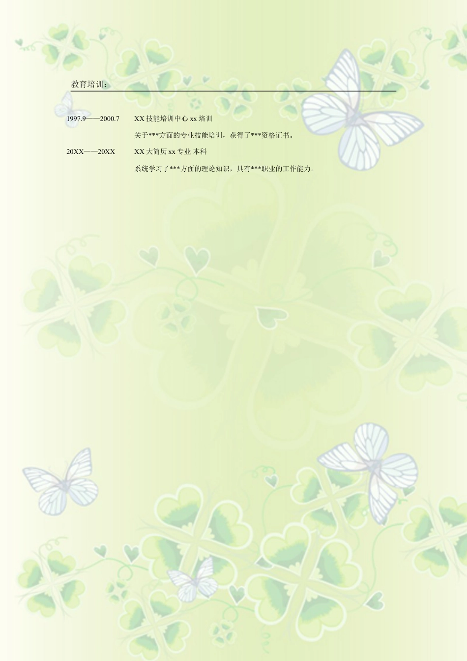 个人简历姓名:性别:民族:出生年月:联系电话:工作经验:学历:专业:毕业学校:住址:电子信箱:自我评价:进行简要描述,说明自己的专业能力、职业能力、以及社会能力等等。写上几段话即可。参考A:热情随和,活波开朗,具有进取精神和团队精神,有较强的动手能力。良好协调沟通能力,适应力强,反应快、积极、灵活,爱创新!提高自己,适应工作的需要。所以我希望找一份与自身知识结构相关的工作,如文秘,文员,助理可以有更大的空间来证明自己,发展自己!求职意向:目标职位:希望应聘的岗位rc21cn期望地区:希望工作的地区、城市范围到岗时间:新岗位能够多长时间内到任工作经历:教育培训:1997.9——2000.7XX技能培训中心xx培训关于***方面的专业技能培训,获得了***资格证书。20XX——20XXXX大简历xx专业本科系统学习了***方面的理论知识,具有***职业的工作能力。