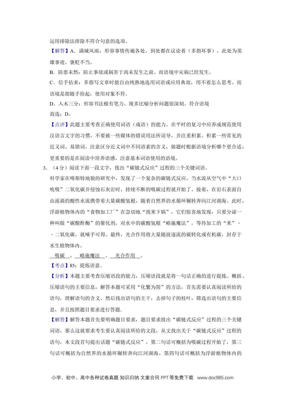 2010年江苏省高考语文试卷解析版参考答案与试题解析一、语言文字运用(15分)1.(3分)下列加点的字,每对读音都不相同的一组是()A.弹劾/弹丸之地哽咽/狼吞虎咽责难/多难兴邦B.鲜活/寡廉鲜耻泊位/淡泊明志叶韵/一叶知秋C.大度/审时度势长进/身无长物解放/浑身解数D.参差/扪参历井披靡/风靡一时畜牧/六畜兴旺【考点】11:字音.菁优网版权所有【分析】此题主要是考查对多音字的读音的辨析,可以根据词性,也可以根据词义来判断.【解答】A.tán/dànyè/yànnàn/nàn;B.xiān/xiǎnbó/bóxié/yè;C.dù/duózhǎng/chángjiě/xiè;D.cēn/shēnmǐ/mǐxù/chù。故选:C。【点评】字音题主要考查学生对多音字、形声字、形近字的辨识,而且是对常用字的易错音考查得比较多.所以,平时一定要注意对一些常用字的不常见读音的识记.2.(3分)下列各句中,加点的成语使用恰当的一句是()A.司机张师傅冒着生命的危险解救乘客的事情,一经新闻媒体报道,就被传得满城风雨,感动了无数市民。B.近年来,在种种灾害面前,各级政府防患未然,及时启动应急预案,力争把人民的生命财产损失降到最低限度。C.这些“环保老人”利用晨练的机会,把游客丢弃在景点的垃圾信手拈来,集中带到山下,分类处理。D.“生命的价值在于厚度而不在于长度,在于奉献而不在于获取…”院士的一番话入木三分,让我们深受教育。【考点】18:成语.菁优网版权所有【分析】解答此题的关键是掌握相关成语的意思,正确辨别他们的感情色彩、修饰对象、使用范围等。解答时联系上下文,从词语与语境的语意关系、搭配关系等方面筛选,再小学、初中、高中各种试卷真题知识归纳文案合同PPT等免费下载www.doc985.com运用排除法排除不符合句意的选项。【解答】A.满城风雨:形容事情传遍各处,到处都在议论着(多指坏事)。此处为英雄事迹。褒贬不当。B.防患未然:防止事故或祸害于尚未发生之前。而语境中灾祸已经发生。C.信手拈来:多指写文章时能自由纯熟地选用词语或应用典故,用不着怎么思考。而语境是指随手捡起,使用对象不符。D.入木三分:形容书法极有笔力。现多比喻分析问题很深刻。符合语境故选:D。【点评】此题主要考查正确使用词语(成语)的能力。在平时的复习中应养成规范使用汉语言文字的习惯,不要被一些媒体的错误用法所误导,并注重积累。积累一些常见的近义词、易错词,注意区分近义词中不同语素的含义,做题时根据语境分析哪个更合适;更重要的是在阅读中培养语感,注意基本词语使用的语境。3.(4分)阅读下面一段文字,找出“碳链式反应”过程的三个关键词语。科学家在喀斯特地貌的研究中,发现了一个复杂的碳链式反应。当水流从空气中“大口吮吸”二氧化碳并侵蚀石灰岩时,持续不断的吸碳过程就开始了。接着,在岩石表面自由流淌的酸性水流携带着大量碳酸氢根,随着自然界的水循环辗转奔向江河湖海。此时,浮游植物体内的“食物加工厂”在急切地“找米下锅”,它们惊喜地发现,只要分泌一种叫做“碳酸酐酶”的催化剂,对水中的碳酸氢根“略施魔法”,等待加工的“米”﹣﹣二氧化碳,就唾手可得。最终,光合作用将大量随波逐流的碳转化成有机碳,封存于水生植物体内。吸碳、略施魔法、光合作用。【考点】85:提炼语意.菁优网版权所有【分析】本题主要考查压缩语段的能力,压缩语段就是将一句话正确的进行提炼、概括、压缩语句的主要信息,解答本题可采用“化繁为简”的方法,首先需要认真阅读所给的语句,理解语句的含义,然后找出语句的主干,去掉句子的枝叶,筛选出语句的主要信息,并且按照题目要求进行答题.【解答】解答本题首先要明确题目要求,题目要求找出“碳链式反应”过程的三个关键词语,那么这就要求考生要认真阅读所给的文段,从文找出关于“碳链式反应”过程的语句,本文段首句提出话题“碳链式反应”,第二句话可概括为吸碳过程开始了,第三句话可概括为自然界的水循环辗转奔向江河湖海,第四句话可概括为浮游植物体内的小学、初中、高中各种试卷真题知识归纳文案合同PPT等免费下载www.doc985.com“食物加工厂”略施魔法,第五句话可概括为光合作用将大量随...