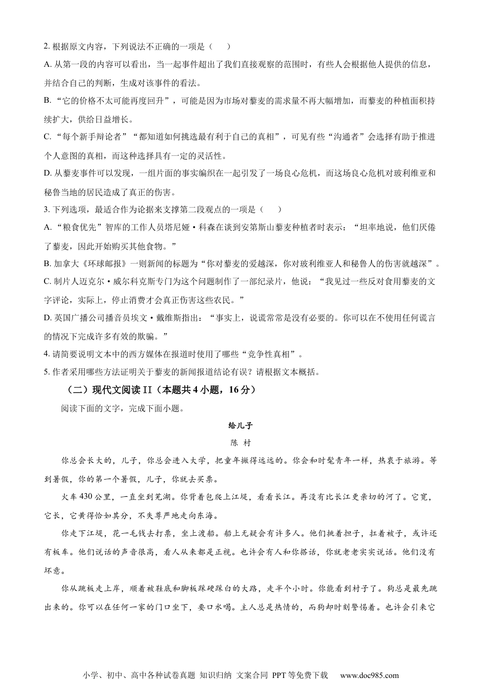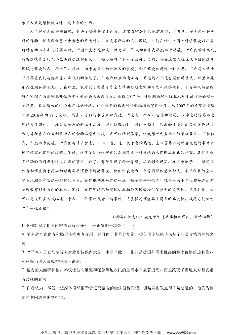 小学、初中、高中各种试卷真题知识归纳文案合同PPT等免费下载www.doc985.com2023年普通高等学校招生全国统一考试(新课标全国Ⅰ卷)语文注意事项:1.答卷前,考生务必将自己的姓名、准考证号等填写在答题卡上。2.回答选择题时,选出每小题答案后,用铅笔把答题卡上对应题目的答案标号涂黑。如需改动,用橡皮擦干净后,再选涂其他答案标号。回答非选择题时,将答案写在答题卡上。写在本试卷上无效。3.考试结束后,将本试卷和答题卡一并交回。一、现代文阅读(35分)(一)现代文阅读I(本题共5小题,19分)阅读下面的文字,完成下面小题。对素食者和肠胃疾病患者来说,藜麦的发现是一个奇迹。藜麦不含麸质,富含镁和铁,比其他种子含有更多的蛋白质,包括人体无法独自生成的必需的氨基酸。美国宇航局宣布,藜麦是地球上营养最均衡的食物之一,是宇航员的理想之选。产于安第斯山的藜麦有一个令西方消费者神往的传说:印加人非常重视藜麦,认为它是神圣的,并且称之为“万谷之母”。不过,藜麦的爱好者却通过媒体发现了一个令人不安的事实。从2006年到2013年,玻利维亚和秘鲁的藜麦价格上涨了两倍。2011年,《独立报》称,玻利维亚的藜麦消费量“5年间下降了34%,当地家庭已经吃不起这种主食了,它已经变成了奢侈品”。《纽约时报》援引研究报告称,藜麦种植区的儿童营养不良率正在上升。2013年,《卫报》用煽动性标题提升了人们对这个问题的关注度:“素食者的肚子能装下藜麦令人反胃的事实吗?”该报称,贫穷的玻利维亚人和秘鲁人正在食用更加便宜的“进口垃圾食品”。《独立报》2013年一篇报道的标题是“藜麦:对你有利--对玻利维亚人有害”。这些消息传遍了全球,在健康饮食者之中引发了一场良心危机。在社交媒体、素食博客和健康饮食论坛上,人们开始询问食用藜麦是否合适。这种说法看似可信,被许多人认可,但是经济学家马克·贝勒马尔等人对此则持保留意见。毕竟,藜麦贸易使大量外国资金涌入玻利维亚和秘鲁,其中许多资金进入了南美最贫穷的地区。几位经济学家跟踪了秘鲁家庭支出的调查数据,将种植且食用藜麦的家庭、食用但不种植藜麦的家庭和从不接触藜麦的家庭划分为三个小组。他们发现,从2004年到2013年,三个小组的生活水平都上升了,其中藜麦种植户家庭支出的增长速度是最快的。农民们正在变富,他们将这种新收入转化为支出又给周边民众带来了好处。那么藜麦消费量下降34%又是怎么回事呢?原来,在很长的时间内两个国家的藜麦消费量一直在缓慢而稳定地下降,这意味着消费量的下降和价格的激增不存在明显的联系。更加接近事实的解释是,秘鲁人和玻利小学、初中、高中各种试卷真题知识归纳文案合同PPT等免费下载www.doc985.com维亚人只是想换换口味,吃点别的东西。为了解藜麦的种植情况,我去了秘鲁科尔卡山谷,这里在印加时代以前就得到了开垦。藜麦是一种美丽的作物,拥有深红色或金黄色的巨大种球。在安第斯山的这片区域,人们在梯田上同时种植藜麦以及当地特有的玉米和马铃薯品种。“国外需求绝对是一件好事,”我的秘鲁向导杰西卡说道,“农民非常高兴,所有想吃藜麦的人仍然买得起这种食物。”她还解释了另一个好处。之前,秘鲁城里人往往认为他们这片区域吃藜麦的人“很土”。现在,由于美国人和欧洲人的重视,食用藜麦被视作一种时尚。“利马人终于开始尊重我们这些高原人和我们的传统了。”玻利维亚西南部有一片遥远而不适合居住的区域,那里到处都是盐湖和休眠火山。在那里,我看到了由藜麦资金支持的当地急需的开发和旅游项目。千百年来勉强能够养家糊口的自耕农开始为更加美好的未来而投资。我在2017年4月听到的玻利维亚人对于该作物的唯一抱怨是,日益增长的供给正在拉低价格。玻利维亚的藜麦种植面积增长了两倍多,从2007年的5万公顷增长到2016年的18万公项。马克·贝勒马尔后来对我说:“这是一个令人悲伤的结局,因为它的价格不太可能再度回升。”在风景如画的科尔卡山谷,当太阳落山时,我问杰西卡,欧洲和北美的消费者是否应该为吃掉秘鲁人和玻利维亚人的食物而感到内疚。我可以猜到答案,但我想听到当地人的亲口否认。“相信我,”杰西卡笑道,“...