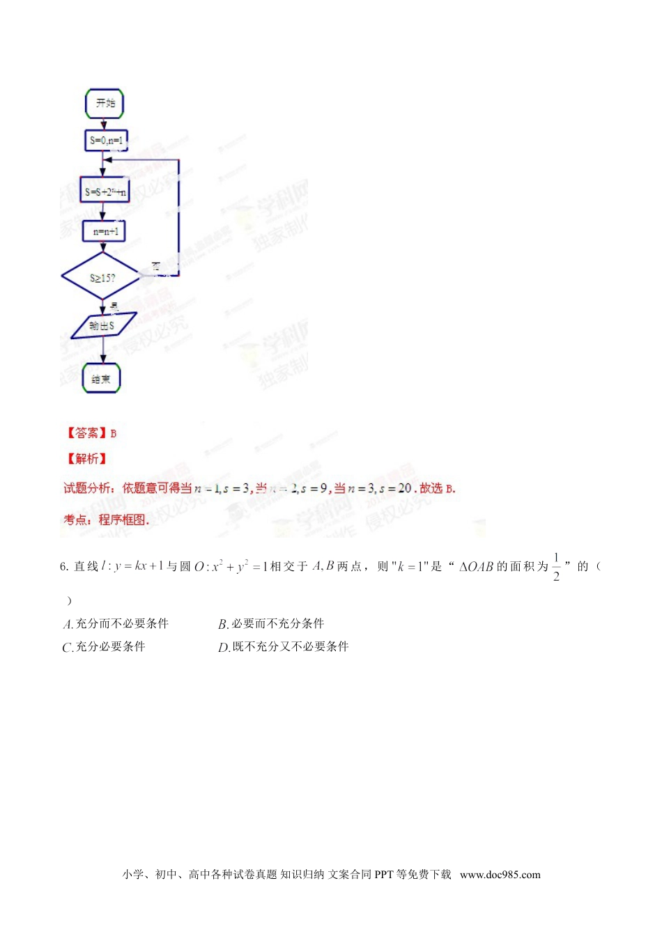 一.选择题:本大题共10小题,每小题5分,共50分.在每小题给出的四个选项中,只有一项是符合题目要求的.1.复数的共轭复数等于()2.某空间几何体的正视图是三角形,则该几何体不可能是()圆柱圆锥四面体三棱柱3.等差数列的前项和,若,则()4.若函数的图像如右图所示,则下列函数图像正确的是()小学、初中、高中各种试卷真题知识归纳文案合同PPT等免费下载www.doc985.com5.阅读右图所示的程序框图,运行相应的程序,输出的得值等于()小学、初中、高中各种试卷真题知识归纳文案合同PPT等免费下载www.doc985.com6.直线与圆相交于两点,则是“的面积为”的()充分而不必要条件必要而不充分条件充分必要条件既不充分又不必要条件小学、初中、高中各种试卷真题知识归纳文案合同PPT等免费下载www.doc985.com7.已知函数则下列结论正确的是()A.是偶函数B.是增函数C.是周期函数D.的值域为8.在下列向量组中,可以把向量表示出来的是()A.B.C.D.9.设分别为和椭圆上的点,则两点间的最大距离是()A.B.C.D.小学、初中、高中各种试卷真题知识归纳文案合同PPT等免费下载www.doc985.com10.用代表红球,代表蓝球,代表黑球,由加法原理及乘法原理,从1个红球和1个篮球中取出若干个球的所有取法可由的展开式表示出来,如:“1”表示一个球都不取、“”表示取出一个红球,面“”用表示把红球和篮球都取出来.以此类推,下列各式中,其展开式可用来表示从5个无区别的红球、5个无区别的蓝球、5个有区别的黑球中取出若干个球,且所有的篮球都取出或都不取出的所有取法的是A.B.C.D.二.填空题11.若变量满足约束条件则的最小值为________.小学、初中、高中各种试卷真题知识归纳文案合同PPT等免费下载www.doc985.com12.在中,,则的面积等于_________.[来源:学科网]13.要制作一个容器为4,高为的无盖长方形容器,已知该容器的底面造价是每平方米20元,侧面造价是每平方米10元,则该容器的最低总造价是_______(单位:元)14.如图,在边长为(为自然对数的底数)的正方形中随机撒一粒黄豆,则他落到阴影部分的概率为______.小学、初中、高中各种试卷真题知识归纳文案合同PPT等免费下载www.doc985.com15.若集合且下列四个关系:①;②;③;④有且只有一个是正确的,则符合条件的有序数组的个数是_________.三.解答题:本大题共6小题,共80分.16.(本小题满分13分)已知函数.(1)若,且,求的值;小学、初中、高中各种试卷真题知识归纳文案合同PPT等免费下载www.doc985.com(2)求函数的最小正周期及单调递增区间.试题解析:(1)因为所以.所以17.(本小题满分12分)在平行四边形中,,.将沿折起,使得平面平面,如图.[来源:学科网ZXXK](1)求证:;(2)若为中点,求直线与平面所成角的正弦值.小学、初中、高中各种试卷真题知识归纳文案合同PPT等免费下载www.doc985.com试题解析:(1)因为平面,平面平面平面所以平面又平面所以.小学、初中、高中各种试卷真题知识归纳文案合同PPT等免费下载www.doc985.com18.(本小题满分13分)为回馈顾客,某商场拟通过摸球兑奖的方式对1000位顾客进行奖励,规定:每位顾客从一个装有4个标有面值的球的袋中一次性随机摸出2个球,球上所标的面值之和为该顾[来源:Z§xx§k.Com]客所获的奖励额.(1)若袋中所装的4个球中有1个所标的面值为50元,其余3个均为10元,求①顾客所获的奖励额为60元的概率②顾客所获的奖励额的分布列及数学期望;(2)商场对奖励总额的预算是60000元,并规定袋中的4个球只能由标有面值10元和50元的两种球组成,或标有面值20元和40元的两种球组成.为了使顾客得到的奖励总额尽可能符合商场的预算且每位顾客所获的奖励额相对均衡,请对袋中的4个球的面值给出一个合适的设计,并说明理由.【答案】(1),参考解析;(2)参考解析【解析】试题分析:(1)由袋中所装的4个球中有1个所标的面值为50元,其余3个均为10元,又规定每位顾客从一个装有4个标有面值的球的袋中一次性随机摸出2个球,球上所标的面值之和为该顾客所获的奖励额..由获得60元的事件数除以总的事件数即可.顾客获得奖励有两种情况20元,60元.分别计算出他们的概率,再利用数学期望的公式即可得结论.小...
