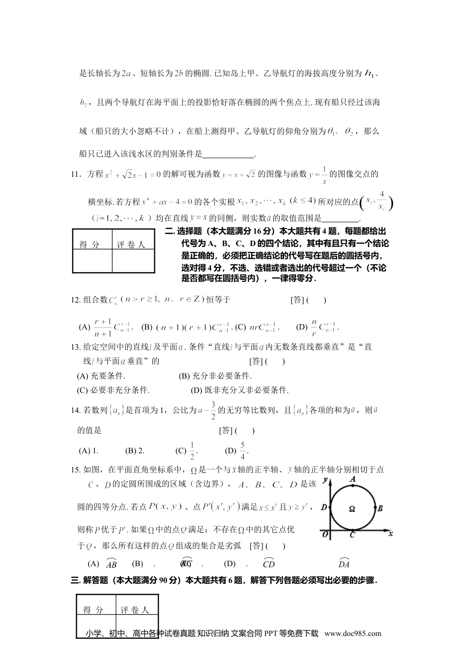 得分评卷人绝密★启用前2008年普通高等学校招生全国统一考试(上海卷)数学试卷(理工农医类)(满分150分,考试时间120分钟)考生注意1.本场考试时间120分钟,试卷共4页,满分150分,答题纸共2页.2.作答前,在答题纸正面填写姓名、准考证号,反面填写姓名,将核对后的条形码贴在答题纸指定位置.3.所有作答务必填涂或书写在答题纸上与试卷题号对应的区域,不得错位.在试卷上作答一律不得分.4.用2B铅笔作答选择题,用黑色字迹钢笔、水笔或圆珠笔作答非选择题.一.填空题(本大题满分44分)本大题共有11题,只要求直接填写结果,每个空格填对得4分,否则一律得零分.1.不等式的解集是.2.若集合、满足,则实数=_____________.3.若复数满足(是虚数单位),则=_____________.4.若函数的反函数为(),则.5.若向量、满足,,且与的夹角为,则=__________.6.函数的最大值是.7.在平面直角坐标系中,从六个点:、、、、、中任取三个,这三点能构成三角形的概率是(结果用分数表示).8.设函数是定义在上的奇函数.若当时,,则满足的的取值范围是.9.已知总体的各个体的值由小到大依次为2,3,3,7,,,12,13.7,18.3,20,且总体的中位数为.若要使该总体的方差最小,则的取值分别是.10.某海域内有一孤岛.岛四周的海平面(视为平面)上有一浅水区(含边界),其边界小学、初中、高中各种试卷真题知识归纳文案合同PPT等免费下载www.doc985.com得分评卷人得分评卷人是长轴长为、短轴长为的椭圆.已知岛上甲、乙导航灯的海拔高度分别为,且两个导航灯在海平面上的投影恰好落在椭圆的两个焦点上.现有船只经过该海域(船只的大小忽略不计),在船上测得甲、乙导航灯的仰角分别为,那么船只已进入该浅水区的判别条件是.11.方程的解可视为函数的图像与函数的图像交点的横坐标.若方程的各个实根所对应的点()(=)均在直线的同侧,则实数的取值范围是.二.选择题(本大题满分16分)本大题共有4题,每题都给出代号为A、B、C、D的四个结论,其中有且只有一个结论是正确的,必须把正确结论的代号写在题后的圆括号内,选对得4分,不选、选错或者选出的代号超过一个(不论是否都写在圆括号内),一律得零分.12.组合数恒等于[答]()(A).(B).(C).(D).13.给定空间中的直线及平面.条件“直线与平面内无数条直线都垂直”是“直线与平面垂直”的[答]()(A)充要条件.(B)充分非必要条件.(C)必要非充分条件.(D)既非充分又非必要条件.14.若数列是首项为1,公比为的无穷等比数列,且各项的和为,则的值是[答]()(A)1.(B)2.(C).(D).15.如图,在平面直角坐标系中,是一个与轴的正半轴、轴的正半轴分别相切于点、的定圆所围成的区域(含边界),是该圆的四等分点.若点、点满足且,则称优于.如果中的点满足:不存在中的其它点优于,那么所有这样的点组成的集合是劣弧[答]()(A).(B).(C).(D).三.解答题(本大题满分90分)本大题共有6题,解答下列各题必须写出必要的步骤.小学、初中、高中各种试卷真题知识归纳文案合同PPT等免费下载www.doc985.comABBCCDDA16.(本题满分12分)如图,在棱长为2的正方体中,的中点.求直线与平面所成角的大小(结果用反三角函数值表示).[解]小学、初中、高中各种试卷真题知识归纳文案合同PPT等免费下载www.doc985.com得分评卷人17.(本题满分13分)小学、初中、高中各种试卷真题知识归纳文案合同PPT等免费下载www.doc985.com得分评卷人如图,某住宅小区的平面图呈圆心角为的扇形.小区的两个出入口设置在点及点处,且小区里有一条平行于的小路.已知某人从沿走到用了10分钟,从沿走到用了6分钟.若此人步行的速度为每分钟50米,求该扇形的半径的长(精确到1米).[解]18.(本题满分15分)本题共有2个小题,第1小题满分6分,第2小题满分9分.小学、初中、高中各种试卷真题知识归纳文案合同PPT等免费下载www.doc985.com已知双曲线,是上的任意点.(1)求证:点到双曲线的两条渐近线的距离的乘积是一个常数;(2)设点的坐标为,求的最小值.[证明](1)[解](2)小学、初中、高中各种试卷真题知识归纳文案合同PPT等免费下载www.doc985.com得分评卷人19.(本题满分16分)本题共有2个小题,第1小题...