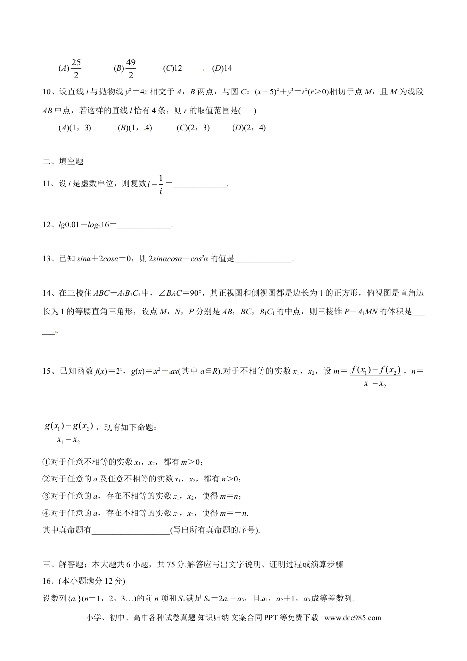 一、选择题1、设集合A={x|-1<x<2},集合B={x|1<x<3},则A∪B=()(A){x|-1<x<3}(B){x|-1<x<1}(C){x|1<x<2}(D){x|2<x<3}2、设向量a=(2,4)与向量b=(x,6)共线,则实数x=()(A)2(B)3(C)4(D)63、某学校为了了解三年级、六年级、九年级这三个年级之间的学生视力是否存在显著差异,拟从这三个年级中按人数比例抽取部分学生进行调查,则最合理的抽样方法是()(A)抽签法(B)系统抽样法(C)分层抽样法(D)随机数法4、设a,b为正实数,则“a>b>1”是“log2a>log2b>0”的()(A)充要条件(B)充分不必要条件(C)必要不充分条件(D)既不充分也不必要条件5、下列函数中,最小正周期为π的奇函数是()(A)y=sin(2x+2)(B)y=cos(2x+2)(C)y=sin2x+cos2x(D)y=sinx+cosx[来源:学。科。网]6、执行如图所示的程序框图,输出S的值为()小学、初中、高中各种试卷真题知识归纳文案合同PPT等免费下载www.doc985.com(A)-32(B)32(C)-12(D)127、过双曲线2213yx的右焦点且与x轴垂直的直线交该双曲线的两条渐近线于A、B两点,则|AB|=()(A)433(B)23(C)6(D)438、某食品的保鲜时间y(单位:小时)与储藏温度x(单位:℃)满足函数关系kxbye(2.718...e为自然对数的底数,,kb为常数).若该食品在0℃的保鲜时间是192小时,在22℃的保鲜时间是48小时,则该食品在33℃的保鲜时间是()(A)16小时(B)20小时(C)24小时(D)21小时9、设实数x,y满足2102146xyxyxy,则xy的最大值为()小学、初中、高中各种试卷真题知识归纳文案合同PPT等免费下载www.doc985.com(A)252(B)492(C)12(D)1410、设直线l与抛物线y2=4x相交于A,B两点,与圆C:(x-5)2+y2=r2(r>0)相切于点M,且M为线段AB中点,若这样的直线l恰有4条,则r的取值范围是()(A)(1,3)(B)(1,4)(C)(2,3)(D)(2,4)二、填空题11、设i是虚数单位,则复数1ii=_____________.12、lg0.01+log216=_____________.13、已知sinα+2cosα=0,则2sinαcosα-cos2α的值是______________.14、在三棱住ABC-A1B1C1中,∠BAC=90°,其正视图和侧视图都是边长为1的正方形,俯视图是直角边长为1的等腰直角三角形,设点M,N,P分别是AB,BC,B1C1的中点,则三棱锥P-A1MN的体积是______.15、已知函数f(x)=2x,g(x)=x2+ax(其中a∈R).对于不相等的实数x1,x2,设m=1212()()fxfxxx,n=1212()()gxgxxx,现有如下命题:①对于任意不相等的实数x1,x2,都有m>0;②对于任意的a及任意不相等的实数x1,x2,都有n>0;[来源:学&科&网]③对于任意的a,存在不相等的实数x1,x2,使得m=n;④对于任意的a,存在不相等的实数x1,x2,使得m=-n.其中真命题有___________________(写出所有真命题的序号).三、解答题:本大题共6小题,共75分.解答应写出文字说明、证明过程或演算步骤16.(本小题满分12分)设数列{an}(n=1,2,3…)的前n项和Sn满足Sn=2an-a3,且a1,a2+1,a3成等差数列.小学、初中、高中各种试卷真题知识归纳文案合同PPT等免费下载www.doc985.com(Ⅰ)求数列的通项公式;(Ⅱ)设数列1{}na的前n项和为Tn,求Tn.17、(本小题满分12分)一辆小客车上有5个座位,其座位号为1,2,3,4,5,乘客P1,P2,P3,P4,P5的座位号分别为1,2,3,4,5,他们按照座位号顺序先后上车,乘客P1因身体原因没有坐自己号座位,这时司机要求余下的乘客按以下规则就坐:如果自己的座位空着,就只能坐自己的座位.如果自己的座位已有乘客就坐,就在这5个座位的剩余空位中选择座位.(Ⅰ)若乘客P1坐到了3号座位,其他乘客按规则就座,则此时共有4种坐法.下表给出其中两种坐法,请填入余下两种坐法(将乘客就坐的座位号填入表中空格处)乘客P1P2P3P4P5座位号3[来源:学+科+网Z+X+X+K]21[来源:学§科§网Z§X§X§K]4[来源:学科网]532451(Ⅱ)若乘客P1坐到了2号座位,其他乘客按规则就坐,求乘客P1坐到5号座位的概率.18、(本小题满分12分)一个正方体的平面展开图及该正方体的直观图的示意图如图所示.(Ⅰ)请按字母F,G,H标记在正方体相应地顶点处(不需要说明理由)(Ⅱ)判断平面BEG与平面ACH的位置关系.并说明你的结论.(Ⅲ)证明:直线DF平面BEG19、(本...