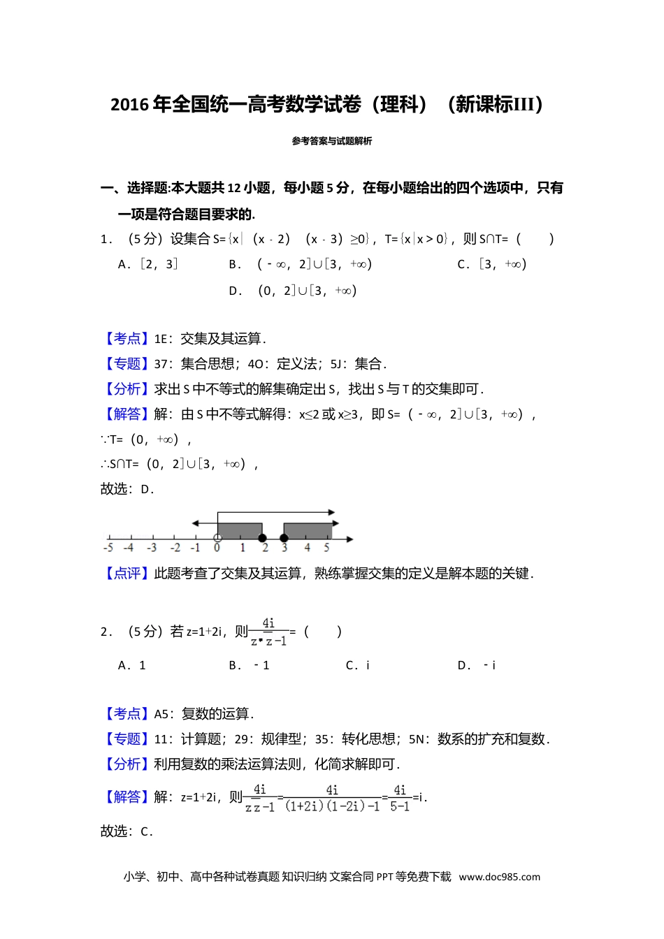 2016Ⅲ年全国统一高考数学试卷(理科)(新课标)参考答案与试题解析一、选择题:本大题共12小题,每小题5分,在每小题给出的四个选项中,只有一项是符合题目要求的.1.(5分)设集合S={x|(x2﹣)(x3﹣)≥0},T={x|x>0},则S∩T=()A.[2,3]B.(﹣∞,2]∪[3,+∞)C.[3,+∞)D.(0,2]∪[3,+∞)【考点】1E:交集及其运算.菁优网版权所有【专题】37:集合思想;4O:定义法;5J:集合.【分析】求出S中不等式的解集确定出S,找出S与T的交集即可.【解答】解:由S中不等式解得:x≤2或x≥3,即S=(﹣∞,2]∪[3,+∞), T=(0,+∞),∴S∩T=(0,2]∪[3,+∞),故选:D.【点评】此题考查了交集及其运算,熟练掌握交集的定义是解本题的关键.2.(5分)若z=1+2i,则=()A.1B.﹣1C.iD.﹣i【考点】A5:复数的运算.菁优网版权所有【专题】11:计算题;29:规律型;35:转化思想;5N:数系的扩充和复数.【分析】利用复数的乘法运算法则,化简求解即可.【解答】解:z=1+2i,则===i.故选:C.小学、初中、高中各种试卷真题知识归纳文案合同PPT等免费下载www.doc985.com【点评】本题考查复数的代数形式混合运算,考查计算能力.3.(5分)已知向量=(,),=(,),则∠ABC=()A.30°B.45°C.60°D.120°【考点】9S:数量积表示两个向量的夹角.菁优网版权所有【专题】11:计算题;41:向量法;49:综合法;5A:平面向量及应用.【分析】根据向量的坐标便可求出,及的值,从而根据向量夹角余弦公式即可求出cos∠ABC的值,根据∠ABC的范围便可得出∠ABC的值.【解答】解:,;∴;又0°≤∠ABC≤180°;∴∠ABC=30°.故选:A.【点评】考查向量数量积的坐标运算,根据向量坐标求向量长度的方法,以及向量夹角的余弦公式,向量夹角的范围,已知三角函数值求角.4.(5分)某旅游城市为向游客介绍本地的气温情况,绘制了一年中各月平均最高气温和平均最低气温的雷达图,图中A点表示十月的平均最高气温约为15℃,B点表示四月的平均最低气温约为5℃,下面叙述不正确的是()小学、初中、高中各种试卷真题知识归纳文案合同PPT等免费下载www.doc985.comA.各月的平均最低气温都在0℃以上B.七月的平均温差比一月的平均温差大C.三月和十一月的平均最高气温基本相同D.平均最高气温高于20℃的月份有5个【考点】F4:进行简单的合情推理.菁优网版权所有【专题】31:数形结合;4A:数学模型法;5M:推理和证明.【分析】根据平均最高气温和平均最低气温的雷达图进行推理判断即可.【解答】解:A.由雷达图知各月的平均最低气温都在0℃以上,正确B.七月的平均温差大约在10°左右,一月的平均温差在5°左右,故七月的平均温差比一月的平均温差大,正确C.三月和十一月的平均最高气温基本相同,都为10°,正确D.平均最高气温高于20℃的月份有7,8两个月,故D错误,故选:D.【点评】本题主要考查推理和证明的应用,根据平均最高气温和平均最低气温的雷达图,利用图象法进行判断是解决本题的关键.5.(5分)若tanα=,则cos2α+2sin2α=()A.B.C.1D.小学、初中、高中各种试卷真题知识归纳文案合同PPT等免费下载www.doc985.com【考点】GF:三角函数的恒等变换及化简求值.菁优网版权所有【专题】11:计算题;35:转化思想;4R:转化法;56:三角函数的求值.【分析】“将所求的关系式的分母1”化为(cos2α+sin2α“”“”),再将弦化切即可得到答案.【解答】解: tanα=,∴cos2α+2sin2α====.故选:A.【点评】“”“”本题考查三角函数的化简求值,弦化切是关键,是基础题.6.(5分)已知a=,b=,c=,则()A.b<a<cB.a<b<cC.b<c<aD.c<a<b【考点】4Y:幂函数的单调性、奇偶性及其应用.菁优网版权所有【专题】35:转化思想;4R:转化法;51:函数的性质及应用.【分析】b==,c==,结合幂函数的单调性,可比较a,b,c,进而得到答案.【解答】解: a==,b=,c==,综上可得:b<a<c,故选:A.【点评】本题考查的知识点是指数函数的单调性,幂函数的单调性,是函数图象和性质的综合应用,难度中档.小学、初中、高中各种试卷真题知识归纳文案...