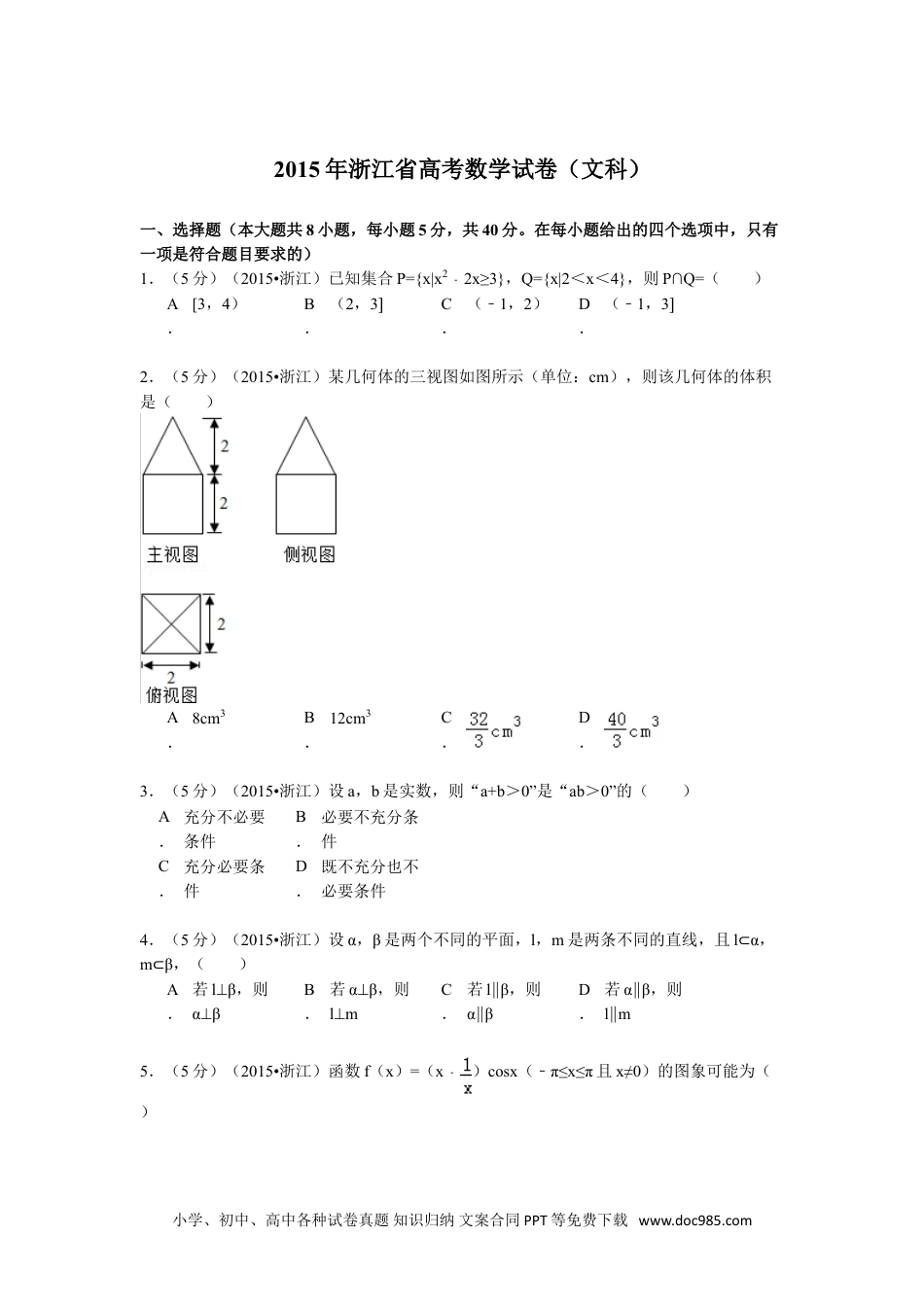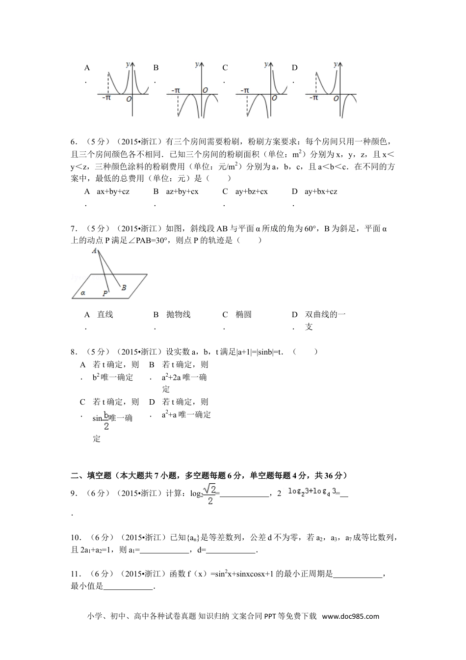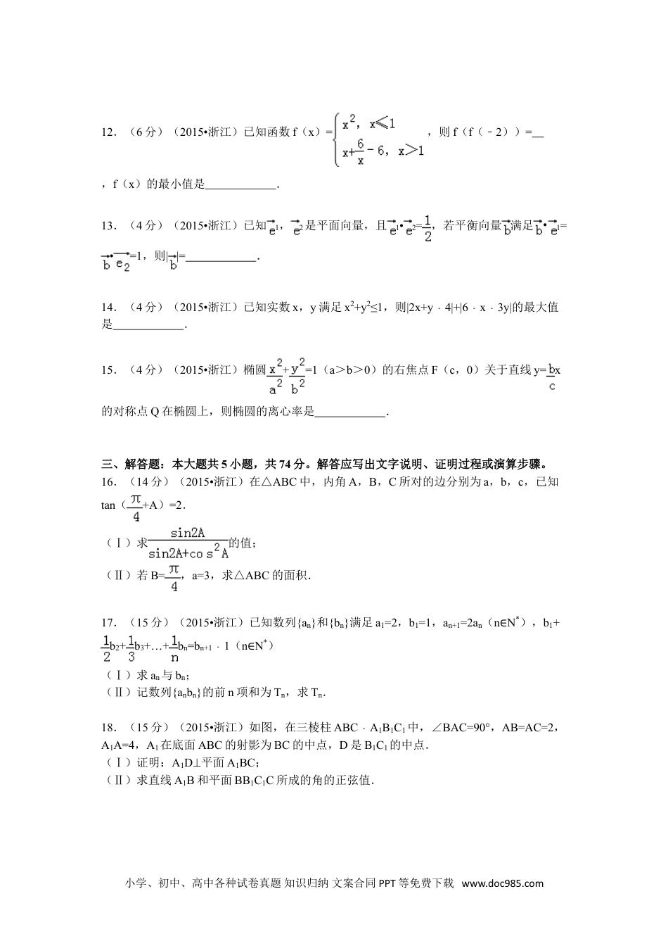 2015年浙江省高考数学试卷(文科)一、选择题(本大题共8小题,每小题5分,共40分。在每小题给出的四个选项中,只有一项是符合题目要求的)1.(5分)(2015•浙江)已知集合P={x|x22x≥3}﹣,Q={x|2<x<4},则P∩Q=()A.[3,4)B.(2,3]C.(﹣1,2)D.(﹣1,3]2.(5分)(2015•浙江)某几何体的三视图如图所示(单位:cm),则该几何体的体积是()A.8cm3B.12cm3C.D.3.(5分)(2015•浙江)设a,b是实数,则“a+b>0”是“ab>0”的()A.充分不必要条件B.必要不充分条件C.充分必要条件D.既不充分也不必要条件4.(5分)(2015•浙江)设α,β是两个不同的平面,l,m是两条不同的直线,且l⊂α,m⊂β,()A.若lβ⊥,则αβ⊥B.若αβ⊥,则lm⊥C.若lβ∥,则αβ∥D.若αβ∥,则lm∥5.(5分)(2015•浙江)函数f(x)=(x﹣)cosx(﹣π≤x≤π且x≠0)的图象可能为()小学、初中、高中各种试卷真题知识归纳文案合同PPT等免费下载www.doc985.comA.B.C.D.6.(5分)(2015•浙江)有三个房间需要粉刷,粉刷方案要求:每个房间只用一种颜色,且三个房间颜色各不相同.已知三个房间的粉刷面积(单位:m2)分别为x,y,z,且x<y<z,三种颜色涂料的粉刷费用(单位:元/m2)分别为a,b,c,且a<b<c.在不同的方案中,最低的总费用(单位:元)是()A.ax+by+czB.az+by+cxC.ay+bz+cxD.ay+bx+cz7.(5分)(2015•浙江)如图,斜线段AB与平面α所成的角为60°,B为斜足,平面α上的动点P满足∠PAB=30°,则点P的轨迹是()A.直线B.抛物线C.椭圆D.双曲线的一支8.(5分)(2015•浙江)设实数a,b,t满足|a+1|=|sinb|=t.()A.若t确定,则b2唯一确定B.若t确定,则a2+2a唯一确定C.若t确定,则sin唯一确定D.若t确定,则a2+a唯一确定二、填空题(本大题共7小题,多空题每题6分,单空题每题4分,共36分)9.(6分)(2015•浙江)计算:log2=,2=.10.(6分)(2015•浙江)已知{an}是等差数列,公差d不为零,若a2,a3,a7成等比数列,且2a1+a2=1,则a1=,d=.11.(6分)(2015•浙江)函数f(x)=sin2x+sinxcosx+1的最小正周期是,最小值是.小学、初中、高中各种试卷真题知识归纳文案合同PPT等免费下载www.doc985.com12.(6分)(2015•浙江)已知函数f(x)=,则f(f(﹣2))=,f(x)的最小值是.13.(4分)(2015•浙江)已知1,2是平面向量,且1•2=,若平衡向量满足•1=•=1,则||=.14.(4分)(2015•浙江)已知实数x,y满足x2+y2≤1,则|2x+y4|+|6x3y|﹣﹣﹣的最大值是.15.(4分)(2015•浙江)椭圆+=1(a>b>0)的右焦点F(c,0)关于直线y=x的对称点Q在椭圆上,则椭圆的离心率是.三、解答题:本大题共5小题,共74分。解答应写出文字说明、证明过程或演算步骤。16.(14分)(2015•浙江)在△ABC中,内角A,B,C所对的边分别为a,b,c,已知tan(+A)=2.(Ⅰ)求的值;(Ⅱ)若B=,a=3,求△ABC的面积.17.(15分)(2015•浙江)已知数列{an}和{bn}满足a1=2,b1=1,an+1=2an(n∈N*),b1+b2+b3+…+bn=bn+11﹣(n∈N*)(Ⅰ)求an与bn;(Ⅱ)记数列{anbn}的前n项和为Tn,求Tn.18.(15分)(2015•浙江)如图,在三棱柱ABCA﹣1B1C1中,∠BAC=90°,AB=AC=2,A1A=4,A1在底面ABC的射影为BC的中点,D是B1C1的中点.(Ⅰ)证明:A1D⊥平面A1BC;(Ⅱ)求直线A1B和平面BB1C1C所成的角的正弦值.小学、初中、高中各种试卷真题知识归纳文案合同PPT等免费下载www.doc985.com19.(15分)(2015•浙江)如图,已知抛物线C1:y=x2,圆C2:x2+(y1﹣)2=1,过点P(t,0)(t>0)作不过原点O的直线PA,PB分别与抛物线C1和圆C2相切,A,B为切点.(Ⅰ)求点A,B的坐标;(Ⅱ)求△PAB的面积.注:直线与抛物线有且只有一个公共点,且与抛物线的对称轴不平行,则称该直线与抛物线相切,称该公共点为切点.20.(15分)(2015•浙江)设函数f(x)=x2+ax+b(a,b∈R).(Ⅰ)当b=+1时,求函数f(x)在[1﹣,1]上的最小值g(a)的表达式.(Ⅱ)已知函数f(x)在[1﹣,1]上存在零点,0≤b2a≤1﹣,求b的取值范围.小学、初中、高中各种试卷真题知识归纳文案合同PPT等免费下载www.doc985.com