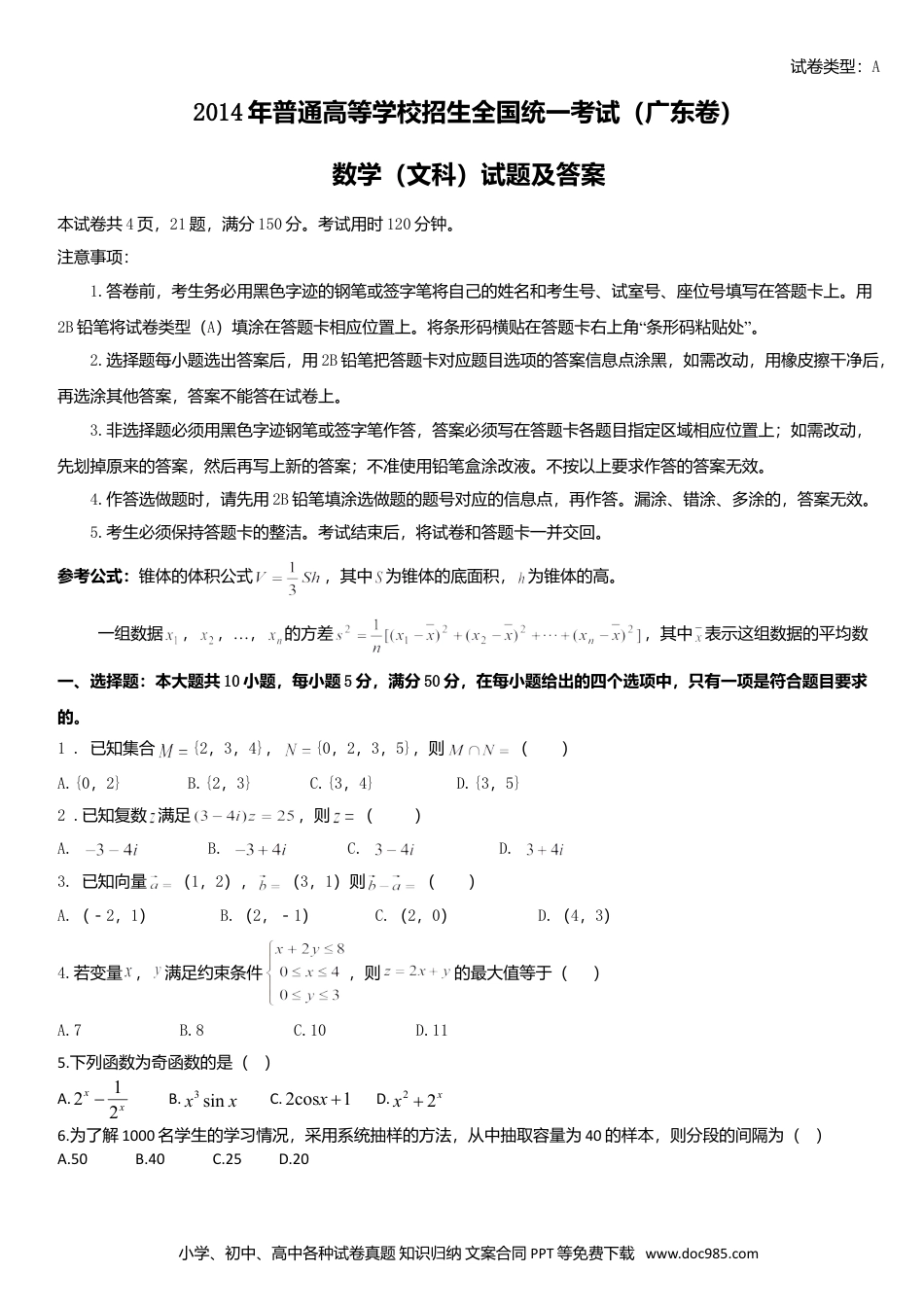 试卷类型:A2014年普通高等学校招生全国统一考试(广东卷)数学(文科)试题及答案本试卷共4页,21题,满分150分。考试用时120分钟。注意事项:1.答卷前,考生务必用黑色字迹的钢笔或签字笔将自己的姓名和考生号、试室号、座位号填写在答题卡上。用2B铅笔将试卷类型(A“”)填涂在答题卡相应位置上。将条形码横贴在答题卡右上角条形码粘贴处。2.选择题每小题选出答案后,用2B铅笔把答题卡对应题目选项的答案信息点涂黑,如需改动,用橡皮擦干净后,再选涂其他答案,答案不能答在试卷上。3.非选择题必须用黑色字迹钢笔或签字笔作答,答案必须写在答题卡各题目指定区域相应位置上;如需改动,先划掉原来的答案,然后再写上新的答案;不准使用铅笔盒涂改液。不按以上要求作答的答案无效。4.作答选做题时,请先用2B铅笔填涂选做题的题号对应的信息点,再作答。漏涂、错涂、多涂的,答案无效。5.考生必须保持答题卡的整洁。考试结束后,将试卷和答题卡一并交回。参考公式:锥体的体积公式,其中为锥体的底面积,为锥体的高。一组数据,…,,的方差,其中表示这组数据的平均数一、选择题:本大题共10小题,每小题5分,满分50分,在每小题给出的四个选项中,只有一项是符合题目要求的。1.已知集合{2,3,4},{0,2,3,5},则()A.{0,2}B.{2,3}C.{3,4}D.{3,5}2.已知复数满足,则()A.B.C.D.3.已知向量(1,2),(3,1)则()A.(-2,1)B.(2,-1)C.(2,0)D.(4,3)4.若变量,满足约束条件,则的最大值等于()A.7B.8C.10D.115.下列函数为奇函数的是()A.xx212B.xxsin3C.1cos2xD.xx226.为了解1000名学生的学习情况,采用系统抽样的方法,从中抽取容量为40的样本,则分段的间隔为()A.50B.40C.25D.20小学、初中、高中各种试卷真题知识归纳文案合同PPT等免费下载www.doc985.com7.在ABC中,角A,B,C所对应的边分别为,,,cba“则ba”“是BAsinsin”的()A.充分必要条件B.充分非必要条件C.必要非充分条件D.非充分非必要条件8.若实数k满足05k,则曲线221165xyk与曲线221165xyk的()A.实半轴长相等B.虚半轴长相等C.离心率相等D.焦距相等9.若空间中四条两两不同的直线1234,,,llll,满足122334,,,llllll∥则下列结论一定正确的是()A.14llB.14ll∥C.1l与4l既不垂直也不平行D.1l与4l的位置关系不确定10.对任意复数12,,ww定义1212,其中2是2的共轭复数,对任意复数123,,zzz有如下四个命题:①1231323()()();zzzzzzz②1231213()()()zzzzzzz;③123123()();zzzzzz④1221zzzz;则真命题的个数是()A.1B.2C.3D.4二、填空题:本大题共5小题,考生作答4小题,每小题5分,满分20分。(一)必做题(11-13题)11.曲线在点(0,-2)处的切线方程为.12.从字母,,,,abcde中任取两个不同字母,则取字母a的概率为________.13.等比数列na的各项均为正数,且154aa,则2122232425log+log+log+log+log=aaaaa________.(二)选做题(14-15题,考生只能从中选做一题)14,(坐标系与参数方程选做题)在极坐标系中,曲线C1和C2的方程分别为和,以极点为平面直角坐标系的原点,极轴为轴的正半轴,建立直角坐标系,则曲线C1与C2交点的直角坐标为_______。15.(几何证明选讲选做题)如图1,在平行四边形中,点在上,且,与交于点,则_____________。三.解答题。本大题共6小题,满分80分。解答需写出文字说明、证明过程和演算步骤。16.(本小题满分12分)已知函数,,且。(1)求的值;(2)若,(0,),求。小学、初中、高中各种试卷真题知识归纳文案合同PPT等免费下载www.doc985.comABCDE图1F17.(本小题满分13分)某车间20名工人年龄数据如下表:(1)求这20名工人年龄的众数与极差;(2)以十位数为茎,个位数为叶,作出这20名工人年龄的茎叶图;(3)求这20名工人年龄的方差.学科网18.(本小题满分13分)如图2,四边形ABCD为矩形,PD⊥平面ABCD,AB=1,BC=PC=2,作如图3折叠,折痕EF∥DC.其中点E,F分别在线段PD,PC上,沿EF折叠后点P在线段AD上的点记为M,并且MF⊥CF.(1)证明:CF⊥平面MDF(2)...