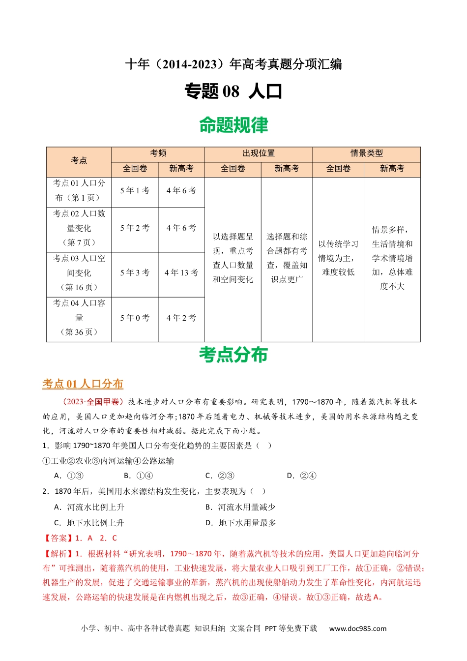 小学、初中、高中各种试卷真题知识归纳文案合同PPT等免费下载www.doc985.com十年(2014-2023)年高考真题分项汇编专题08人口命题规律考点考频出现位置情景类型全国卷新高考全国卷新高考全国卷新高考考点01人口分布(第1页)5年1考4年6考以选择题呈现,重点考查人口数量和空间变化选择题和综合题都有考查,覆盖知识点更广以传统学习情境为主,难度较低情景多样,生活情境和学术情境增加,总体难度不大考点02人口数量变化(第7页)5年2考4年6考考点03人口空间变化(第16页)5年3考4年13考考点04人口容量(第36页)5年0考4年2考考点分布考点01人口分布(2023·全国甲卷)技术进步对人口分布有重要影响。研究表明,1790~1870年,随着蒸汽机等技术的应用,美国人口更加趋向临河分布;1870年后随着电力、机械等技术进步,美国的用水来源结构随之变化,河流对人口分布的重要性相对减弱。据此完成下面小题。1.影响1790~1870年美国人口分布变化趋势的主要因素是()①工业②农业③内河运输④公路运输A.①③B.①④C.②③D.②④2.1870年后,美国用水来源结构发生变化,主要表现为()A.河流水比例上升B.河流水用量减少C.地下水比例上升D.地下水用量最多【答案】1.A2.C【解析】1.根据材料“研究表明,1790~1870年,随着蒸汽机等技术的应用,美国人口更加趋向临河分布”可推测出,随着蒸汽机的使用,工业快速发展,将大量农业人口吸引到工厂工作,故①正确,②错误;机器生产的发展,促进了交通运输事业的革新,蒸汽机的出现使船舶动力发生了革命性变化,内河航运迅速发展,公路运输的快速发展是在内燃机出现之后,故③正确,④错误。故①③正确,故选A。小学、初中、高中各种试卷真题知识归纳文案合同PPT等免费下载www.doc985.com2.1870年后,随着人口大规模西移和工业化、城镇化的发展,美国大量开发利用地下水,地下水比例上升,C正确;由材料“河流对人口分布的重要性相对减弱”可知,河流水比例下降,故A错误;比例下降不代表用水量下降,地下水使用量相对有限,其比例上升并不表示用量最多,故B、D错误。故选C。(2023·海南卷)由中国承建运营的蒙内(蒙巴萨至内罗毕)铁路是肯尼亚在近100年间建设的第一条铁路。在铁路建设过程中,为当地创造了约4.6万个工作岗位,对肯尼亚国内生产总值的贡献超过1.5%。图为非洲部分区域图。据此完成下面小题。3.从铁路布局推测图示区域铁路建设的主要目的是()A.方便农矿产品输出B.加速区域城市化C.加强人员对外交流D.完善区域铁路网4.蒙内铁路在建设期间对肯尼亚产生的直接影响是()A.促进人口向外流动B.缩小南北地区差距C.改善区域生态环境D.带动社会经济发展5.肯尼亚西南部高原比沿海平原更适宜人类居住的主要原因是()A.海拔较高,气候适宜B.资源丰富,就业机会更多C.黑土广布,作物产量高D.交通便利,对外贸易发达【答案】3.A4.D5.A【解析】3.图示区域铁路大部分连接内陆矿区和沿海港口,因此图示区域铁路建设的主要目的是方便农矿产品输出,而不是加速区域城市化、加强人员对外交流、完善区域铁路网,A正确,BCD错误,故选A。4.蒙内铁路在建设期间为当地创造了约4.6万个工作岗位,对肯尼亚国内生产总值的贡献超过1.5%,带动了社会经济发展,D正确;促进人口向外流动及缩小南北地区差距是铁路建成通车后带来的影响,AB错误;铁路建设可能会对生态环境造成一定的破坏,C错误。故选D。5.肯尼亚位于赤道附近地区,气候湿热,海拔较高的高原气候较为凉爽,更适合人类居住,A正确;读图可知,沿海平原也有矿产资源较丰富的地区,B错误;肯尼亚西南部高原无黑土分布,C错误;沿海地区交通更为便利,D错误。故选A。(2023·浙江卷)中亚是“丝绸之路经济带”的重要节点。近年来经济发展迅速,人口增长明显,但人口分布的空间格局基本不变。下面为中亚五国地形及各国人口、面积柱状图。完成下面小题。小学、初中、高中各种试卷真题知识归纳文案合同PPT等免费下载www.doc985.com6.下列中亚国家中,人口密度最小的是()A.土库曼斯坦B.哈萨克斯坦C.吉尔吉斯斯坦D.塔吉克斯坦7.影响中亚东南部地区人口较密集的...
