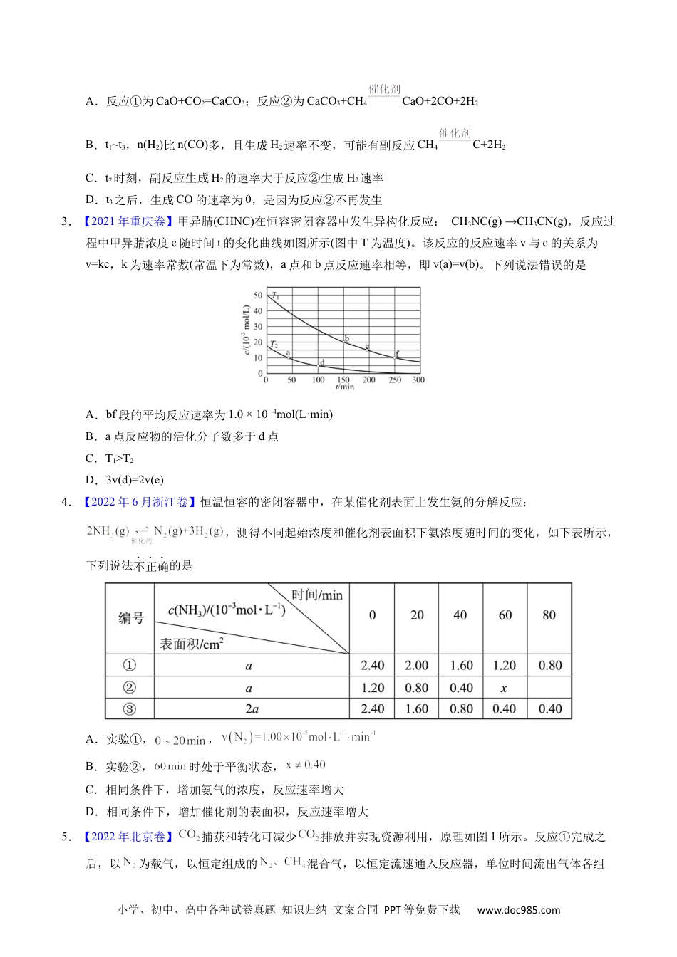 小学、初中、高中各种试卷真题知识归纳文案合同PPT等免费下载www.doc985.com1.【2023年山东卷】一定条件下,化合物E和TFAA合成H的反应路径如下:已知反应初始E的浓度为0.10mol∙L-1,TFAA的浓度为0.08mol∙L-1,部分物种的浓度随时间的变化关系如图所示,忽略反应过程中的体积变化。下列说法正确的是A.t1时刻,体系中有E存在B.t2时刻,体系中无F存在C.E和TFAA反应生成F的活化能很小D.反应达平衡后,TFAA的浓度为0.08mol∙L-12.【2022年北京卷】CO2捕获和转化可减少CO2排放并实现资源利用,原理如图1所示。反应①完成之后,以N2为载气,以恒定组成的N2、CH4混合气,以恒定流速通入反应器,单位时间流出气体各组分的物质的量随反应时间变化如图2所示。反应过程中始终未检测到CO2,在催化剂上有积碳。下列说法不正确的是专题52化反速率学应小学、初中、高中各种试卷真题知识归纳文案合同PPT等免费下载www.doc985.comA.反应①为CaO+CO2=CaCO3;反应②为CaCO3+CH4CaO+2CO+2H2B.t1~t3,n(H2)比n(CO)多,且生成H2速率不变,可能有副反应CH4C+2H2C.t2时刻,副反应生成H2的速率大于反应②生成H2速率D.t3之后,生成CO的速率为0,是因为反应②不再发生3.【2021年重庆卷】甲异腈(CHNC)在恒容密闭容器中发生异构化反应:CH3NC(g)→CH3CN(g),反应过程中甲异腈浓度c随时间t的变化曲线如图所示(图中T为温度)。该反应的反应速率v与c的关系为v=kc,k为速率常数(常温下为常数),a点和b点反应速率相等,即v(a)=v(b)。下列说法错误的是A.bf段的平均反应速率为1.0×10-4mol(L·min)B.a点反应物的活化分子数多于d点C.T1>T2D.3v(d)=2v(e)4.【2022年6月浙江卷】恒温恒容的密闭容器中,在某催化剂表面上发生氨的分解反应:,测得不同起始浓度和催化剂表面积下氨浓度随时间的变化,如下表所示,下列说法不正确的是A.实验①,,B.实验②,时处于平衡状态,C.相同条件下,增加氨气的浓度,反应速率增大D.相同条件下,增加催化剂的表面积,反应速率增大5.【2022年北京卷】捕获和转化可减少排放并实现资源利用,原理如图1所示。反应①完成之后,以为载气,以恒定组成的混合气,以恒定流速通入反应器,单位时间流出气体各组小学、初中、高中各种试卷真题知识归纳文案合同PPT等免费下载www.doc985.com分的物质的量随反应时间变化如图2所示。反应过程中始终未检测到,在催化剂上有积碳。下列说法不正确的是A.反应①为;反应②为B.,比多,且生成速率不变,可能有副反应C.时刻,副反应生成的速率大于反应②生成速率D.之后,生成的速率为0,是因为反应②不再发生6.(2021.6·浙江真题)一定温度下:在的四氯化碳溶液()中发生分解反应:。在不同时刻测量放出的体积,换算成浓度如下表:0600120017102222820x1.40.960.660.480.350.240.12下列说法正确的是A.,生成的平均速率为B.反应时,放出的体积为(标准状况)C.反应达到平衡时,D.推测上表中的x为39307.(2021.1·浙江真题)取50mL过氧化氢水溶液,在少量I-存在下分解:2H2O2=2H2O+O2↑。在一定温度下,测得O2的放出量,转换成H2O2浓度(c)如下表:t/min020406080c/(mol·L-1)0.800.400.200.100.050下列说法不正确的是小学、初中、高中各种试卷真题知识归纳文案合同PPT等免费下载www.doc985.comA.反应20min时,测得O2体积为224mL(标准状况)B.20~40min,消耗H2O2的平均速率为0.010mol·L-1·min-1C.第30min时的瞬时速率小于第50min时的瞬时速率D.H2O2分解酶或Fe2O3代替I-也可以催化H2O2分解8.(2019·浙江高考真题)高温高压液态水具有接近常温下弱酸的c(H+)或弱碱的c(OH−),油脂在其中能以较快的反应速率水解。与常温常压水相比,下列说法不正确的是A.高温高压液态水中,体系温度升高,油脂水解反应速率加快B.高温高压液态水中,油脂与水的互溶能力增强,油脂水解反应速率加快C.高温高压液态水中,c(H+)增大,可催化油脂水解反应,且产生的酸进一步催化水解D.高温高压液态水中的油脂水解,相当于常温下在体系中加入了相同c(H+)的酸或相同c(OH−)的碱的水解9.(2018·浙江高考真题)某工业流程中,进入反应塔的混合气体中NO和O...
