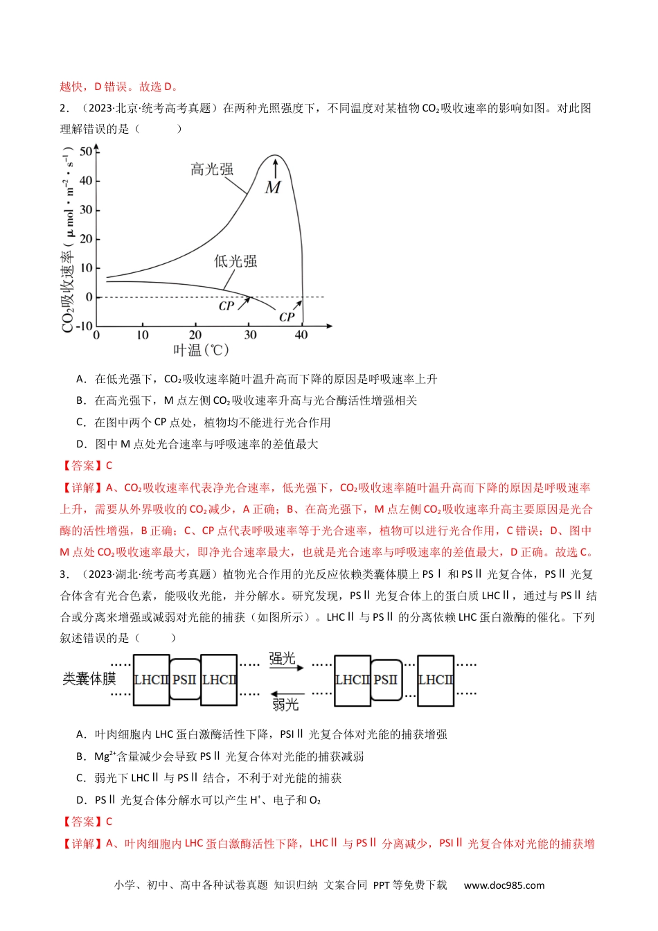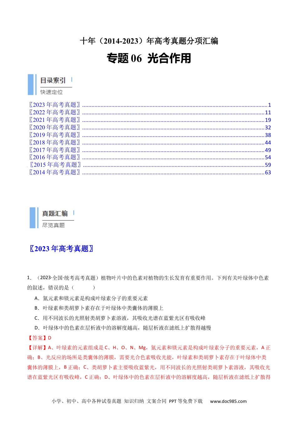 小学、初中、高中各种试卷真题知识归纳文案合同PPT等免费下载www.doc985.com十年(2014-2023)年高考真题分项汇编专题06光合作用〖2023年高考真题〗.........................................................................................................................1〖2022年高考真题〗.......................................................................................................................11〖2021年高考真题〗.......................................................................................................................19〖2020年高考真题〗.......................................................................................................................32〖2019年高考真题〗.......................................................................................................................38〖2018年高考真题〗.......................................................................................................................44〖2017年高考真题〗.......................................................................................................................49〖2016年高考真题〗.......................................................................................................................54〖2015年高考真题〗.......................................................................................................................59〖2014年高考真题〗.......................................................................................................................63〖2023年高考真题〗1.(2023·全国·统考高考真题)植物叶片中的色素对植物的生长发育有重要作用。下列有关叶绿体中色素的叙述,错误的是()A.氮元素和镁元素是构成叶绿素分子的重要元素B.叶绿素和类胡萝卜素存在于叶绿体中类囊体的薄膜上C.用不同波长的光照射类胡萝卜素溶液,其吸收光谱在蓝紫光区有吸收峰D.叶绿体中的色素在层析液中的溶解度越高,随层析液在滤纸上扩散得越慢【答案】D【详解】A、叶绿素的元素组成是C、H、O、N、Mg,氮元素和镁元素是构成叶绿素分子的重要元素,A正确;B、光反应的场所是类囊体的薄膜,需要光合色素吸收光能,叶绿素和类胡萝卜素存在于叶绿体中类囊体的薄膜上,B正确;C、类胡萝卜素主要吸收蓝紫光,用不同波长的光照射类胡萝卜素溶液,其吸收光谱在蓝紫光区有吸收峰,C正确;D、叶绿体中的色素在层析液中的溶解度越高,随层析液在滤纸上扩散得小学、初中、高中各种试卷真题知识归纳文案合同PPT等免费下载www.doc985.com越快,D错误。故选D。2.(2023·北京·统考高考真题)在两种光照强度下,不同温度对某植物CO2吸收速率的影响如图。对此图理解错误的是()A.在低光强下,CO2吸收速率随叶温升高而下降的原因是呼吸速率上升B.在高光强下,M点左侧CO2吸收速率升高与光合酶活性增强相关C.在图中两个CP点处,植物均不能进行光合作用D.图中M点处光合速率与呼吸速率的差值最大【答案】C【详解】A、CO2吸收速率代表净光合速率,低光强下,CO2吸收速率随叶温升高而下降的原因是呼吸速率上升,需要从外界吸收的CO2减少,A正确;B、在高光强下,M点左侧CO2吸收速率升高主要原因是光合酶的活性增强,B正确;C、CP点代表呼吸速率等于光合速率,植物可以进行光合作用,C错误;D、图中M点处CO2吸收速率最大,即净光合速率最大,也就是光合速率与呼吸速率的差值最大,D正确。故选C。3.(2023·湖北·统考高考真题)植物光合作用的光反应依赖类囊体膜上PSⅠ和PSⅡ光复合体,PSⅡ光复合体含有光合色素,能吸收光能,并分解水。研究发现,PSⅡ光复合体上的蛋白质LHCⅡ,通过与PSⅡ结合或分离来增强或减弱对光能的捕获(如图所示)。LHCⅡ与PSⅡ的分离依赖LHC蛋白激酶的催化。下列叙述错误的是()A.叶肉细胞内LHC蛋白激酶活...