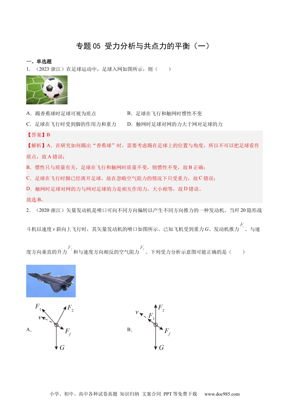 小学、初中、高中各种试卷真题知识归纳文案合同PPT等免费下载www.doc985.com专题05受力分析与共点力的平衡(一)一、单选题1.(2023·浙江)在足球运动中,足球入网如图所示,则()A.踢香蕉球时足球可视为质点B.足球在飞行和触网时惯性不变C.足球在飞行时受到脚的作用力和重力D.触网时足球对网的力大于网对足球的力【答案】B【解析】A.在研究如何踢出“香蕉球”时,需要考虑踢在足球上的位置与角度,所以不可以把足球看作质点,故A错误;B.惯性只与质量有关,足球在飞行和触网时质量不变,则惯性不变,故B正确;C.足球在飞行时脚已经离开足球,故在忽略空气阻力的情况下只受重力,故C错误;D.触网时足球对网的力与网对足球的力是相互作用力,大小相等,故D错误。故选B。2.(2020·浙江)矢量发动机是喷口可向不同方向偏转以产生不同方向推力的一种发动机。当歼20隐形战斗机以速度v斜向上飞行时,其矢量发动机的喷口如图所示。已知飞机受到重力G、发动机推力、与速度方向垂直的升力和与速度方向相反的空气阻力。下列受力分析示意图可能正确的是()A.B.小学、初中、高中各种试卷真题知识归纳文案合同PPT等免费下载www.doc985.comC.D.【答案】A【解析】由题意可知所受重力G竖直向下,空气阻力Ff与速度方向相反,升力F2与速度方向垂直,发动机推力F1的方向沿喷口的反方向,对比图中选项可知只有A选项符合题意。故选A。3.(2017·浙江)中国女排在2016年奥运会比赛中再度夺冠.图为比赛中精彩瞬间的照片,此时排球受到的力有()A.推力B.重力、推力C.重力、空气对球的作用力D.重力、推力、空气对球的作用力【答案】C【解析】图中排球受到的力是:重力、空气对球的阻力,此刻人手与球并没有接触,所以没有推力,故C正确,ABD均错误.故选C.4.(2023·山东)餐厅暖盘车的储盘装置示意图如图所示,三根完全相同的弹簧等间距竖直悬挂在水平固定圆环上,下端连接托盘。托盘上叠放若干相同的盘子,取走一个盘子,稳定后余下的正好升高补平。已知单个盘子的质量为300g,相邻两盘间距1.0cm,重力加速度大小取10m/s2。弹簧始终在弹性限度内,每根弹簧的劲度系数为()小学、初中、高中各种试卷真题知识归纳文案合同PPT等免费下载www.doc985.comA.10N/mB.100N/mC.200N/mD.300N/m【答案】B【解析】由题知,取走一个盘子,稳定后余下的正好升高补平,则说明一个盘子的重力可以使弹簧形变相邻两盘间距,则有mg=3∙kx解得k=100N/m故选B。5.(2023·浙江)如图所示,水平面上固定两排平行的半圆柱体,重为G的光滑圆柱体静置其上,a、b为相切点,,半径Ob与重力的夹角为37°。已知,,则圆柱体受到的支持力Fa、Fb大小为()A.,B.,C.,D.,【答案】D【解析】对光滑圆柱体受力分析如图由题意有小学、初中、高中各种试卷真题知识归纳文案合同PPT等免费下载www.doc985.com故选D。6.(2023·江苏)如图所示,“嫦娥五号”探测器静止在月球平坦表面处。已知探测器质量为m,四条腿与竖直方向的夹角均为θ,月球表面的重力加速度为地球表面重力加速度g的。每条腿对月球表面压力的大小为()A.B.C.D.【答案】D【解析】对“嫦娥五号”探测器受力分析有FN=mg月则对一条腿有根据牛顿第三定律可知每条腿对月球表面的压力为。故选D。7.(2023·浙江)如图所示,轻质网兜兜住重力为G的足球,用轻绳挂于光滑竖直墙壁上的A点,轻绳的拉力为,墙壁对足球的支持力为,则()小学、初中、高中各种试卷真题知识归纳文案合同PPT等免费下载www.doc985.comA.B.C.D.【答案】C【解析】对网兜和足球受力分析,设轻绳与竖直墙面夹角为θ,由平衡条件可知,故选C。8.(2022·重庆)如图所示,吸附在竖直玻璃上质量为m的擦窗工具,在竖直平面内受重力、拉力和摩擦力(图中未画出摩擦力)的共同作用做匀速直线运动。若拉力大小与重力大小相等,方向水平向右,重力加速度为g,则擦窗工具所受摩擦力()A.大小等于B.大小等于C.方向竖直向上D.方向水平向左【答案】B【解析】对擦窗工具进行正视图的受力分析如图所示小学、初中、高中各种试卷真题知识归纳文案合同PPT等免费下载www.doc985.co...