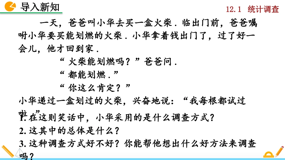 12.1统计调查(第2课时)人教版数学七年级下册12.1统计调查你知道其中蕴涵的道理吗?品尝一勺汤如何知道一锅汤的味道?根据这个道理,小华买火柴时怎么做才合理?导入新知12.1统计调查一天,爸爸叫小华去买一盒火柴.临出门前,爸爸嘱咐小华要买能划燃的火柴.小华拿着钱出门了,过了好一会儿,他才回到家.“火柴能划燃吗?”爸爸问.“都能划燃.”“你这么肯定?”小华递过一盒划过的火柴,兴奋地说:“我每根都试过啦.”导入新知1.在这则笑话中,小华采用的是什么调查方式?2.这其中的总体是什么?3.这种调查方式好不好?你能帮他想出什么好方法来调查吗?12.1统计调查2.了解抽样调查的必要性和简单随机抽样调查,并能解答简单的问题.1.了解抽样调查及相关概念.学习目标3.通过抽样调查和简单随机抽样调查的应用,初步体会样本估计总体的思想.12.1统计调查厨师在尝汤前,为什么先要将汤搅拌一下呢?尝汤可以估计出整锅汤的味道,和全面调查有所不同,用的是抽样调查的方法.你能说出抽样调查方法的一些特点吗?探究新知知识点1抽样调查的有关概念12.1统计调查某校有2000名学生,要想了解全校学生对新闻、体育、动画、娱乐、戏曲五类电视节目的喜爱情况,怎样进行调查?如果采用全面调查的方式收集数据,不仅花费时间长,而且消耗的人力物力也非常大,你能找出既省时又省力又能解决问题的办法吗?探究新知12.1统计调查抽样总体估计样本抽样调查是这样一种方法,它只抽取一部分对象进行调查,然后根据调查数据推断全体对象的情况.学校的全体学生的爱好情况是我们要考察的全体对象,称为总体.被抽取的那些个体组成一个样本.组成总体的每一个考察对象称为个体.样本中个体的数目称为样本容量.探究新知12.1统计调查采用调查部分对象的方式来收集数据,根据部分来估计整体的情况,叫做抽样调查.所要考察对象的全体叫做总体.从总体中所抽取的一部分个体叫做总体的一个样本.总体中每一个考察对象叫做个体.1.抽样调查:2.总体:3.个体:4.样本:5.样本容量:样本中的个体的数目.形成概念探究新知12.1统计调查在一次考试中,考生有2万名.怎样才能既省时又省力的了解到这些考生的数学平均成绩呢?抽取其中的500名考生的数学成绩进行调查.总体是________________;个体是________________;样本是________________;样本的容量是________.2万名考生数学成绩其中每名考生的数学成绩所抽取的500名考生的数学成绩500探究新知考点1抽样调查有关概念的考查12.1统计调查某中学有520名学生参加升学考试从中随机抽取60名考生的数学成绩进行分析,在这个问题中:总体是:;个体是:;样本是:;样本容量是:.520名考生的升学考试数学成绩每一个考生的升学考试数学成绩抽取60名考生的升学考试数学成绩60巩固练习12.1统计调查前面问题中全校有2000多名学生,怎样选取调查人数,才能较准确地反映出全校学生的情况呢?可以在全校2000名学生的注册学号中,随意抽取100个学号,调查这些学号对应的100名学生.知识点2探究新知简单随机抽样概念12.1统计调查抽取100名学生最喜爱节目的人数统计表节目类型划计人数百分比A新闻正66%B体育正正正正2222%C动画正正正正正2929%D娱乐正正正正正正正3838%E戏曲正55%合计100100100%探究新知12.1统计调查节目类型102030400新闻体育动画娱乐戏曲人数62229385全校的2000名学生,最喜欢哪类节目?全校2000名学生,对体育的最爱约占几人?探究新知看图回答:12.1统计调查为了使样本能较好地反映总体情况,除了有合适的样本容量外,抽取时还要尽量使每一个个体有相等的机会被抽到.例如,可以在2000名学生的注册学号中,随意抽取100个学号,调查这些学号对应的100名学生.探究新知上面抽取样本的过程中,总体中每一个个体都有相等的机会被抽到,像这样的抽样方法叫简单随机抽样.12.1统计调查抽样调查是一种方法,它只抽取了一部分对象进行调查,然后根据样本数据推断全体对象的情况.抽样调查是实际中经常采用的调查方式,如果抽取的样本得当,就能很好地反应总体情况,否则,抽样调查的结果会偏离总体情况.注意:在抽样调查中抽取的样本要...