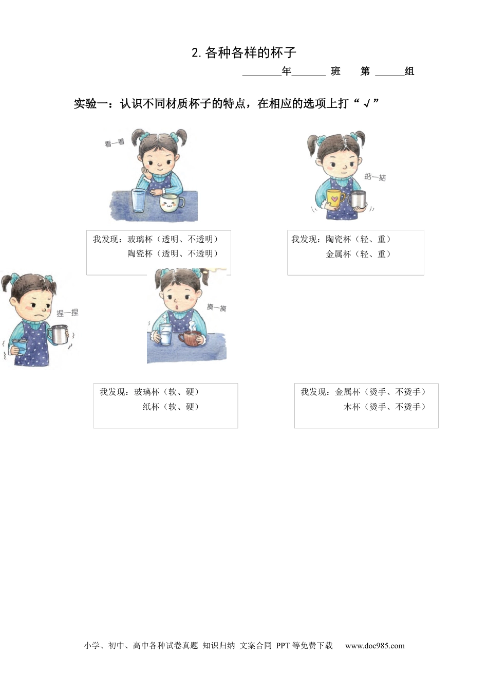 小学、初中、高中各种试卷真题知识归纳文案合同PPT等免费下载www.doc985.com2.各种各样的杯子年班第组实验一:认识不同材质杯子的特点,在相应的选项上打“√”我发现:玻璃杯(透明、不透明)陶瓷杯(透明、不透明)我发现:陶瓷杯(轻、重)金属杯(轻、重)我发现:玻璃杯(软、硬)纸杯(软、硬)我发现:金属杯(烫手、不烫手)木杯(烫手、不烫手)