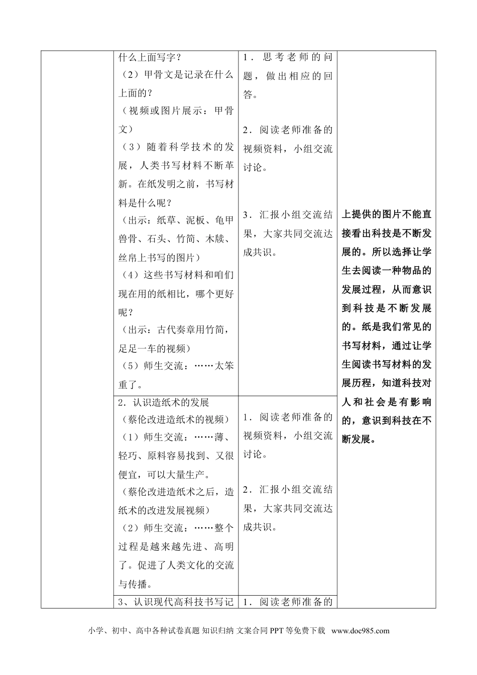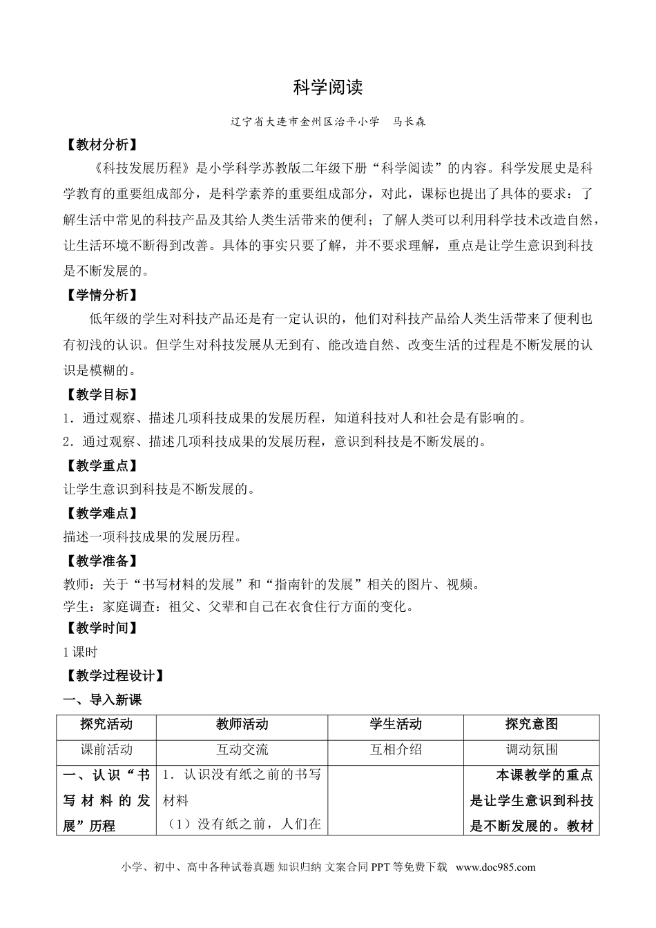 科学阅读辽宁省大连市金州区治平小学马长森【教材分析】《科技发展历程》是小学科学苏教版二年级下册“科学阅读”的内容。科学发展史是科学教育的重要组成部分,是科学素养的重要组成部分,对此,课标也提出了具体的要求:了解生活中常见的科技产品及其给人类生活带来的便利;了解人类可以利用科学技术改造自然,让生活环境不断得到改善。具体的事实只要了解,并不要求理解,重点是让学生意识到科技是不断发展的。【学情分析】低年级的学生对科技产品还是有一定认识的,他们对科技产品给人类生活带来了便利也有初浅的认识。但学生对科技发展从无到有、能改造自然、改变生活的过程是不断发展的认识是模糊的。【教学目标】1.通过观察、描述几项科技成果的发展历程,知道科技对人和社会是有影响的。2.通过观察、描述几项科技成果的发展历程,意识到科技是不断发展的。【教学重点】让学生意识到科技是不断发展的。【教学难点】描述一项科技成果的发展历程。【教学准备】教师:关于“书写材料的发展”和“指南针的发展”相关的图片、视频。学生:家庭调查:祖父、父辈和自己在衣食住行方面的变化。【教学时间】1课时【教学过程设计】一、导入新课探究活动教师活动学生活动探究意图课前活动互动交流互相介绍调动氛围一、认识“书写材料的发展”历程1.认识没有纸之前的书写材料(1)没有纸之前,人们在本课教学的重点是让学生意识到科技是不断发展的。教材小学、初中、高中各种试卷真题知识归纳文案合同PPT等免费下载www.doc985.com什么上面写字?(2)甲骨文是记录在什么上面的?(视频或图片展示:甲骨文)(3)随着科学技术的发展,人类书写材料不断革新。在纸发明之前,书写材料是什么呢?(出示:纸草、泥板、龟甲兽骨、石头、竹简、木牍、丝帛上书写的图片)(4)这些书写材料和咱们现在用的纸相比,哪个更好呢?(出示:古代奏章用竹简,足足一车的视频)(5)师生交流:……太笨重了。1.思考老师的问题,做出相应的回答。2.阅读老师准备的视频资料,小组交流讨论。3.汇报小组交流结果,大家共同交流达成共识。上提供的图片不能直接看出科技是不断发展的。所以选择让学生去阅读一种物品的发展过程,从而意识到科技是不断发展的。纸是我们常见的书写材料,通过让学生阅读书写材料的发展历程,知道科技对人和社会是有影响的,意识到科技在不断发展。2.认识造纸术的发展(蔡伦改进造纸术的视频)(1)师生交流:……薄、轻巧、原料容易找到、又很便宜,可以大量生产。(蔡伦改进造纸术之后,造纸术的改进发展视频)(2)师生交流:……整个过程是越来越先进、高明了。促进了人类文化的交流与传播。1.阅读老师准备的视频资料,小组交流讨论。2.汇报小组交流结果,大家共同交流达成共识。3、认识现代高科技书写记1.阅读老师准备的小学、初中、高中各种试卷真题知识归纳文案合同PPT等免费下载www.doc985.com录、传递方式(电子存储与传输的视频、图片)师生交流:……科学技术越来越发达,人们交流更方便、快捷。视频资料,小组交流讨论。2.汇报小组交流结果,大家共同交流达成共识。二、认识“指南针的发展”历程1.认识没有指南针时,人们的生活(出示哥仑布环球视频)(1)这是人类历史上第一次环绕地球一周的旅行。他们在茫茫的大海上,是怎么找到回家的方向呢?(2)没有指南针的时候?人们敢走出离家很远吗?(3)师生交流:……不敢,怕迷路了。世界各地的人们得不到交流。1.阅读老师准备的视频资料,小组交流讨论。2.汇报小组交流结果,大家共同交流达成共识。只拿一种物品的发展历程就来说明科技是不断发展的,没有说服力。所以再让学生阅读一种身边的物品,即阅读指南针的发展历程,学生通过对指南针发展历程的阅读,知道人类生活的需求促使社会在进步,科技在发展,人类生活越来越好。从而意识到科技是不断发展的。2.指南针的发明和发展(出示司南图片、视频)(1)师生交流:最早的指南针是什么样子?叫什么?对人们有什么好处?(司南、铁鱼、磁针、罗盘的演变发展过程视频)(2)师生交流:……指南针的发明和发展对于人类社会的进步和发展有着不可估量的价...