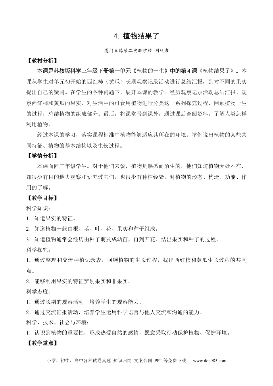 小学、初中、高中各种试卷真题知识归纳文案合同PPT等免费下载www.doc985.com4.植物结果了厦门五缘第二实验学校刘欣吉【教材分析】本课是苏教版科学三年级下册第一单元《植物的一生》中的第4课《植物结果了》。本课从学生对单元初开始的西红柿(黄瓜)长期观察记录活动进行总结汇报,到对不同的果实提出自己的疑问。在学生的各种问题下,展开本课的教学。经历观察记录活动总结汇报、观察西红柿和黄瓜的果实、对生活中的可食用植物进行分类这一系列探究过程,回顾植物一生的过程,总结植物的组成部分。最后,将课堂带到课外,通过课后查阅资料,了解人类怎样利用植物。经过本课的学习,落实课程标准中植物能够适应其所在的环境。举例说出植物的某些共同特征、植物的基本结构以及生长过程。【学情分析】本课面向三年级学生。对于他们来说,植物是熟悉而陌生的,他们知道植物无处不在,却很少有目的地去观察和研究过它们,也很少有种植经验,对植物的形态、构造、功能、作用的了解。【教学目标】科学知识:1.知道果实的特征。2.知道植物一般由根、茎、叶、花、果实和种子组成。3.知道植物通常会经历由种子萌发成幼苗,再到开花、结出果实和种子的过程。科学探究:1.通过整理和交流种植记录表,回顾植物的生长过程,找出西红柿和黄瓜生长过程的共同点。2.能够利用果实的特征辨别果实和非果实。科学态度:1.通过长期的观察活动,培养学生的观察能力。2.通过交流汇报活动,培养学生运用科学语言与他人交流和沟通的能力。科学、技术、社会与环境:1.认识到植物的重要性,形成热爱自然的感情,愿意采取行动保护植物、保护环境。【教学重点】小学、初中、高中各种试卷真题知识归纳文案合同PPT等免费下载www.doc985.com通过整理和交流种植记录表,回顾植物的生长过程,找出西红柿和黄瓜生长过程的共同点。。【教学难点】能够利用果实的特征辨别果实和非果实。【教学准备】教师材料:观察记录表、课件、视频。学生材料:观察记录表、西红柿、黄瓜、小刀。【教学时间】1课时【教学过程设计】一、导入新课1.教师携带2株学生栽种的西红柿进教室。2.谈话:同学们,你们看,在大家的共同努力下,我们的西红柿终于长大了,你们还记得刚见到它时,它是什么样子的吗?(种子)3.谈话:这些西红柿和同学们一起成长,也帮助同学们学习到了很多与植物有关的知识,你都知道了些什么?4.学生利用前知回答:植物的根、茎、叶、花……5.谈话:今天,我们的西红柿要带大家继续学习有关的知识,会是什么呢?[设计意图:通过展示学生栽种的西红柿,引起学生的兴趣,吸引学生的关注。通过展示唤醒学生的前知记忆,展开接下来的学习。]二、西红柿种植观察活动交流汇报会1.谈话:同学们,你们还记得第一次见到西红柿的时候它长什么样吗?它现在长什么样?2.学生描述西红柿过去和现在的样子,教师适时出示学生拍摄的西红柿照片辅助其描述。3.谈话:从同学们的描述中,我感受到了同学们看着西红柿一天天健康长大的欣喜和自豪。那么,在西红柿长大的过程中,有哪些瞬间让你觉得很有纪念意义呢?请展示你的观察记录单,和同学们一起分享吧!4.学生展示观察记录单,汇报种植过程中的重要时刻:播种、发芽、长叶、开花……5.教师利用信息技术,展示多位学生观察记录单,适时指导学生使用科学语言进行汇报和交流。6.提问:从同学们的观察记录中,你们找到了什么共同点吗?7.学生阅读观察记录单,思考并发言。8.教师出示视频:西红柿的生长过程、黄瓜的生长过程。小学、初中、高中各种试卷真题知识归纳文案合同PPT等免费下载www.doc985.com9.提问:这两种植物的生长过程有没有共同点?10.师生共同小结:植物通常会经历由种子萌发成幼苗,再到开花、结出果实的过程。[设计意图:通过交流汇报会,了解学生种植观察活动的开展情况;结合信息技术应用,给予学生充分展示自己观察成果的机会,有助于提高学生用科学语言与人交流和沟通的能力,提高学生的观察能力,培养热爱观察、热爱植物的情感。]三、认识植物的果实1.提问:我们的西红柿开花之后会怎样呢?(结果)你知道西红柿的果实长什么样吗?2...