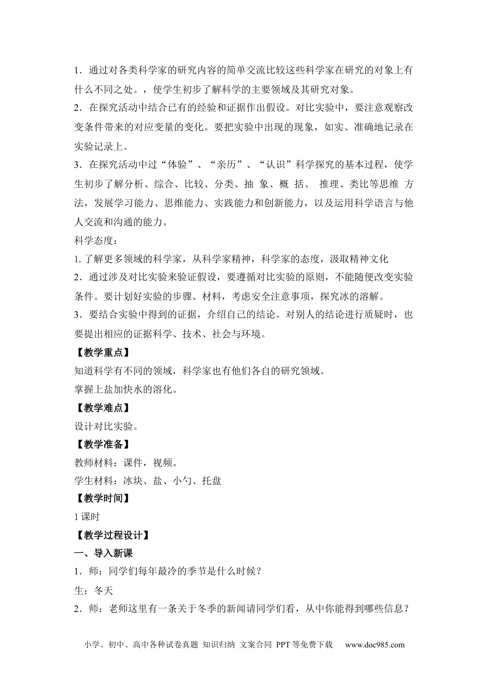 小学、初中、高中各种试卷真题知识归纳文案合同PPT等免费下载www.doc985.com像科学家那样山西省临汾市霍州市白龙矿区学校王瑾【教材分析】本册的专项学习“像科学家那样”指向科学探究能力的专门训练。随着学生探究能力和思维发展的进程,从中年段开始,我们把探究活动从低年段的三个环节进一步扩展到六个环节——提出问题、作出假设、制订计划、搜集证据、得出结论和分享交流。根据三年级学生学习特点和探活动的能力,本课重点要关注提出问题、作出假设的进阶性要求,并对制订计划、搜集证据、表达交流的具体指导。专项学习单元所呈现的“像科学家那样”,为学生呈现不同领域的科学家,使学生知道科学按研究对象的不同可分为自然科学、社会科学和思维科学三大类,不同领域的科学家分别研究什么。从科学家精神,科学家的态度,汲取精神文化。然后以撒盐后冰融化得快的现象为例,引导学生提出通过实验寻找答案的问题,并能够根据书上的指导,完成作出假设、制定计划等探究活动.【学情分析】三年级学生对于科学家已经有了初步的认识,对于科学领域还是模糊的概念,通过阅读资源可以使学生清晰的明白什么是科学领域。三年的科学课学习,学生学科认知得到了一定提高,部分学生已学会了自己收集资料,大部分学生已有仔细的观察力,而且知识道什么是融化、初步了解对比实验,虽然学生尚不具备独立设计对比实验的能力,但能对实验问题提出自己的猜测,能够根据教师的引导制定切实可行的探究实验方案。【教学目标】科学知识:1.知道按研究对象的不同可分不同的科学领域,科学家研究的领域也不相同。2.可以对“冰融化”的科学探究围绕已提出和聚焦的问题设计研究方案,在教师的引导下通过收集和分析信息获取证据、经过推理得出结论。3.通过有效表达与他人交流自己的探究结果和观点,能运用科学探究方法解决比较筒单的日常生活问题。科学探究:小学、初中、高中各种试卷真题知识归纳文案合同PPT等免费下载www.doc985.com1.通过对各类科学家的研究内容的简单交流比较这些科学家在研究的对象上有什么不同之处。,使学生初步了解科学的主要领域及其研究对象。2.在探究活动中结合已有的经验和证据作出假设。对比实验中,要注意观察改变条件带来的对应变量的变化。要把实验中出现的现象,如实、准确地记录在实验记录上。3.在探究活动中过“体验”、“亲历”、“认识”科学探究的基本过程,使学生初步了解分析、综合、比较、分类、抽象、概括、推理、类比等思维方法,发展学习能力、思维能力、实践能力和创新能力,以及运用科学语言与他人交流和沟通的能力。科学态度:1.了解更多领域的科学家,从科学家精神,科学家的态度,汲取精神文化2.通过涉及对比实验来验证假设,要遵循对比实验的原则,不能随便改变实验条件。要计划好实验的步骤、材料,考虑安全注意事项,探究冰的溶解。3.要结合实验中得到的证据,介绍自己的结论。对别人的结论进行质疑时,也要提出相应的证据科学、技术、社会与环境。【教学重点】知道科学有不同的领域,科学家也有他们各自的研究领域。掌握上盐加快水的溶化。【教学难点】设计对比实验。【教学准备】教师材料:课件,视频。学生材料:冰块、盐、小勺、托盘【教学时间】1课时【教学过程设计】一、导入新课1.师:同学们每年最冷的季节是什么时候?生:冬天2.师:老师这里有一条关于冬季的新闻请同学们看,从中你能得到哪些信息?小学、初中、高中各种试卷真题知识归纳文案合同PPT等免费下载www.doc985.com播放视频3.师:同学视频中信息是什么?生:大雪路滑,给雪撒盐。4.师:看了这个信息,大家可以提出问题了?生:为什么给雪撒盐?撒盐可以融化雪吗?5.师:请大家大家思考一下,如果雪放了盐就会融化,你还能想到盐能融化同类形的什么呢?生:可以是冰6.师:你试过吗?是真的吗生:(1)不知道(2)可信(3)不可信。原因(1)没试过(2)看过资料,亲手验证过(3)没见过可能不可信7.师:大家对这个消息,都有自己的想法那我们怎么证明自己是对的呢?生:做实验.8.师:好让我们像科学家那样来研究一下这个问题吧。揭示课题:《像科学家那样》[设计意图:通过视...