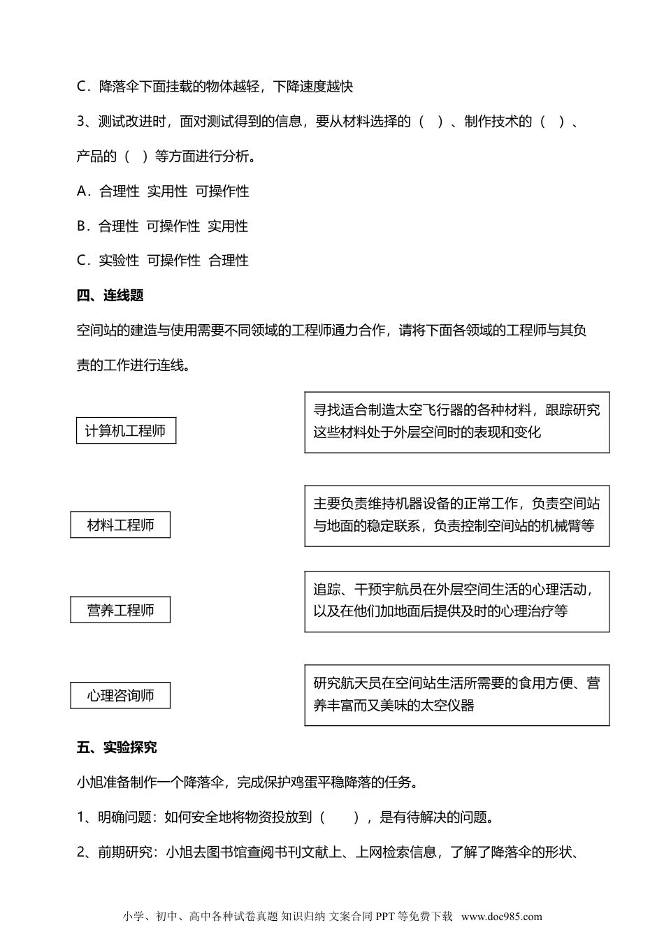 像工程师那样……一、填空题1、明确问题时,要学会用()的方式界定出任务及具体要求。2、降落伞在应急救援、()等方面发挥着重要作用。3、成员间的交流碰撞可以集思广益,激发();组内形成的共识可以促使组员相互(),主动地完成分内工作。二、判断题1、为了避免浪费,正式实验之前,可以先找一个鸡蛋的替代物来进行简单测试。()2、如果实验过程中鸡蛋摔碎了,实验就失败了,没必要继续进行下去了。()3、除了不同领域之间的合作,同一个工作小组的合作也很重要。()4、制作模型时必须非常全面。()三、选择题1、如图所示,飞行员在跳伞时,降落伞下降速度主要与()有关。A.伞绳的长短B.伞面的大小C.伞绳的数量2、下列说法中错误的是()。A.降落伞能缓慢下降是因为增大了空气阻力B.降落伞在下降时只受到重力和空气阻力作用小学、初中、高中各种试卷真题知识归纳文案合同PPT等免费下载www.doc985.comC.降落伞下面挂载的物体越轻,下降速度越快3、测试改进时,面对测试得到的信息,要从材料选择的()、制作技术的()、产品的()等方面进行分析。A.合理性实用性可操作性B.合理性可操作性实用性C.实验性可操作性合理性四、连线题空间站的建造与使用需要不同领域的工程师通力合作,请将下面各领域的工程师与其负责的工作进行连线。五、实验探究小旭准备制作一个降落伞,完成保护鸡蛋平稳降落的任务。1、明确问题:如何安全地将物资投放到(),是有待解决的问题。2、前期研究:小旭去图书馆查阅书刊文献上、上网检索信息,了解了降落伞的形状、小学、初中、高中各种试卷真题知识归纳文案合同PPT等免费下载www.doc985.com计算机工程师寻找适合制造太空飞行器的各种材料,跟踪研究这些材料处于外层空间时的表现和变化材料工程师主要负责维持机器设备的正常工作,负责空间站与地面的稳定联系,负责控制空间站的机械臂等营养工程师追踪、干预宇航员在外层空间生活的心理活动,以及在他们加地面后提供及时的心理治疗等研究航天员在空间站生活所需要的食用方便、营养丰富而又美味的太空仪器心理咨询师()、作用、()等信息。3、设计方案:小旭设计了一个()实验,研究伞面材料、伞面大小、伞面形状、伞绳根数和长短等因素与下降速度之间的关系,并绘制了设计图,如下所示。4、制作模型:小旭根据设计方案制作了模型。制作模型时根据实际需要,制作的模型可大可小;可以非常(),也要以比较()。有时会做一个与最终产品在外观、()、()等方面完全一致的样品,以便进行测试。5、测试改进:小旭发现降落伞下落的速度较快,鸡蛋壳摔裂了,他应该()【填“增大”或“减小”】伞面的面积。6、展示交流:经过改进,小旭制作的降落伞成功将鸡蛋平稳投放到指定地点。在评价过程中,应着重对()和()等方面进行评价。像工程师那样……答案一、填空题1、简单明了2、空投物资3、创意配合二、判断题1、√2、×3、√4、×三、选择题1、B2、C3、B小学、初中、高中各种试卷真题知识归纳文案合同PPT等免费下载www.doc985.com四、连线题五、实验探究1、指定地点2、结构工作原理3、对比4、全面简化结构功能5、增大6、美观用材少小学、初中、高中各种试卷真题知识归纳文案合同PPT等免费下载www.doc985.com计算机工程师寻找适合制造太空飞行器的各种材料,跟踪研究这些材料处于外层空间时的表现和变化材料工程师主要负责维持机器设备的正常工作,负责空间站与地面的稳定联系,负责控制空间站的机械臂等营养工程师追踪、干预宇航员在外层空间生活的心理活动,以及在他们加地面后提供及时的心理治疗等研究航天员在空间站生活所需要的食用方便、营养丰富而又美味的太空仪器心理咨询师
