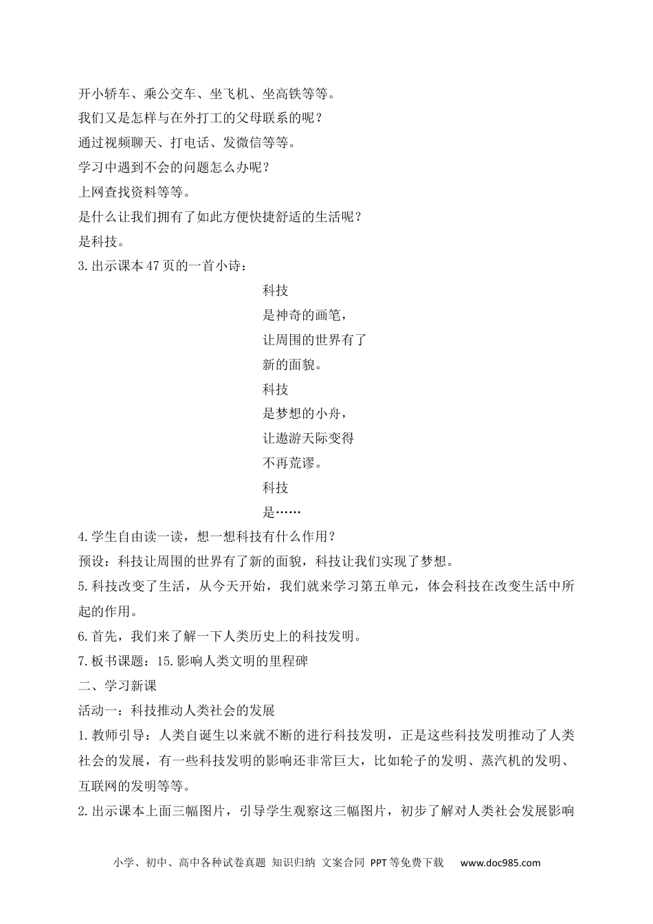 小学、初中、高中各种试卷真题知识归纳文案合同PPT等免费下载www.doc985.com2021年新苏教版科学六年级上册教案第五单元科技改变生活15.影响人类文明的里程碑1.教学内容本课按照由学生认知的逻辑顺序逐渐深入地安排了三部分内容。第一部分是一个讨论活动,主要是调用学生的前概念,选出自己认为对社会发展具有深远影响的“里程碑式”的产品,所谓“深远影响”就是波及领域广泛,涉及的人众多,传播的时间久远,对人类以往的行为改变是革命性的。教材首先列举了轮子、蒸汽机和互联网这三项对人类文明影响巨大的技术产品,其次就列出了印刷机、汽车、纸、电话、飞机、化肥、青霉素这几种产品,让学生从中挑选,并说明理由;最后是比较两份不一样的评选重大发明的目录,由此发现虽然评选的标准不一样,但是有的项目是人类目前公认的伟大发明。第二部分是一个动手和动脑兼而有之的活动,通过制作“它是如何改变世界的”科技产品卡片,让学生意识到某一产品对社会所产生的广泛的影响,通过具体的制作和写作,让学生深入某一产品,了解它的作用和意义。第三部分是阅读活动,通过三个人类社会进程中的重要节点火的发明和使用、蒸汽机的发明和利用以及计算机和互联网的推广,来阐述影响人类文明的里程碑。2.教学目标意识到各种产品具有一定的技术性质;意识到有的科技产品对社会发展具有深远影响;会制作“科技改变世界”的知识卡片;知道火的使用、蒸汽机的发明以及计算机和互联网的推广对世界而改变巨大。3.重点与难点重点:选择对世界产生深远影响的科技产品。难点:如何界定“里程碑式的深远影响”。4.教学准备各种技术产品的图片和视频,记录用的纸和笔。5.教学过程一、导入新课1.师生交流:同学们,现在的生活非常方便,平时大家是怎样出行的呢?小学、初中、高中各种试卷真题知识归纳文案合同PPT等免费下载www.doc985.com开小轿车、乘公交车、坐飞机、坐高铁等等。我们又是怎样与在外打工的父母联系的呢?通过视频聊天、打电话、发微信等等。学习中遇到不会的问题怎么办呢?上网查找资料等等。是什么让我们拥有了如此方便快捷舒适的生活呢?是科技。3.出示课本47页的一首小诗:科技是神奇的画笔,让周围的世界有了新的面貌。科技是梦想的小舟,让遨游天际变得不再荒谬。科技是……4.学生自由读一读,想一想科技有什么作用?预设:科技让周围的世界有了新的面貌,科技让我们实现了梦想。5.科技改变了生活,从今天开始,我们就来学习第五单元,体会科技在改变生活中所起的作用。6.首先,我们来了解一下人类历史上的科技发明。7.板书课题:15.影响人类文明的里程碑二、学习新课活动一:科技推动人类社会的发展1.教师引导:人类自诞生以来就不断的进行科技发明,正是这些科技发明推动了人类社会的发展,有一些科技发明的影响还非常巨大,比如轮子的发明、蒸汽机的发明、互联网的发明等等。2.出示课本上面三幅图片,引导学生观察这三幅图片,初步了解对人类社会发展影响小学、初中、高中各种试卷真题知识归纳文案合同PPT等免费下载www.doc985.com较大的科技发明。互联网,发明于上世纪70年代。轮子,大约发明于6500年前。蒸汽机汽车,大约发明于18世纪年前。3.教师引导:其实对人类社会发展影响特别大的发明还不止这三个下面,我们就来探讨对人类社会发展影响特别巨大的发明。活动二:选出对社会发展具有深远影响的产品1.出示课本48页下面的7幅图片,引导学生观察图片,初步了解7幅图片中的科技发明分别是什么?又是什么时候发明出来的?想一想在这些科技发明中,你认为哪些对社会发展具有深远影响?请选出来并说明你的理由。2.全班交流,学生从下列科技发明中选出自己认为对社会发展具有深远影响的发明,并说一说自己的理由。预设:轮子的发明:车轮的最伟大作用是使人可以搬动大大超过自身重量的物体。有了轮子,彻底改变了人类的运输方式,进而为以后的机械时代奠定了基础。蒸汽机的发明:传统的马力或者水力无法提供工业革命所需要的动力,蒸汽机能量的开发为各个领域带来了一种有效而强大的动力。互联网的发明:互联网作为信息技术的载体已成为人们工作、学习、生活、娱乐的重要工具,互联...