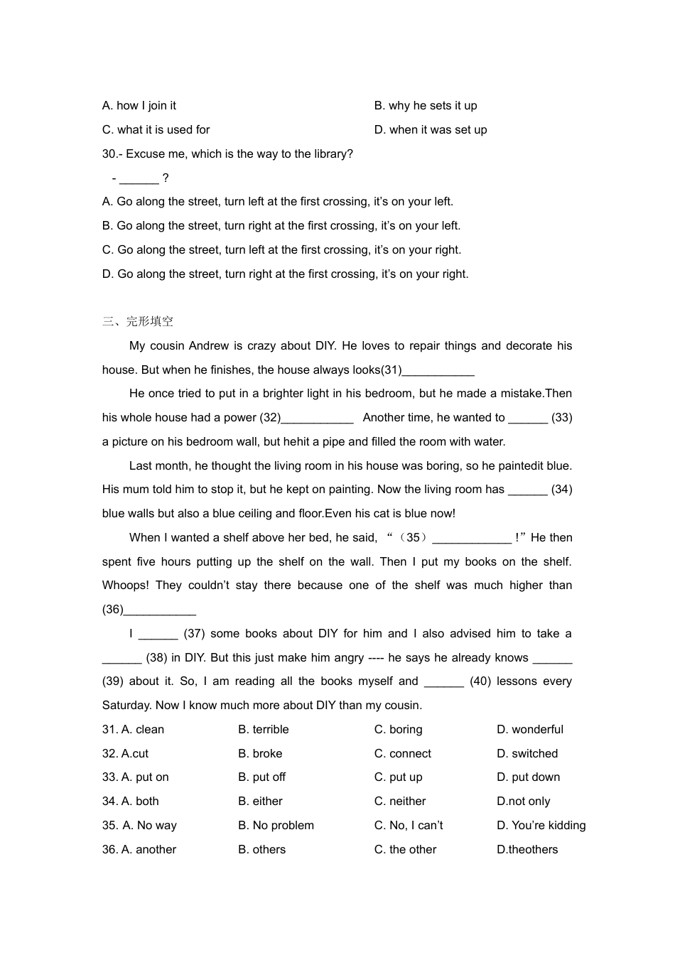 2017年潍坊市初中学业水平考试英语试题二、单项选择21.-Whatdoyouthinkoftheboy?-Heis______honeststudenttodayand______usefulmantomorrow.A.a;anB.an;aC.an;anD.a;a22.Alittleefforteveryday,you______abigdifference.A.makesB.madeC.havemadeD.willmake23.Agoodfriendissomeoneyou______shareyourpleasureandpainwith.A.canB.needC.shouldD.must24.–Whydoyou______LiuHulan?-Becausesheisagreathero.A.looklikeB.lookdownC.lookoverD.lookupto25.–Shallwegotoamusementparkrightawayorthedayaftertomorrow?-______.Anytimewilldo.A.ExcusemeB.HaveagoodtimeC.It’suptoyouD.I’mafraidIcan’t26.–“FoodSafety”hasbecomeoneofthehottesttopicsrecently.-Yeah,itreceives______Internethitsaday.A.thousandsB.thousandsofC.thousandD.hundreds27.-______isitfromyourhometoyourschool?-It’sabout10minutes’ride.A.HowlongB.HowsoonC.HowfarD.Howoften28.Whatkindofmoviesdoyouprefer?Ipreferthemovies______mesomethingtothinkabout.AwhichgiveB.thatgivesCwhichgivesD.whogives29.-Boy,yourheadteacherhassetupaWeChatgroup.Couldyoutellme______?-OK.I’llteachyou.It’ssoeasy.A.howIjoinitB.whyhesetsitupC.whatitisusedforD.whenitwassetup30.-Excuseme,whichisthewaytothelibrary?-______?A.Goalongthestreet,turnleftatthefirstcrossing,it’sonyourleft.B.Goalongthestreet,turnrightatthefirstcrossing,it’sonyourleft.C.Goalongthestreet,turnleftatthefirstcrossing,it’sonyourright.D.Goalongthestreet,turnrightatthefirstcrossing,it’sonyourright.三、完形填空MycousinAndrewiscrazyaboutDIY.Helovestorepairthingsanddecoratehishouse.Butwhenhefinishes,thehousealwayslooks(31)___________Heoncetriedtoputinabrighterlightinhisbedroom,buthemadeamistake.Thenhiswholehousehadapower(32)___________Anothertime,hewantedto______(33)apictureonhisbedroomwall,buthehitapipeandfilledtheroomwithwater.Lastmonth,hethoughtthelivingroominhishousewasboring,sohepainteditblue.Hismumtoldhimtostopit,buthekeptonpainting.Nowthelivingroomhas______(34)bluewallsbutalsoablueceilingandfloor.Evenhiscatisbluenow!WhenIwantedashelfaboveherbed,hesaid,“(35)____________!”Hethenspentfivehoursputtinguptheshelfonthewall.ThenIputmybooksontheshelf.Whoops!Theycouldn’tstaytherebecauseoneoftheshelfwasmuchhigherthan(36)___________I______(37)somebooksaboutDIYforhimandIalsoadvisedhimtotakea______(38)inDIY.Butthisjustmakehimangry----hesayshealreadyknows______(39)aboutit.So,Iamreadingallthebooksmyselfand______(40)lessonseverySaturday.NowIknowmuchmoreaboutDIYthanmycousin.31.A.cleanB.terribleC.boringD.wonderful32.A.cutB.brokeC.connectD.switched33.A.putonB.putoffC.putupD.putdown34.A.bothB.eitherC.neitherD.notonly35.A.NowayB.NoproblemC.No,Ican’tD.You’rekidding36.A.anotherB.othersC.theotherD.theothers37.A.lentB.gaveC.boughtD.sent38.A.planB.courseC.messageD.suggestion39.A.somethingB.anythingC.nothingD.everything40.A.attendingB.joiningC.givingD.takingpartin四、阅读理解AWintervacationisgoingbysofast.Soonitwillbetimetogobacktotheclassroom.AnAmericanwebsiteaskedtheirusershowtheyplantodotheirback-toschoolshopping.Here’swhattheysaid!41.Mostusersdoback-to-schoolshopping______.A.theweekbeforeschoolB.afterschoolhasstartedC.soonafterwintervacationstarsD.thedaybeforeschool42.WhichofthefollowingsentencesisTRUEaccordingtothepassage?A.35%usersmaydoback-to-schoolshoppingonline.B.30%usersmaydoback-to-schoolshoppinginstores.C.70%usersmaydoback-to-schoolshoppingonline.D.70%usersmaydoback-to-schoolshoppinginstores.43.Whatcanbeinferred(推断)fromt...