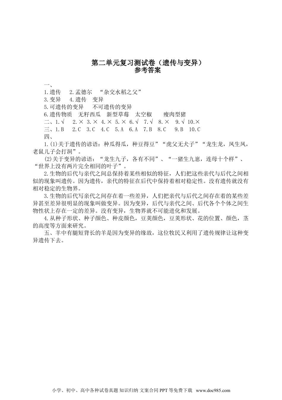 六年级下册科学第二单元复习测试卷(遗传与变异)满分100分时间60分钟一、填空题。(每空1分,共13分)1.子女和父母之间一般都或多或少地保特着一些相似的特征,这种现象叫()。2.()是现代遗传学之父,袁隆平被誉为()。3.子代与父代之间,同一物种之间一般都或多或少地存在着一些不同的特征,这种现象称为()。4.()和()是生命的基本特征之一,是生物界普遍存在的现象。5.变异一般有()和()两种形式。6.用人工的方法可以使()发生变异,培育出优良品种,如:()、()、()、()。二、判断题。(每小题2分,共20分)1.遗传和变异是生命的基本特征。()2.“种瓜得瓜,种豆得豆”说的是变异现象。()3.运动员身体肌肉强壮,他们的子女也一定肌肉强壮。()4.父母双方都是高个子,因为遗传的缘故,所生子女一定也是高个子。()5.生物的每一个特征都会遗传给下一代。()6.太空椒是因为它的遗传物质发生了变异,所以才长得果大色艳,籽少肉厚。()7.有些小麦在水和肥料充足的情况下,植株高大,产量很高,但遗传物质没有改变,这叫做不可遗传的变异。()8.父母双方都是双眼皮,子女是单眼皮,这属于环境引起的变异。()9.即使是双胞胎,他们的外貌特征也会有所区別。()10.自然界中所有的变异都是有利无害的。()三、选择题。(每小题2分,共20分)1.谚语说“一猪生九崽,连母十个样”,主要指的是什么现象()。A.遗传B.变异C.遗传和变异2.下列选项中,说決正确的是()A.转基因食品对人体都是有害的B.转基因食品对人体都是有益的C.转基因食品可能存在安全问题3.同卵双胞胎(由一个受精卵发育成两个胎儿)姐妹俩,皮肤有黑、白之分;一对正常肤色的夫妇生了一个白化病的孩子。引起这两种变异的类型和原因依次是()。A.前者是不可遗传的变异,由遗传物质的改变而引起;后者是可遗传的变异,由环境条件的改变而引起小学、初中、高中各种试卷真题知识归纳文案合同PPT等免费下载www.doc985.comB.前者是可遗传的变异,由遗传物质的改变而引起;后者是不可遗传的变异,由环境条件的改变而引起C.前者是不可遗传的变异,由环境条件的改变而引起;后者是可遗传的变异,由遗传物质的改变而引起4.下列品种中不属于科研人员利用人工变异培育出来的是()。A.无籽西瓜B.太空椒C.鲫鱼5.生物遗传规律是孟德尔研究()杂交实验后提出的。A.豌豆B.黄豆C.绿豆6.下列选项中属于不可遗传的是()A.头脑中的知识D.眼皮的单双C.先天性近视7.花猫妈妈生了一只黑猫和三只花猫,则猫爸爸可能是()A.花猫B.黑猫C.白猫8.下列选项中属于可遗传变异的是()A.植物营养不良,叶子由绿变黄B.水肥充足,水稻粒多C.杂交水稻的培育9.一般来说,生物自身是()变异的。A.不可以产生B.可以产生C.有时可以,有时不可以10.下列做法不可能使植物的遗传物质发生变异的是()。A.带入太空B.辐射作用C.修剪枝叶四、简答题。(32分)1.请写出你所知道的关于遗传与变异的谚语。(8分)2.该谈你对生物遗传现象的理解。(8分)3.谈谈你对生物变异现象的理解。(8分)4.假如你有一小块种满豌豆的菜地,现在你想知道豌豆有没有遗传现象,你会从哪些方面研究?(8分)五、材料分析题。(15分)美国有一位农民,他在自己的羊群中发现了一只腿短背长的羊;这只羊长得很像猎犬,连最低的羊栏也跨不过去,后来,他用这只羊培育成一种腿短背长的良种羊一一安康羊。这位牧民利用偶然发现的现象,培育出人们所需要的新品种,这其中包含了什么科学道理呢?小学、初中、高中各种试卷真题知识归纳文案合同PPT等免费下载www.doc985.com第二单元复习测试卷(遗传与变异)参考答案一、1.遗传2.孟德尔“杂交水稻之父”3.变异4.遗传变异5.可遗传的变异不可遗传的变异6.遗传物质无籽西瓜新型草莓太空椒瘦肉型猪二、1.√2.×3.×4.×5.×6.√7.√8.×9.√10.×三、1.B2.C3.C4.C5.A6.A7.B8.C9.B10.C四、1.(1)关于遗传的谚语:种瓜得瓜,种豆得豆”“虎父无犬子”“龙生龙,凤生凤,老鼠儿子会打洞”。(2)关于变异的谚语:“龙生九子,各有不同”、“一猪生九崽,连母十个样”、“世界上没有两片完全相同的叶子”。2.生物的后代与亲代之间总保持着某些相似的特征,人们把这些亲代与后代之间相...
