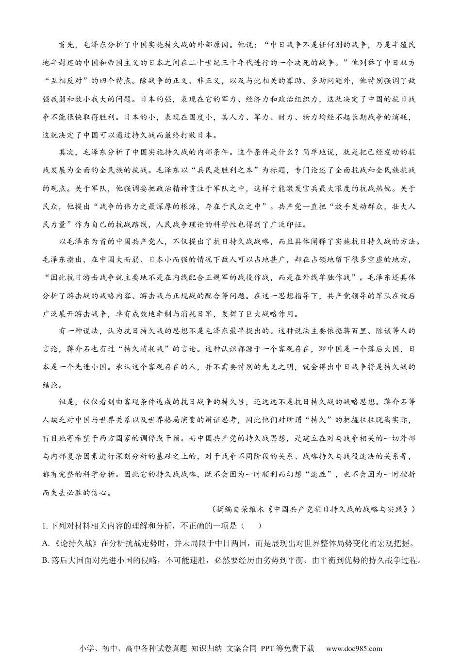 小学、初中、高中各种试卷真题知识归纳文案合同PPT等免费下载www.doc985.com2024年普通高等学校招生全国统一考试(新高考Ⅰ卷)语文(适用省份:山东、河北、湖北、福建、湖南、广东、江苏,浙江)一、现代文阅读(35分)(一)现代文阅读1(本题共5小题,19分)阅读下列文字,完成下面小题。材料一:(四五)中国由劣势到平衡到优势,日本由优势到平衡到劣势,中国由防御到相持到反攻,日本由进攻到保守到退却——这就是中日战争的过程,中日战争的必然趋势。(四六)于是问题和结论是:中国会亡吗?答复:不会亡,最后胜利是中国的。中国能够速胜吗?答复:不能速胜,必须是持久战。这个结论是正确的吗?我以为是正确的。(四七)讲到这里,亡国论和妥协论者又将跑出来说:中国由劣势到平衡,需要有同日本相等的军力和经济力;由平衡到优势,需要有超过日本的军力和经济力;然而这是不可能的,因此上述结论是不正确的。(四八)这就是所谓“唯武器论”,是战争问题中的机械论,是主观地和片面地看问题的意见。我们的意见与此相反,不但看到武器,而且看到人力。武器是战争的重要的因素,但不是决定的因素,决定的因素是人不是物。力量对比不但是军力和经济力的对比,而且是人力和人心的对比。军力和经济力是要人去掌握的。如果中国人的大多数、日本人的大多数、世界各国人的大多数是站在抗日战争方面的话,那末,日本少数人强制地掌握着的军力和经济力,还能算是优势吗?它不是优势,那么,掌握比较劣势的军力和经济力的中国,不就成了优势吗?没有疑义,中国只要坚持抗战和坚持统一战线,其军力和经济力是能够逐渐地加强的。而我们的敌人,经过长期战争和内外矛盾的削弱,其军力和经济力又必然要起相反的变化。在这种情况下,难道中国也不能变成优势吗?还不止此,目前我们不能把别国的军力和经济力大量地公开地算作自己方面的力量,难道将来也不能吗?如果日本的敌人不止中国一个,如果将来有一国或几国以其相当大量的军力和经济力公开地防御或攻击日本,公开地援助我们,那末,优势不更在我们一方面吗?日本是小国,其战争是退步的和野蛮的,其国际地位将益处于孤立;中国是大国,其战争是进步的和正义的,其国际地位将益处于多助。所有这些,经过长期发展,难道还不能使敌我优劣的形势确定地发生变化吗?(摘自毛泽东《论持久战》)材料二:1938年5月,毛泽东发表著名的《论持久战》,系统阐述了关于持久战的战略思想。小学、初中、高中各种试卷真题知识归纳文案合同PPT等免费下载www.doc985.com首先,毛泽东分析了中国实施持久战的外部原因。他说:“中日战争不是任何别的战争,乃是半殖民地半封建的中国和帝国主义的日本之间在二十世纪三十年代进行的一个决死的战争。”他列举了中日双方“互相反对”的四个特点。除战争的正义、非正义,以及与此相关的寡助、多助问题外,他特别强调了敌强我弱和敌小我大的问题。日本的强,表现在它的军力、经济力和政治组织力,这就决定了中国的抗日战争不能很快取得胜利。日本的小,表现在国度小,其人力、军力、财力、物力均经不起长期战争的消耗,这就决定了中国可以通过持久战而最终打败日本。其次,毛泽东分析了中国实施持久战的内部条件。这个条件是什么?简单地说,就是把已经发动的抗战发展为全面的全民族的抗战。毛泽东以“兵民是胜利之本”为标题,专门论述了全面抗战和全民族抗战的观点。关于军队,他强调要把政治精神贯注于军队之中,这样才能激发官兵最大限度的抗战热忱。关于民众,他提出“战争的伟力之最深厚的根源,存在于民众之中”。共产党一直把“放手发动群众,壮大人民力量”作为自己的抗战路线,人民战争理论的科学性也得到了广泛印证。以毛泽东为首的中国共产党人,不仅提出了抗日持久战战略,而且具体阐释了实施抗日持久战的方法。毛泽东指出,在中国大而弱、日本小而强的情况下敌人可以占地甚广,却在占领地留下很多空虚的地方,“因此抗日游击战争就主要地不是在内线配合正规军的战役作战,而是在外线单独作战”。毛泽东还具体分析了游击战的战略内容、游击战与正规战的配合等问题。在这一思想指导下,共产党领...