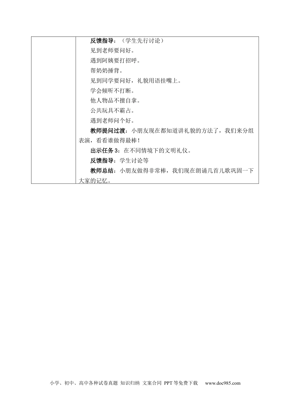 小学、初中、高中各种试卷真题知识归纳文案合同PPT等免费下载www.doc985.com《对人有礼貌》教学设计课题对人有礼貌核心素养目标政治认同:通过学习,学生能够了解并掌握日常生活中的礼貌用语和行为规范,如使用“您好、谢谢、对不起”等文明用语,以及在不同场合下的礼仪要求。道德修养:激发学生对讲文明、懂礼貌的认同感和自豪感,使他们以对人有礼貌为荣。法治观念:通过持续的教育和实践,学生能够逐渐养成讲文明、懂礼貌的良好习惯,并将这些习惯内化为自身的行为准则。健全人格:学生能够认识到对人有礼貌是尊敬别人的表现,是文明社会做人的起码要求,也是人类社会生活的共同行为准则。责任意识:明白礼仪的分类以及讲礼貌的重要性。教学重点讲礼貌的重要性教学难点合理搭配饮食,养成良好的生活习惯。教学准备教师准备:课件教材教学过程对话导入导语:小朋友们,我们来看一个视频?出示任务:那么你们知道讲礼貌的重要性吗?反馈指导:引导学生回答。教师总结:我们今天就来学习不同场合的文明礼仪,看看究竟有哪些讲究。导语:对人有礼貌,大家都温暖,我也有这样的经历——出示任务1:想一想,生活中有哪些因为讲礼貌温暖的时刻?反馈指导:引导学生自由回答。教师总结:同学们讨论的非常好,知道了讲礼貌可以让人感到温暖。出示任务2:观看图片,说一说,什么时候对人应该有礼貌?小学、初中、高中各种试卷真题知识归纳文案合同PPT等免费下载www.doc985.com反馈指导:(学生先行讨论)见到老师要问好。遇到阿姨要打招呼。帮奶奶捶背。见到同学要问好,礼貌用语挂嘴上。学会倾听不打断。他人物品不擅自拿。公共玩具不霸占。遇到老师问个好。教师提问过渡:小朋友现在都知道讲礼貌的方法了,我们来分组表演,看看谁做得最棒!出示任务3:在不同情境下的文明礼仪。反馈指导:学生讨论等教师总结:小朋友做得非常棒,我们现在朗诵几首儿歌巩固一下大家的记忆。小学、初中、高中各种试卷真题知识归纳文案合同PPT等免费下载www.doc985.com小学、初中、高中各种试卷真题知识归纳文案合同PPT等免费下载www.doc985.com教师提问过渡:说一说,你觉得上图小朋友的行为值得我们学习吗?你从中学到了什么?(学生回答)反馈指导:分组交流:除此之外,中华礼仪敬辞,餐桌上还有哪些礼仪呢?教师总结:小朋友说得很好,相信你们在家用餐时都能做到讲礼仪、有礼貌。出示任务2:有些小朋友,中午是不是在吃小饭桌?(学生回答)这么多小朋友都在小饭桌吃饭,你们和小朋友一起吃饭时,是否小学、初中、高中各种试卷真题知识归纳文案合同PPT等免费下载www.doc985.com注意餐桌礼仪了呢?小朋友在一起吃饭时要注意什么?反馈指导:学生总结回答。教师总结:同学们现在知道了餐桌礼仪,希望你们不论在家还是在外用餐,都要遵守哦!讲礼貌的学问可大了,可有讲究了。这节课我们来讨论一下在哪些场合讲礼貌会更好?小学、初中、高中各种试卷真题知识归纳文案合同PPT等免费下载www.doc985.com教师总结:班级“礼貌之星”谁是?说说为什么?小学、初中、高中各种试卷真题知识归纳文案合同PPT等免费下载www.doc985.com课后小结通过这节课的学习,我们了解了礼仪的分类,知道了讲礼貌的重要,明白在不同场合文明术语,必须养成良好的礼貌行为,培养健康文明的生活方式。