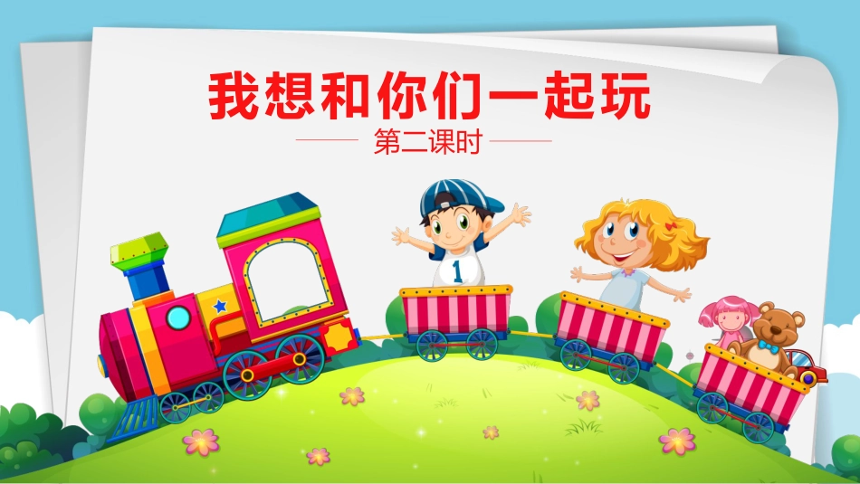 我想和你们一起玩第二课时道德与法治部编版一年级下第二课时我想和你们一起玩视频:找朋友小小分享会1、你有多少可以一起玩的朋友呢?2、你们在一起玩得怎么样?3、还记得你们是怎么认识,怎么玩到一起的吗?绘本故事:小布丁和小蝴蝶我刚刚搬来,一个人也不认识,真没意思!说一说:你也有过一个人玩的经历吗?你觉得一个人玩怎么样?小蝴蝶,你自己在那儿好玩吗?我胆子小,不敢出去找伙伴。说一说为什么小布丁不出去玩呢?你飞出去试试看。嘻嘻……说一说一起玩感觉怎么样?外面的很好玩,你也出去玩吧!好,我也去试试!我是小布丁,想和你们一起玩……说一说:怎样才能一起玩?小小故事会你也曾经像小布丁和小蝴蝶一样不敢出去玩吗?是因为什么?有一次,我很想和高年级同学打乒乓球,可是我又很担心我打得不好,他们不愿意和我一起玩。我是转学生,刚开始来到新的班级时,我很想和大家一起玩,但是我不知道应该怎么和开口。我打得不太好······没关系!你别挡着我!情景探究情景探究1、蓝衣服的小男孩和红衣服的小女孩都想和大家一起玩,你觉得谁的做法能够帮助他们和大家一起玩呢?为什么?2、你从他们身上吸取了怎样的经验?蓝衣服的小男孩能够和大家一起玩,因为他大胆地说出了自己的想法,并且也讲礼貌。她很想一起玩,但是却没有说出来,还挡住了哥哥们打球,而这些哥哥都不知道女孩是想和他们一起玩。小讨论请你结合自己的交友经验,说说要怎样做才能一起玩呢?礼貌打招呼留下好印象大胆、主动说出自己的想法就算被拒绝了也不要计较试一试请你在班级里找到还不太熟悉的同学,告诉他们,你想和他们一起玩吧!情景探究一为什么玩不下去了呢?一起玩要守规则!这次不算,要重来!情景探究二为什么玩不下去了呢?一起玩,输赢没什么!哼!老是他们赢!小小交友专家1、你在和小伙伴一起玩的时候也见过这样的情况吗?都有哪些不同的情况?2、如果遇到这些问题,我们要怎样才能玩下去呢?玲玲是个爱哭鬼,玩耍时不小心磕到、碰到或者她不开心的时候就哭,烦死了。我有时候一急起来就会发脾气,每当这个时候,小伙伴都会很不开心。每次我们有新玩具,小强都想和我们一起玩,但是他从来都不拿他的玩具和我们分享,我们一碰,他就会抢回去。快乐玩耍小贴士要遵守游戏规则要互帮互助、相互分享不计较,不当小气包试一试游戏时,有一位小伙伴还没来,你会怎么做?美术课上,你会画蝴蝶,但同桌不会,你会怎么做?踢足球时,朋友不小心踢到了你,你会怎么做?5个小伙伴去打乒乓球,球拍只有四只,你会怎么做?玩游戏的时候有人不遵守游戏规则,你会怎么做?教师寄语我们在一起玩的过程中,要大方不计较、互帮互助,还要尊重和理解别人,这样,我们就能在一起快乐玩耍、快乐成长了!板书设计1、想一起玩怎么办2、为什么玩不下去了我想和你们一起玩第二课时