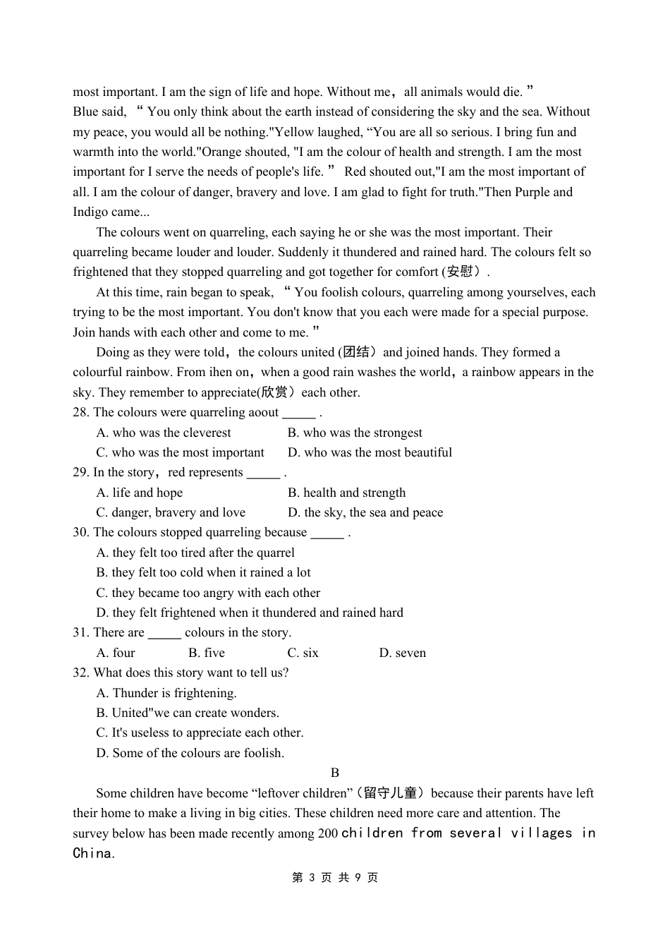2010年江苏省淮安市中考英语试题(满分120分,考试时间120分钟)第I卷(选择题共52分)I.单项选择(共15小题,每小题1分,满分15分)从A、B、C、D四个选项中,选出可以填入空白处的正确答案。1.Look!ThereismapofChinaonthewall.A.aB.anC.theD./2.Howexciting!WearenowholdingWorldExpo2010Shanghai,China.A.toB.onC.ofD.in3.—Hereweare.Wheredoesyourcousinlive,Tom?—Oh,helivesonthefloor.A.twoB.twiceC.secondD.twos4.YaoMingismyfavouritebasketballplayer.Ireallylike.A.heB.himC.hisD.her5.—WhatwereyoudoingwhenIcalledyouat8o'clockyesterday?Itheviolinatthattime.A.playB.isplayingC.playedD.wasplaying6.Westopridingwhenthetrafficlightturnsred.A.mayB.mustC.couldD.can7.Wedon'tknowheis.Heisadoctor.A.whatB.whichC.whoD.whom8.It'scoldoutside.Pleaseyourcoat.A.putonB.putawayC.putupD.putout9.Myneighbourhastwinsisters.Theybothgoodatswimming.A.beliamC.isD.are10.—haveyoustayedinthisschool?—Forthreeyears.A.HowfarB.HowlongC.HowoftenD.Howmany11.Atthesportsmeeting,SimonjumpedasasDaniel.A.highB.higherC.slowD.slower12.TodayisSusan'sbirthday.Amongthosearesomeoldfriendsofmine.A.invitingB.invitationsC.toinviteD.invited13.—ShallwegoforapicnicthisSaturday?—Allright,itrains.第1页共9页A.IfB.WhenC.UnlessD.Until14.OnApril14,2010,aterrible_______hitYushu,Qinghai.Weweresadanddonatedmuchmoney.A.floodB.earthquakeC.typhoonD.snowstorm15.MrLiBritainseveraltimes.TomorrowhewillgiveusatalkaboutBritishculture.A.hasgonetoB.havegonetoC.hasbeentoD.havebeentoI.完形填空(共12小题;每小题1分,满分12分)阅读下文掌握其大意,然后从各题所给的四个选项中选出一个最佳答案。WhenIwassixteenyearsold,aboygavemeanimportantgift.Itwasa16Itwastheautumnofmyfirstyearatajuniorhighschool,andmyoldschoolwasfaraway.Asaresult,17knewwhoIwas.Iwasvery18,andafraidtomakefriendswithanyone.EverytimeIheardtheotherstudentstalkingandlaughing,I19myheartbreak.Icouldn'ttalkaboutmy20withanyone.AndIdidn'twantmyparentstoworryaboutme.Thenoneday,myclassmatestalkedhappilywiththeirfriends,butIsatatmydesk21asusual.Atthatmoment,aboyenteredtheclassroom.Ididn'tknowwhohewas.He22meandthenturnedback.Helookedatme,withoutaword23asmile.Suddenly,somethingbrightandfriendlymademefeelhappy,livelyandwarm.Thatsmile24mylife.Istartedtotalkwithotherstudentsandmadefriends.Daybyday,Ibecame25toeveryoneinmyclass.Theboy26theluckysmilehasbecomemybestfriendnow.OnedayIaskedhimwhyhesmiledtome,buthecouldn'trememberthat!.Itdoesn'tmatter27allthedarkdayshavegone.Ibelievethattheworldiswhatyouthinkitis.Ifyouthinkitlonely,youmightalwaysbealone.Sosmileattheworldanditwillsmileback.16.A.penB.smileC.toyD.book17.A.someoneB.anyoneC.everyoneD.noone18.A.angryB.surprisedC.lonelyD.shocked19.A.feltB.tastedC.lookedD.smelt20.A.adviceB.suggestionsC.problemsD.answers21.A.excitedlyB.cheerfullyC.happilyD.unhappily22.A.walkedpastB.walkedintoC.walkedacrossD.walkedthrough23.A.butB.asC.andD.or24.A.enjoyedB.changedC.destroyedD.lost25.A.betterB.worseC.closerD.farther26.A.withB.withoutC.ofD.on27.A.thoughB.becauseC.soD.beforeI.阅读理解(共15小题;A、B两篇每小题2分,C篇每小题1分,满分25分)阅读下面短文,从所给的四个选项中选出一个最佳答案。ALonglongago,thecoloursoftheworldstartedtoquarrel.Greensaid,“ClearlyIamthe第2页共9页mostimportant.Iamthesignoflifeandhope.Withoutme,allanimalswoulddie.”Bluesaid,“Youonlythinkabouttheearthinsteadofconsideringtheskyandthesea.Withoutmypeace,youwouldallbenothing."Yellowlaughed,“Youareallsoserious.Ibringfunan...
