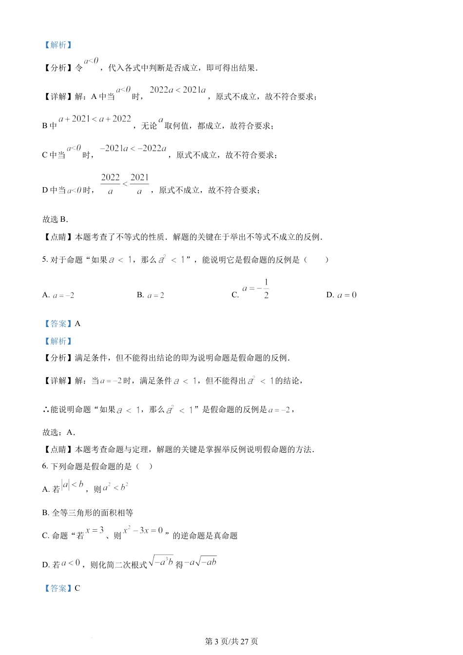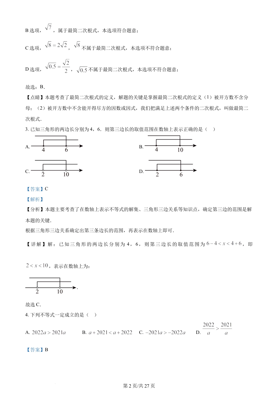 第1页/共27页学科网(北京)股份有限公司2023学年第一学期八年级期初测试数学试题考生须知:1.全卷共2页,有3个大题,24个小题,满分为100分.考试时间90分钟,考试形式为闭卷.2.请将姓名、班级、学号分别填写在试题卷和答题卷的规定位置上.一、选择题(本大题共10小题,每小题3分,共30分.请选出每小题中一个符合题意的选项.不选、错选均不给分)1.下列图形中,是轴对称图形的是()A.B.C.D.【答案】A【解析】【分析】本题主要考查了轴对称图形,如果一个平面图形沿一条直线折叠,直线两旁的部分能够互相重合,这个图形就叫做轴对称图形.根据轴对称图形的定义进行逐项判断即可.【详解】解:A..是轴对称图形,符合题意;B.不是轴对称图形,不符合题意;C.不是轴对称图形,不符合题意;D.不是轴对称图形,不符合题意.故选A.2.下列式子中,属于最简二次根式的是()A.B.C.D.【答案】B【解析】【分析】根据最简二次根式的定义判断即可.【详解】解:A选项,,不属于最简二次根式,本选项不符合题意;第2页/共27页学科网(北京)股份有限公司B选项,,属于最简二次根式,本选项符合题意;C选项,,不属于最简二次根式,本选项不符合题意;D选项,,不属于最简二次根式,本选项不符合题意;故选:B.【点睛】本题考查了最简二次根式的定义,解题的关键是掌握最简二次根式的定义(1)被开方数不含分母;(2)被开方数中不含能开得尽方的因数或因式,我们把满足上述两个条件的二次根式,叫做最简二次根式.3.已知三角形的两边长分别为4,6.则第三边长的取值范围在数轴上表示正确的是()A.B.C.D.【答案】C【解析】【分析】本题主要考查了在数轴上表示不等式的解集、三角形三边关系等知识点,确定第三边的范围是解本题的关键.根据三角形三边关系确定出第三条边长的范围,再表示在数轴上即可.【详解】解:已知三角形的两边长分别为4,6,则第三边长的取值范围为,即,表示在数轴上为:.故选C.4.下列不等式一定成立的是()A.B.C.D.【答案】B第3页/共27页学科网(北京)股份有限公司【解析】【分析】令,代入各式中判断是否成立,即可得出结果.【详解】解:A中当时,,原式不成立,故不符合要求;B中,无论取何值,都成立,故符合要求;C中当时,,原式不成立,故不符合要求;D中当时,,原式不成立,故不符合要求;故选B.【点睛】本题考查了不等式的性质.解题的关键在于举出不等式不成立的反例.5.对于命题“如果,那么”,能说明它是假命题的反例是()A.B.C.D.【答案】A【解析】【分析】满足条件,但不能得出结论的即为说明命题是假命题的反例.【详解】解:当时,满足条件,但不能得出的结论,∴能说明命题“如果,那么”是假命题的反例是,故选:A.【点睛】本题考查命题与定理,解题的关键是掌握举反例说明假命题的方法.6.下列命题是假命题的是()A.若,则B.全等三角形的面积相等C.命题“若、则”的逆命题是真命题D.若,则化简二次根式得【答案】C第4页/共27页学科网(北京)股份有限公司【解析】【分析】根据实数的平方、绝对值的性质、全等三角形的性质、一元二次方程的解、二次根式的性质逐项判断即可.【详解】解:A、若,则,是真命题,不符合题意;B、全等三角形的面积相等,是真命题,不符合题意;C、命题“若,则”的逆命题是“若,则”是假命题,符合题意;D、若,则化简二次根式可得,是真命题,不符合题意.故选:C.【点睛】本题主要考查了命题的真假判断、逆命题的概念、实数的平方、绝对值的性质、全等三角形的性质、一元二次方程的解、二次根式的性质等知识点,判断命题的真假关键.7.如图,在中,,下列尺规作图,不能得到的是()A.B.C.D.【答案】D【解析】【分析】A、根据等边对等角即可得出;B、利用角平分线及三角形外角的定义即可证明;C、利用垂直平分线的性质及三角形外角的性质即可证明;D、由作图方法无法得出相应结果.【详解】解:A、由作图得,,∴,不符合题意;B、由作图得,, ,∴,∴,不符合题意;第5页/共27页学科网(北京)股份有限公司C、由作图得,,∴,∴,不符合题意;D、由作图无法得出,∴不一定成立,符合题意;...