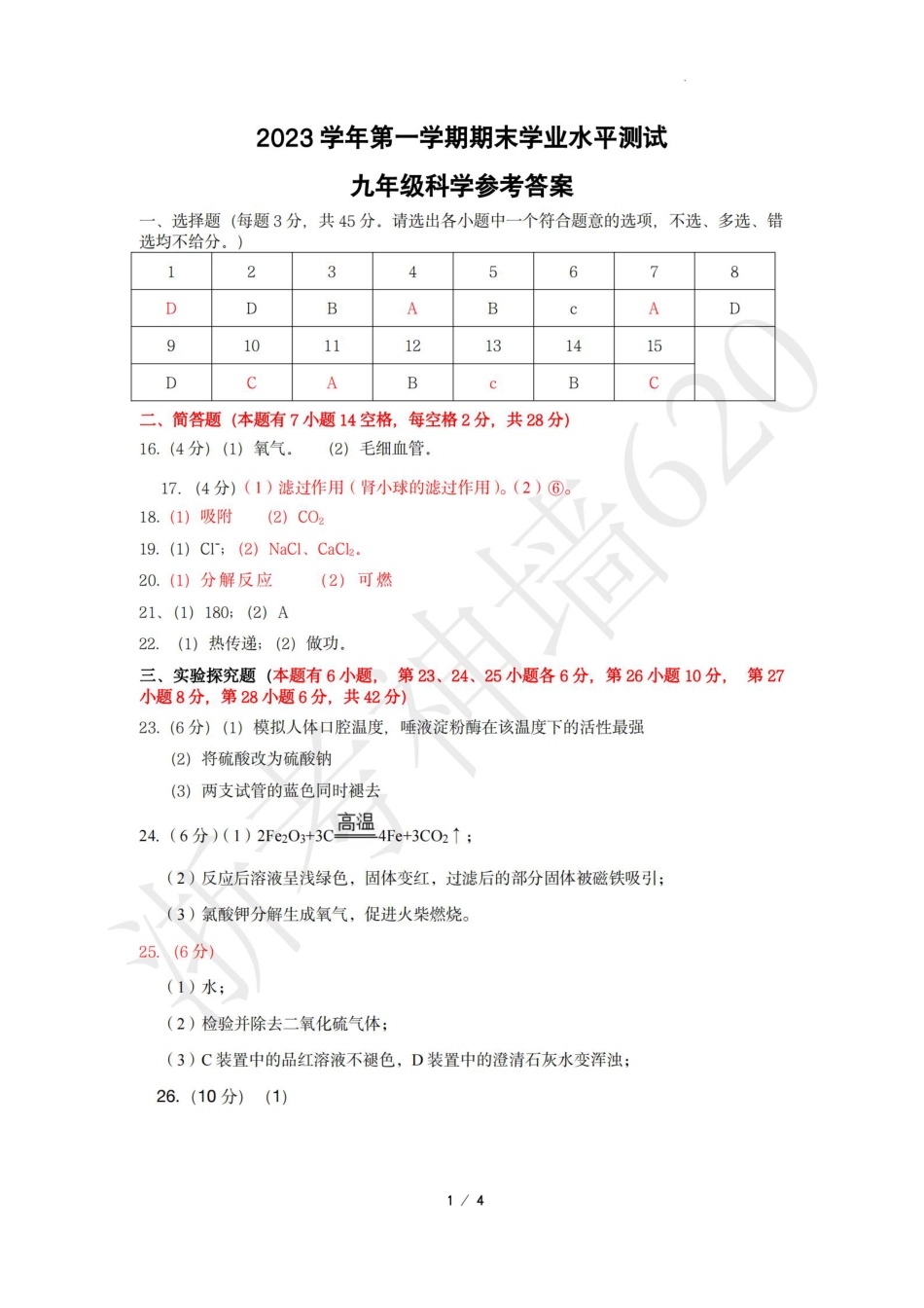 科学答案-2401杭州余杭区九年级上期末.pdf本文件免费下载 【共4页】