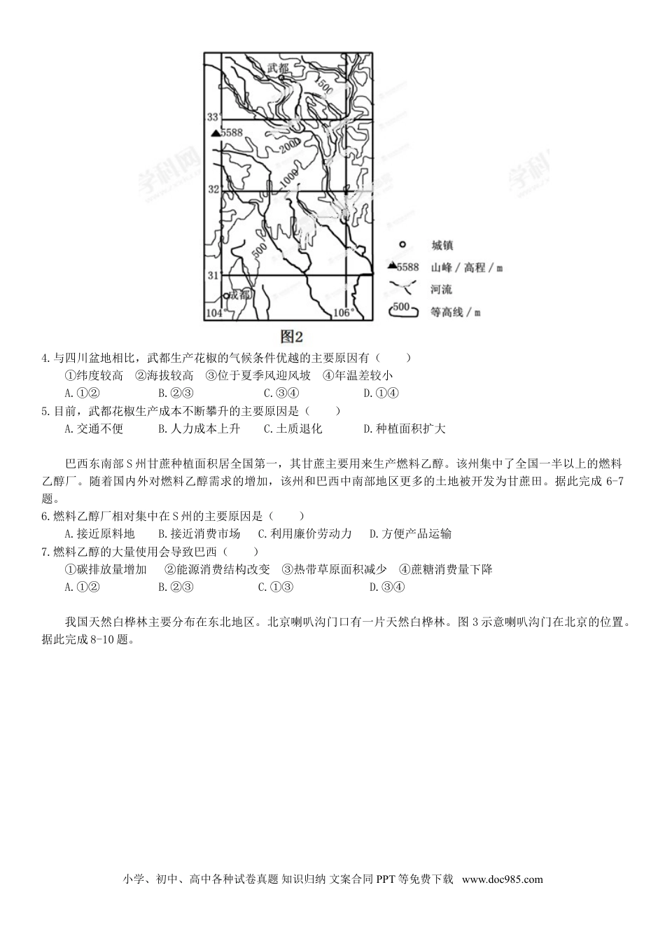 第Ⅰ卷(选择题)本卷共20小题,每小题3分。在每小题给出的四个选项中,只有一项是符合题目要求的。图1为某半岛地形图。读图1,完成1-3题。1.该半岛火山活动频繁,是因为受到()A.太平洋板块张裂的影响B.印度洋板块张裂的影响C.印度洋板块挤压的影响D.太平洋板块挤压的影响2.当地居民稳定的用电来源于()A.地热能B.风能C.水能D.太阳能3.7月份该半岛可能出现()A.冰川与岩浆相映B.极昼C.成群的企鹅D.台风花椒,落叶灌木或小乔木,多刺,喜光,耐寒,耐旱,果实需人工采摘,可用作调料、药材。武都(位置见图2)素有“千年椒乡”之称,古书有“蜀椒出武都”的记载。据此完成4-5题。小学、初中、高中各种试卷真题知识归纳文案合同PPT等免费下载www.doc985.com4.与四川盆地相比,武都生产花椒的气候条件优越的主要原因有()①纬度较高②海拔较高③位于夏季风迎风坡④年温差较小A.①②B.②③C.③④D.①④5.目前,武都花椒生产成本不断攀升的主要原因是()A.交通不便B.人力成本上升C.土质退化D.种植面积扩大巴西东南部S州甘蔗种植面积居全国第一,其甘蔗主要用来生产燃料乙醇。该州集中了全国一半以上的燃料乙醇厂。随着国内外对燃料乙醇需求的增加,该州和巴西中南部地区更多的土地被开发为甘蔗田。据此完成6-7题。6.燃料乙醇厂相对集中在S州的主要原因是()A.接近原料地B.接近消费市场C.利用廉价劳动力D.方便产品运输7.燃料乙醇的大量使用会导致巴西()①碳排放量增加②能源消费结构改变③热带草原面积减少④蔗糖消费量下降A.①②B.②③C.①③D.③④我国天然白桦林主要分布在东北地区。北京喇叭沟门口有一片天然白桦林。图3示意喇叭沟门在北京的位置。据此完成8-10题。小学、初中、高中各种试卷真题知识归纳文案合同PPT等免费下载www.doc985.com8.北京的地带性植被属于()A.常绿阔叶林B.针阔叶混交林C.落叶阔叶林D.针叶林9.喇叭沟门有天然白桦林分布的主导因素是()A.纬度位置B.海陆位置C.大气环流D.地形10.北京香山红叶最佳观赏期一般在10月下旬至11月初,那么,赴喇叭沟门观赏白桦林金黄色树叶美景宜选在()A.9月中旬B.10月上旬C.10月下旬D.11月中旬我国许多聚落名称体现了所处自然环境的特点。黄土高原地区有些聚落名为“XX川”。《现代汉语词典》解释:川地是山间或河流两边的平坦低洼的土地。据此完成11-12题。11.为趋利辟害,这些以“川”为名的聚落选址宜()A.紧邻河岸以方便取水B.接近坡地中部以方便耕作C.靠近坡地上部以防洪水D.远离陡坡以避崩塌、滑坡12.在农业社会,决定这些聚落发展规模的主导条件是()A.河流水量B.土壤肥力C.川地面积D.林木蓄积量地处干旱区的宁夏银川市,其周边地区曾广布湖泊,明清时有“七十二连湖”的说法。20世纪80年代银川周边湖泊所剩无几。1999年开始,银川实施恢复湿地的计划。图4示意银川周围目前的湖泊分布。据此完成13-14题。小学、初中、高中各种试卷真题知识归纳文案合同PPT等免费下载www.doc985.com13.20世纪80年代银川周边湖泊所剩无几的主要原因是()A.泥沙淤积B.气候变暖C.排水造田D.黄河来水量减少14.疏浚、恢复湖泊湿地,对银川环境的直接影响是()①增强城市排污能力②增加城市空气湿度③美化城市环境④增大城市气温年较差A.①②B.②③C.③④D.①④某海洋考察船的航行日志记录:北京时间8时太阳从正东方海面升起;桅杆的影子在正南方时,太阳高度为60°;日落时北京时间为19时45分。据此完成15-17题。15.日志记录当天,该船航行在()A.北太平洋B.南太平洋C.北印度洋D.南印度洋16.日至记录当天,该船的航向可能是()A.正北B.东北C.正南D.西南17.日志记录当天考察船经过的海域,当月的天气状况多为()A.阴雨绵绵、风微浪缓B.晴朗少云、风急浪高C.晴朗少云、风微浪缓D.雷雨频发、风急浪高图5示意我国39°N附近某区域。读图5,完成18-20题。小学、初中、高中各种试卷真题知识归纳文案合同PPT等免费下载www.doc985.com18.图示区域土壤盐渍化最严重的地区是()A.甲B.乙C.丙D.丁19.限制丙地区农业生产的主要因素是()A.光照B.水分C.坡度D.温度20.如果乙地区大规模引水灌溉进行农业开发,将会导致()A.甲地区植被退化B....