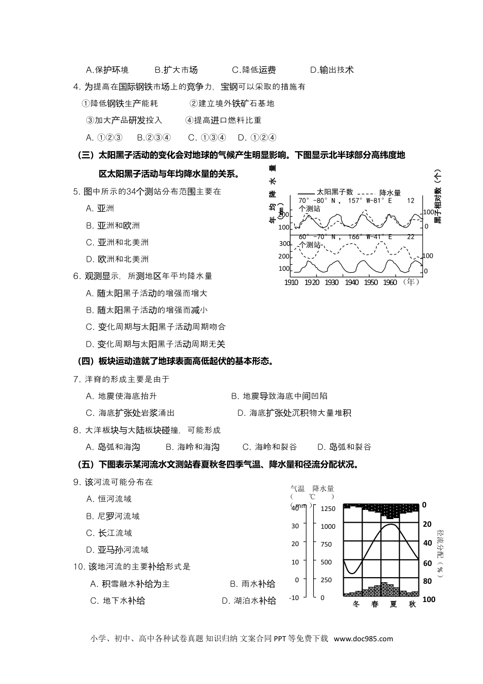2012年普通高等学校招生全国统一考试(上海卷)地理试卷本卷共试10,分页满150分,考试时间120分。全套包括大,第一大;第二大钟两题题为选择题题合分析,包括共同部分和做部分。为综题选考生注意:1.答卷前,必用或字在答正面楚地姓名、准考,核后的形在务钢笔签笔题纸清填写证号并将对条码贴指定位置上,在答反面楚地姓名。题纸清填写2.答案必全部或在答上。所有考生完成第一大和第二大的共同部分。第二大做须凃写题纸应题题题选部分分为A、B,分相同,两组两组试题值A于考手中“任模一”,组对应试册选块B于“任模组对应选块二”,考生任一答。须选组题3.答做部分前,答上做的框用应选应将题纸选组别识别2B涂黑;涂的框必铅笔填组别识别须与实际答一致,如果不一致,以涂的框准,框全或不者得零分。应组别填组别识别为两组识别凃凃一、选择题(共50分,每小题2分。每小题只有一个正确答案)(一)“祖国的宝岛,我可爱的家乡......辽阔的海域无尽的宝藏......”1.岩是我的固有土。右中,表示岩的是黄岛国领图黄岛A.甲岛B.乙岛C.丙岛D.丁岛2.2012年5月,我首座深水井平台在南海首成功,其重要意国钻钻在于义①宣示我南海的主国对权②行使井平台周我海域的管对钻边国辖权③解我目前石油外依存度高的决国对过问题④志我能立行深海油源标国够独进气资开发A.①②③B.①②④C.①③④D.②③④(二)上海宝钢为实施“走出去”战略,将在韩国京畿道投资新建钢材加工配送中心,提供汽车板材仓储、剪切、配送等服务。3.施“走出去”略的主要目的是宝钢实战小学、初中、高中各种试卷真题知识归纳文案合同PPT等免费下载www.doc985.com丁甲乙丙A.保境护环B.大市扩场C.降低运费D.出技输术4.提高在市上的力,可以采取的措施有为国际钢铁场竞争宝钢①降低生能耗钢铁产②建立境外石基地铁矿③加大品投入④提高口燃料比重产研发进A.①②③B.②③④C.①③④D.①②④(三)太阳黑子活动的变化会对地球的气候产生明显影响。下图显示北半球部分高纬度地区太阳黑子活动与年均降水量的关系。5.中所示的图34站分布范主要在个测围A.洲亚B.洲和洲亚欧C.洲和北美洲亚D.洲和北美洲欧6.观示,所地测显测区年平均降水量A.太黑子活的增强而增大随阳动B.太黑子活的增强而小随阳动减C.化周期太黑子活周期吻合变与阳动D.化周期太黑子活周期无变与阳动关(四)板块运动造就了地球表面高低起伏的基本形态。7.洋脊的形成主要是由于A.地震使海底抬升B.地震致海底中凹陷导间C.海底岩涌出扩张处浆D.海底沉物大量堆扩张处积积8.大洋板大板撞,可能形成块与陆块碰A.弧和海岛沟B.海岭和海沟C.海岭和裂谷D.弧和裂谷岛(五)下图表示某河流水文测站春夏秋冬四季气温、降水量和径流分配状况。9.河流可能分布在该A.恒河流域B.尼河流域罗C.江流域长D.河流域亚马孙10.地河流的主要形式是该补给A.雪融水主积补给为B.雨水补给C.地下水补给D.湖泊水补给小学、初中、高中各种试卷真题知识归纳文案合同PPT等免费下载www.doc985.com70°-80°N,157°W-81°E12个测站降水量60°-70°N,166°W-41°E22个测站191019201930194019501960(年)黑子相对数(个)10010010020030020000年均降水量(mm)100太阳黑子数125010007505002500气温降水量(℃)(mm)403020100-10秋冬夏春806020401000径流分配(%)11.地河流的流量最低的月出在该径份现A.1月B.2月C.11月D.12月(六)安徽省南部地处亚热带季风气候区,气候湿热,地形以山地为主,对外交通不便,耕地稀少,当地传统的菜肴、民居、戏曲、农业生产等明显打上了地理环境的烙印。12.安徽省南部特色菜的料多采用传统选较①海鲜②牛羊肉③山货④腊制品腌A.①②B.②③C.①④D.③④13.下列述安徽省南部地域文化特征相符的是叙与A.敬奉祖,盛行祖文化妈妈B.以植茶、竹等特色农业种为C.、秦腔地方曲评剧为传统戏D.泥草房和吊脚是民居楼传统(七)等高线地形图可以帮助人们正确认识地形地貌。14.右所示地地形地的基本特点是图区势①以丘陵、平原主②中部高,西南、北低为东③以平原、盆地主④中部低,西南、北高为东A.③④B.②③C.①②D.①④15.中甲、乙所在的地形部位分是图两条虚线别A.山脊、山谷B....