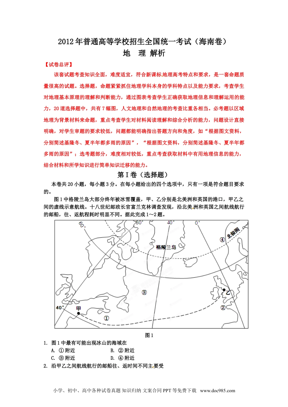2012年普通高等学校招生全国统一考试(海南卷)地理解析【试卷总评】该套试题考查知识全面,难度适宜,符合新课标地理高考特点和要求,是一套命题质量很高的试题。选择题,命题紧紧抓住地理学科本身的学科特点以及能力要求,考查学生对地理基本原理的理解和判断能力,通过图表考查学生正确获取地理信息和理解运用的能力,20道选择题中,共有7幅图,人文地理和自然地理的考查比重各相当。必考题以区域地理为背景材料来命题,重点考查学生对材料阅读理解和综合分析的能力,问题设计直接明确,对学生审题的要求较低,问题都能明确指出答题方向和角度,如“根据图文资料,分别简述基隆冬、夏半年都多雨的原因”,“根据图文资料,分别简述基隆冬、夏半年都多雨的原因”;选考题部分,难度相对较低,重点考查获取材料中有用地理信息的能力,结合材料和所学知识进行简单知识迁移的能力。第I卷(选择题)本卷共20小题,每小题3分。在每小题给出的四个选项中,只有一项是符合题目要求的。图1中格陵兰岛大部分终年被冰雪覆盖,甲、乙分别是北美洲和英国的港口,甲乙之间的虚线示意航线。十八世纪邮政长官富兰克林调查发现,沿北美洲和英国之间航线航行的邮船,往、返航程耗时明显不同。据此完成1~2题。图11.图1中最有可能出现冰山的海域在A.①附近B.②附近C.③附近D.④附近2.沿甲乙之间航线航行的邮船往、返时间不同主要受小学、初中、高中各种试卷真题知识归纳文案合同PPT等免费下载www.doc985.comA.海浪的影响B.暖流的影响C.海风的影响D.寒流的影响2011年我国某脐橙主产区脐橙喜获丰收,但市场销售情况迥异。普通脐橙价格低,滞销。经过改良的精品优质脐橙价格高,却供不应求。据此完成3~4题。3.该地普通脐橙滞销的主要原因有①品种退化②产量过大③品质较差④销售渠道不畅A.②B.②③C.①④D.②④4.为提高该地脐橙种植业的整体竞争力,亟需A.提高产量B.改善运输条件C.推广良种D.扩大销售渠道[来源:学,科,网Z,X,X,K]图2示意挪威位置和地形。挪威是世界上水能资源开发较充分的国家。该国大型水电站多为高水头(电站水库水位与发电机组所在位置高差大)电站。据此完成5~7题。小学、初中、高中各种试卷真题知识归纳文案合同PPT等免费下载www.doc985.com5.挪威大型水电站多为高水头电站的主要原因是该国A.海岸线曲折,多峡湾B.多山地,河流落差大C.地形平坦,水网密布D.河湖众多,少泥沙6.挪威为建高水头电站而修建的水库A.很少引发库区移民B.水位季节波动较小C.占用大量耕地D.可以保护鱼类和其他野生动物7.挪威消耗民用电最多的是A.照明B.制冷C.取暖D.烹饪自20世纪60年代,甲国开始在临近乙国边境的地区设立边境工业区,吸引乙国的企业来此投资建厂,并从乙国进口原料和零部件,加工、组装成品后再销往乙国。目前,这些边境工业区已发展成规模不等的工业中心(见图3)。据此完成8~10题小学、初中、高中各种试卷真题知识归纳文案合同PPT等免费下载www.doc985.com8.据图文资料推断,与乙国相比,甲国[来源:Zxxk.Com]A.劳动力价格较低B.技术水平较高C.消费市场较广D.资金较雄厚9.影响甲国边境工业区区位选择的主导因素是A.廉价劳动力B.交通运输C.研发能力D.环境质量10.甲国边境工业区的发展,提高了A.乙国的劳动生产率B.甲国的环境质量C.乙国的就业率D.甲国的城镇化水平图4a是2005年某城市新区规划图。针对规划实施中出现的一些问题,2010年对原规划进行了修编(图4b)。该城市盛行西北风。据此完成11~13题。小学、初中、高中各种试卷真题知识归纳文案合同PPT等免费下载www.doc985.com0°100°30°N110°11.按主导职能,该新区规划为A.居住区B.文化区C.政务区D.工业区12.在图4b中的M处适宜修建A.自来水厂B.垃圾焚烧厂C.污水处理厂D.热电厂[来源:学+科+网Z+X+X+K]13.据图文资料推测,该新区规划实施中出现的主要问题是A.交通拥堵B.环境破坏严重C.公共服务配套不足D.工业用地不足表1为我国某区域1999年主要土地覆被类型的面积。图5示意该区域1999~2007年土地覆被类型面积变化率,正值表示增长,负值表示减少。该区域生态环境已呈退化趋势据此完成14~15题。小学、初中、高中各种试卷真题知识...