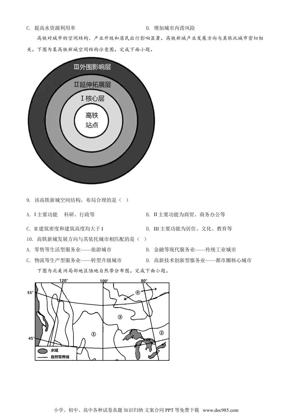 2022年1月浙江省高考地理选考试卷一、选择题1(本大题共20小题,每小题2分,共40分。每小题列出的四个备选项中只有一个是符合题目要求的,不选、多选、错选均不得分)1.农业生产中地膜覆盖对土壤理化性状的主要作用是()①保持土壤温度②减少水肥流失③增加土壤厚度④改善土壤质地A.①②B.①④C.②③D.③④下表为我国某研究机构发布的农田、湿地、森林、草原四种生态系统的单位面积生态服务价值,数值越大表示生态服务价值越高。完成下面小题。生态系统生态服务功能①②③④调节气候2.70.90.917.1涵养水源3.20.80.615.5净化水中污染物1.31.31.618.2保护生物多样性3.31.10.72.52.表中①至④依次是()A.农田湿地森林草原B.森林农田湿地草原C.森林草原农田湿地D.草原湿地森林农田3.湿地开发利用中,生态服务价值下降最明显的是()A.休闲垂钓B.滩涂观光C.移植红树林D.水稻田养蟹4.以下地貌景观主要由风化作用形成的是()小学、初中、高中各种试卷真题知识归纳文案合同PPT等免费下载www.doc985.comA.①③B.①④C.②③D.②④近年来,随着大豆种植面积迅速扩大及生物技术的运用,巴西已成为世界最大的大豆生产国和出口国。完成下面小题。5.巴西成为世界最大的大豆出口国,其主要原因为()A.海运价格下降B.国际市场需求大C.土地资源丰富D.劳动力数量增加6.巴西大豆主产区的农业生产属于()A.混合型农业B.商品性农业C.有机农业D.热带种植园农业下图为北美洲局部地区略图。完成下面小题。7.与旧金山比,洛杉矶水资源较少的主要原因是()A.气温较高,蒸发量大B.山脉阻挡,降水量小C.洋流影响,降温减湿D.河流短少,径流量小8.从区域外调水对洛杉矶的影响有()A.减少城市水分蒸发B.减轻城市地质灾害小学、初中、高中各种试卷真题知识归纳文案合同PPT等免费下载www.doc985.comC.提高水资源利用率D.增加城市内涝风险高铁对城市的空间结构、产业升级和居民出行影响显著。高铁新城产业发展方向与其依托城市密切相关。下图为某高铁新城空间结构示意图。完成下面小题。9.该高铁新城空间结构,布局合理的是()A.I主要功能为科研、行政等B.II主要功能为商贸、商务办公等C.Ⅱ建筑密度和建筑高度均大于ID.III主要功能为居住、文化、教育等10.高铁新城发展方向与其依托城市相匹配的是()A.零售等生活型服务业——旅游城市B.金融等现代服务业——传统工业城市C.物流等生产型服务业——转型升级城市D.高新技术创新型服务业——都市圈核心城市下图为北美洲局部地区陆地自然带分布图。完成下面小题。小学、初中、高中各种试卷真题知识归纳文案合同PPT等免费下载www.doc985.com11.图中①②自然带分别是()A.温带荒漠带、亚寒带针叶林带B.温带草原带、温带落叶阔叶林带C.亚寒带针叶林带、温带落叶阔叶林带D.温带草原带、亚热带常绿阔叶林带12.图中②③④自然带分布体现了()A.纬度地带分异规律B.垂直分异规律C.干湿度地带分异规律D.地方性分异规律下图为某区域某月等压线图。完成下面小题。13.图中①②海区该月洋流流向分别为()A.西北向东南、西北向东南B.东南向西北、东南向西北C.西北向东南、东南向西北D.东南向西北、西北向东南14.图示季节()A.田纳西河正处于主汛期B.南非大草原上郁郁葱葱C.天山积雪下限海拔较高D.华北平原播种小麦正忙下图为某地近地面等压线图,图中箭头表示甲地风向及受力情况。完成下面小题。15.表示摩擦力的箭头是()A.aB.bC.cD.d小学、初中、高中各种试卷真题知识归纳文案合同PPT等免费下载www.doc985.com16.乙天气系统的气流运动方向是()①顺时针②逆时针③上升④下沉A.①③B.①④C.②③D.②④下图为某区域地质构造平面图,图中主体构造为向斜,地形以山地为主,经外力长期侵蚀,地形起伏不大。沉积岩颗粒物粗细与沉积环境中的水深有关,水越深,颗粒物越细。完成下面小题。17.若甲地附近发育有小河,其最可能流向()A.东北B.西南C.西北D.东南18.关于地层新老与沉积环境的叙述,正确的是()①b比c老②bc期间,海岸线向海洋后退③b比c新④bc期间,海岸线向陆地前进A.②B.①④C.②③D.③④摄影爱好者在南半球某地朝西北固定方向拍摄太阳照片,拍摄时间为K日及其前...