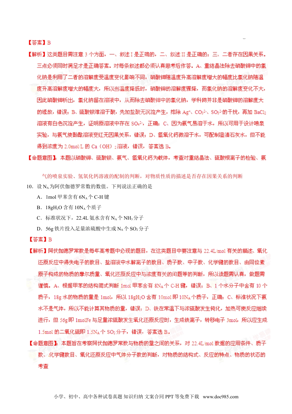 【试卷总评】一、单选题7.生活中处处有化学。下列说法正确的是A.制饭勺、饭盒、高压锅等的不锈钢是合金B.做衣服的棉和麻均与淀粉互为同分异构体C.煎炸食物的花生油和牛油都是可皂化的饱和酯类D.磨豆浆的大豆富含蛋白质,豆浆煮沸后蛋白质变成了氨基酸小学、初中、高中各种试卷真题知识归纳文案合同PPT等免费下载www.doc985.com8.水溶液中能大量共存的一组离子是A.Na+、Ca2+、Cl-、SO42-B.Fe2+、H+、SO32-、ClO-C.Mg2+、NH4+、Cl-、SO42-D.K+、Fe3+、NO3-、SCN-9.下列叙述I和II均正确并有因果关系的是选项叙述I叙述IIAKNO3的溶解度大[来源:学.科.网Z.X.X.K]用重结晶法除去KNO3中混有的NaClBBaSO4难溶于酸用盐酸和BaCl2溶液检验SO42-CNH3能使酚酞溶液变红NH3可用于设计喷泉实验D[来源:Z_xx_k.Com]Ca(OH)2能制成澄清石灰水[来源:Zxxk.Com]可配制2.0mol∙L-1的Ca(OH)2溶液小学、初中、高中各种试卷真题知识归纳文案合同PPT等免费下载www.doc985.com气的喷泉实验、氢氧化钙溶液的配制的判断,对物质性质的描述是否存在因果关系的判断10.设NA为阿伏伽德罗常数的数值。下列说法正确的是A.1mol甲苯含有6NA个C-H键B.18gH2O含有10NA个质子C.标准状况下,22.4L氨水含有NA个NH3分子D.56g铁片投入足量浓硫酸中生成NA个SO2分子小学、初中、高中各种试卷真题知识归纳文案合同PPT等免费下载www.doc985.com11.某同学组装了图4所示的电化学装置电极I为Al,其他电极均为Cu,则[来源:学科网]小学、初中、高中各种试卷真题知识归纳文案合同PPT等免费下载www.doc985.com学。科。网]二、双选题22.下列实验操作、现象和结论均正确的是选项实验操作现象结论A向苏打和小苏打溶液中分别加入盐酸均冒气泡两者均能与盐酸反应B向AgNO3溶液中滴加过量氨水溶液澄清Ag+与NH3H2O能大量共存C将可调高度的铜丝伸入到稀NHO3中溶液变蓝Cu与稀HNO3发生置换反应小学、初中、高中各种试卷真题知识归纳文案合同PPT等免费下载www.doc985.comD将KI和FeCl3溶液在试管中混合后,加入CCl4,震荡,静置下层溶液显紫红色氧化性:Fe3+>I223.甲~辛等元素在周期表中的相对位置如下表。甲和戊的原子序数相差3,戊的一种单质是自然界硬度最大的物质,丁和辛属同周期元素。下列判断正确的是()小学、初中、高中各种试卷真题知识归纳文案合同PPT等免费下载www.doc985.com30.(15分)不饱和酯类化合物在药物、涂料等领域应用广泛。(1)下列关于化合物I的说法,正确的是A.与FeCl3溶液可能显紫色B.可能发生酯化反应和银镜反应C.能与溴发生取代和加成反应D.1mol化合物I最多与2molNaOH反应(2)反应①的一种由烯烃直接制备不饱和酯的新方法①化合物II的分子式为。1mol化合物II能与molH2恰好反应生成饱和烃类化合物。(3)化合物II可由芳香族化合物III或IV分别通过消去反应获得。但只有III能与Na反应产生H2。III的结构简式为(写1种);由IV生成II的反应条件为。[来源:学*科*网](4)聚合物可用于制备涂料。其单体的结构简式为。利用类似反应①的方法仅以乙烯为有机原料合成该单体,涉及的反应方程式为。小学、初中、高中各种试卷真题知识归纳文案合同PPT等免费下载www.doc985.com小学、初中、高中各种试卷真题知识归纳文案合同PPT等免费下载www.doc985.com31.(16分)用CaSO4代替O2与燃料CO反应,既可以提高燃烧效率,又能得到高纯CO2,是一种高效、清洁、经济的新型燃烧技术,反应①为主反应,反应②和③为副反应。①1/4CaSO4(s)+CO(g)1/4CaS(s)+CO2(g)△H1=-47.3kJ/mol②CaSO4(s)+CO(g)CaO(s)+CO2(g)+SO2(g)△H2=+210.5kJ/mol③CO(g)1/2C(s)+1/2CO2(g)△H3=-86.2kJ/mol(1)反应2CaSO4(s)+7CO(g)CaS(s)+CaO(s)+C(s)+6CO2(g)+SO2(g)的△H=(用△H1△H2△H3表示)。[来源:学|科|网](4)为减少副产物,获得更纯净的CO2,可在初始燃料中适量加入。(5)以反应①中生成的CaS为原料,在一定条件下经原子利用率100%的高温反应,可再生成CaSO4,该反应的化学方程式为;在一定条件下CO2可与对二甲苯反应,在其苯环上引入一个羧基,产物的结构简式为。小学、初中、高中各种试卷真题知识归纳文案合同PPT等免费下载www.doc985...