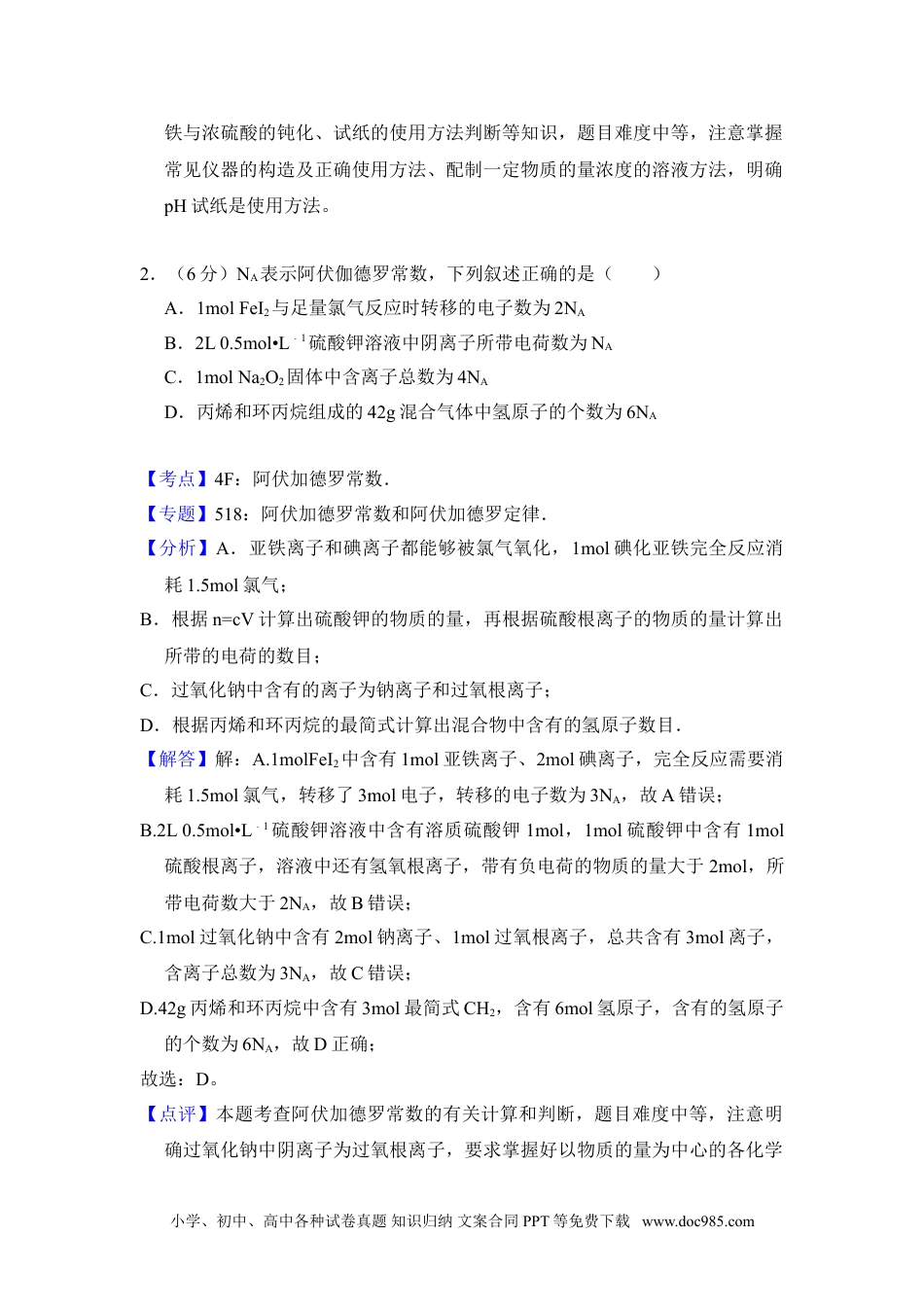 2014年全国统一高考化学试卷(大纲版)参考答案与试题解析一、选择题:本大题共8小题,每小题6分.在每小题给出的四个选项总,只有一项是符合题目要求的.1.(6分)下列叙述正确的是()A.锥形瓶可用作加热的反应器B.室温下,不能将浓硫酸盛放在铁桶中C.配制溶液定容时,俯视容量瓶刻度会使溶液浓度偏高D.用蒸馏水润湿的试纸测溶液的pH,一定会使结果偏低【考点】N2:间接加热的仪器及使用方法;O2:化学试剂的存放;O5:试纸的使用;O9:溶液的配制.菁优网版权所有【专题】25:实验评价题.【分析】A.锥形瓶可用于加热,加热时需要垫上石棉网;B.浓硫酸在室温下能够与铁发生钝化,阻止了铁与浓硫酸的反应;C.容量瓶只有刻度线;D.需要根据溶液的酸碱性进行判断,如果溶液为酸性溶液,稀释后溶液的pH偏高,如果为中性溶液,溶液的pH不变。【解答】解:A.锥形瓶在制取气体的简易装置中经常作反应容器,不过加热时需要垫上石棉网,故A正确;B.室温下,由于铁与浓硫酸发生钝化,所以能将浓硫酸盛放在铁桶中,故B错误;C.容量瓶只有刻度线,没有刻度,故C错误;D.用蒸馏水润湿的试纸测溶液的pH,若待测液为碱性溶液,则测定结果偏低;若待测液为中性溶液,测定结果不变,若待测液为酸性溶液,测定结果会偏高,所以测定结果不一定偏低,故D错误;故选:A。【点评】本题考查了常见仪器的使用方法、一定物质的量浓度的溶液配制方法、小学、初中、高中各种试卷真题知识归纳文案合同PPT等免费下载www.doc985.com铁与浓硫酸的钝化、试纸的使用方法判断等知识,题目难度中等,注意掌握常见仪器的构造及正确使用方法、配制一定物质的量浓度的溶液方法,明确pH试纸是使用方法。2.(6分)NA表示阿伏伽德罗常数,下列叙述正确的是()A.1molFeI2与足量氯气反应时转移的电子数为2NAB.2L0.5mol•L1﹣硫酸钾溶液中阴离子所带电荷数为NAC.1molNa2O2固体中含离子总数为4NAD.丙烯和环丙烷组成的42g混合气体中氢原子的个数为6NA【考点】4F:阿伏加德罗常数.菁优网版权所有【专题】518:阿伏加德罗常数和阿伏加德罗定律.【分析】A.亚铁离子和碘离子都能够被氯气氧化,1mol碘化亚铁完全反应消耗1.5mol氯气;B.根据n=cV计算出硫酸钾的物质的量,再根据硫酸根离子的物质的量计算出所带的电荷的数目;C.过氧化钠中含有的离子为钠离子和过氧根离子;D.根据丙烯和环丙烷的最简式计算出混合物中含有的氢原子数目.【解答】解:A.1molFeI2中含有1mol亚铁离子、2mol碘离子,完全反应需要消耗1.5mol氯气,转移了3mol电子,转移的电子数为3NA,故A错误;B.2L0.5mol•L1﹣硫酸钾溶液中含有溶质硫酸钾1mol,1mol硫酸钾中含有1mol硫酸根离子,溶液中还有氢氧根离子,带有负电荷的物质的量大于2mol,所带电荷数大于2NA,故B错误;C.1mol过氧化钠中含有2mol钠离子、1mol过氧根离子,总共含有3mol离子,含离子总数为3NA,故C错误;D.42g丙烯和环丙烷中含有3mol最简式CH2,含有6mol氢原子,含有的氢原子的个数为6NA,故D正确;故选:D。【点评】本题考查阿伏加德罗常数的有关计算和判断,题目难度中等,注意明确过氧化钠中阴离子为过氧根离子,要求掌握好以物质的量为中心的各化学小学、初中、高中各种试卷真题知识归纳文案合同PPT等免费下载www.doc985.com量与阿伏加德罗常数的关系,选项D为易错点,注意根据最简式计算混合物中含有氢原子、碳原子的数目的方法.3.(6分)下列叙述错误的是()A.SO2使溴水褪色与乙烯使KMnO4溶液褪色的原理相同B.制备乙酸乙酯时可用热的NaOH溶液收集产物以除去其中的乙酸C.用饱和食盐水替代水跟电石反应,可以减缓乙炔的产生速率D.用AgNO3溶液可以鉴别KCl和KI【考点】CA:化学反应速率的影响因素;F5:二氧化硫的化学性质;PS:物质的检验和鉴别的基本方法选择及应用;U5:化学实验方案的评价.菁优网版权所有【专题】52:元素及其化合物.【分析】A.SO2能与溴水发生氧化还原反应;乙烯能与KMnO4溶液发生氧化还原反应;B.乙酸乙酯在热的NaOH溶液中会发生水解;C.用饱和食盐水替代水,相当于降低了水的浓度;D.AgNO3溶液与KCl反应生成白色沉淀;AgNO3溶液与...