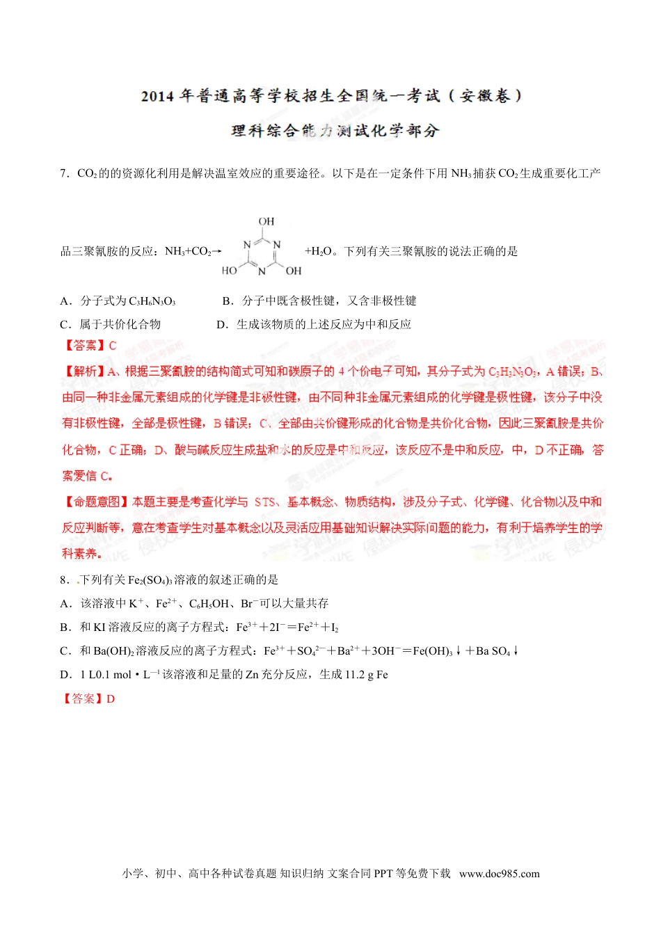 7.CO2的的资源化利用是解决温室效应的重要途径。以下是在一定条件下用NH3捕获CO2生成重要化工产品三聚氰胺的反应:NH3+CO2→+H2O。下列有关三聚氰胺的说法正确的是A.分子式为C3H6N3O3B.分子中既含极性键,又含非极性键学科网C.属于共价化合物D.生成该物质的上述反应为中和反应8.下列有关Fe2(SO4)3溶液的叙述正确的是A.该溶液中K+、Fe2+、C6H5OH、Br-可以大量共存[来源:学_科_网]B.和KI溶液反应的离子方程式:Fe3++2I-=Fe2++I2C.和Ba(OH)2溶液反应的离子方程式:Fe3++SO42—+Ba2++3OH-=Fe(OH)3↓+BaSO4↓D.1L0.1mol·L—1该溶液和足量的Zn充分反应,生成11.2gFe【答案】D小学、初中、高中各种试卷真题知识归纳文案合同PPT等免费下载www.doc985.com9.为实现下列实验目的,依据下表提供的主要仪器,所用试剂合理的是选项实验目的主要仪器试剂A分离Br2和CCl4混合物分液漏斗、烧杯Br2和CCl4混合物、蒸馏水B鉴别葡萄糖和蔗糖试管、烧杯、酒精灯葡萄糖溶液、蔗糖溶液、银氨溶液C实验室制取H2试管、带导管的橡皮塞锌粒、稀HNO3学科网D测定NaOH溶液浓度滴定管、锥形瓶、烧杯NaOH溶液,0.1000mol/L盐酸【答案】B10.臭氧是理想的烟气脱硝剂,其脱硝反应为:2NO2(g)+O3(g)N2O5(g)+O2(g),反应在恒容密闭容器中进行,下列由该反应相关图像作出的判断正确的是AB[来源:学,科,网Z,X,X,K]CD升高温度,平衡常数减小0~3s内,反应速率为:t1时仅加入催化剂,平达平衡时,仅改变x,小学、初中、高中各种试卷真题知识归纳文案合同PPT等免费下载www.doc985.comv(NO2)=0.2mol·L-1衡正向移动则x为c(O2)【答案】A[来源:学&科&网]浓度对反应速率和平衡的影响,侧重考查图像分析,属于中等难度试题的考查,意在考查学生严谨的逻辑思维能力和分析问题、解决问题的能力。11.室温下,下列溶液中粒子浓度大小关系正确的是A.Na2S溶液:c(Na+)>c(HS-)>c(OH-)>c(H2S)B.Na2C2O4溶液中:c(OH-)=c(H+)+c(HC2O4-)+2c(H2C2O4)学科网C.Na2CO3溶液:c(Na+)+c(H+)=2c(CO32-)+c(OH-)D.CH3COONa和CaCl2混合溶液:c(Na+)+c(Ca2+)=c(CH3COO-)+c(CH3COOH)+2c(Cl-)【答案】B12.中学化学中很多“规律”都有适用范围,下列根据有关“规律”推出的结论正确的是选项规律结论A较强酸可以制取较弱酸次氯酸溶液无法制取盐酸B反应物浓度越大,反应速率越快常温下,相同的铝片中分别加入足量的浓、稀硝酸,浓硝酸中铝片先溶解完C结构和组成相似的物质,沸点随相对分子质量增大而升高NH3沸点低于PH3小学、初中、高中各种试卷真题知识归纳文案合同PPT等免费下载www.doc985.comD溶解度小的沉淀易向溶解度更小的沉淀转化[来源:学科网]ZnS沉淀中滴加CuSO4溶液可以得到CuS沉淀【答案】DD正确,答案选D。【命题意图】本题主要是考查化学反应基本原理的应用,涉及较强酸制备较弱酸、反应物浓度对对反应速率的影响、氢键对物质性质的影响以及溶解平衡应用等,侧重考查学生综合运用所学化学知识解决相关化学问题的能力。13.室温下,在0.2mol/LAl2(SO4)3溶液中,逐滴加入1.0mol/LNaOH溶液,实验测得溶液pH随NaOH溶液体积变化曲线如下图,下列有关说法正确的是A.a点时,溶液呈酸性的原因是Al3+水解,离子方程式为:[来源:学*科*网Z*X*X*K]Al3++3OH-Al(OH)3[来源:学科网ZXXK]B.a→b段,溶液pH增大,Al3+浓度不变学科网C.b→c段,加入的OH-主要用于生成Al(OH)3沉淀D.d点时,Al(OH)3沉淀开始溶解【答案】C25.(14分)Na、Cu、O、Si、S、Cl是常见的六种元素。(1)Na位于元素周期表第周期第族;S的基态原子核外有个未成对电子;Si的基态原子核外小学、初中、高中各种试卷真题知识归纳文案合同PPT等免费下载www.doc985.com电子排布式为。(2)用“>”或“<”填空:第一电离能[来源:学&科&网]离子半径熔点酸性SiSO2-Na+NaClSiH2SO4HClO4(3)CuCl(s)与O2反应生成CuCl2(s)和一种黑色固体。在25℃、101KPa下,已知该反应每消耗1molCuCl2(s),放热44.4KJ,该反应的热化学方程式是。(4)ClO2是常用于水的净化,工业上可用Cl2氧化NaClO2溶液制取ClO2。写出该反应的离子方程式,并标出电子转移的方向和数目...