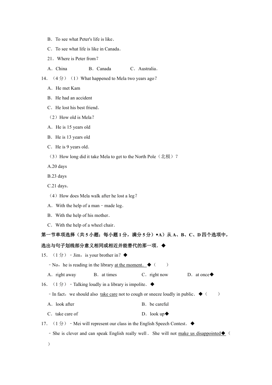 2011年湖北省黄冈市中考英语试卷一、听力(共二节,计25分)1.(1分)A.CollectingstampsB.CollectingshellsC.Collectingcoins.2.(1分)A.PaulismoreoutgoingB.Paulissmarter.C.Paulisquieter.3.(1分)A.Sheisaworker.B.SheisapolicewomanC.Sheisabankclerk.4.(1分)A.InthestreetB.InasupermarketC.Inthelibrary.5.(1分)A.ThecountrysideB.SummercampC.Thebeach.6.(1分)A.At8:10B.At7:15C.At7:30.7.(1分)A.PlayingcomputergamesB.WatchingTVC.Cleaningthehouse.8.(1分)A.Byplane.B.Bybus.C.Bytrain.9.(1分)A.They'rewatchingamovieB.They'rewaitingtobuyticketsC.They'redrawingapicture.10.(2分)(1)Whoisthevisitor?A.Mr.JohnsonB.JaneJohnsonC.JaneMcDonald.(2)Whattimeistheappointment?A.9:30B.10:30C.11:30.11.(3分)(1)Whenwillthechessclassesstart?A.OnJuly6thB.OnMarch16thC.OnAugust20th.(2)Howoftenwillalearnergotothechessclass?A.OnceaweekB.TwiceaweekC.Threetimesaweek.(3)Howmuchwillamemberofthechessclubpayforallthelessons?A.¥450B.¥350C.¥600.12.(3分)听第12段材料,回答第15﹣17小题.15.Whataretheytalkingabout?A.GoingboatingB.GoinghikingC.Climbingthemountain.16.Whatdoestheboyadvisethegirltodo?A.TotakemoreexerciseB.TohaveagoodrestC.Tostayathome.17.Whommaythegirlgowith?A.TheboyB.HerfriendsC.Herstudents.13.(4分)听第13段材料,回答第18﹣21小题.18.WhowillcometotheEnglishclasses?A.AforeignladyB.Theman'sfriendC.Thewoman'ssister.19.Whenwillthepersonthey'retalkingaboutcome?A.TomorroweveningB.ThisafternoonC.Tomorrowmorning.20.Whydoesthepersonthey'retalkingaboutcome?A.ToseewhatlifeislikeinChina.B.ToseewhatPeter'slifeislike.C.ToseewhatlifeislikeinCanada.21.WhereisPeterfrom?A.ChinaB.CanadaC.Australia.14.(4分)(1)WhathappenedtoMelatwoyearsago?A.HemetKamB.HehadanaccidentC.Helosthisbestfriend.(2)HowoldisMela?A.Heis15yearsoldB.Heis13yearsoldC.Heis9yearsold.(3)HowlongdidittakeMelatogettotheNorthPole(北极)?A.20daysB.23daysC.21days.(4)HowdoesMelawalkafterhelostaleg?A.Withthehelpofaman﹣madeleg.B.Withthehelpofhismother.C.Withthehelpofawheelchair.第一节单项选择(共5小题;每小题1分,满分5分)A)从A、B、C、D四个选项中,选出与句子划线部分意义相同或相近并能替代的那一项.15.(1分)﹣Jim,isyourbrotherin?﹣No,heisreadinginthelibraryatthemoment.()A.rightawayB.attimesC.rightnowD.atonce16.(1分)﹣Talkingloudlyinalibraryisimpolite.﹣Infact,weshouldalsotakecarenottocoughorsneezeloudlyinpublic.()A.lookafterB.becarefulC.takecareofD.lookup17.(1分)﹣MeiwillrepresentourclassintheEnglishSpeechContest.﹣SheiscleverandcanspeakEnglishreallywell.Shewillnotmakeusdisappointed()A.knockintousB.careaboutusC.letusdownD.helpusout18.(1分)﹣LiNawonthetennischampionshipintheFrenchOpenonJune4,2011.﹣Wetakeprideinher.SheisthefirstAsianprofessionaltennisplayertowinit.()A.areinterestedinB.areterrifiedofC.areproudofD.areusedto19.(1分)﹣Sowheredoyouwanttogo,Tina?﹣Let'sgototheBlueLagoon.Thesoftmusicmakesmerelaxed.()A.exhaustedandsleepyB.calmandcomfortableC.activeandenergeticD.tenseanddisgustedB)从A、B、C、D四个选项中,选出可填入空白处的最佳选项。20.(1分)Asweknow,EnglandisEuropeancountryandSingaporeisAsiancountry.()A.an;anB.an;aC.a;aD.a;an21.(1分)﹣JackieChanhasdonateddollarstocharit...
