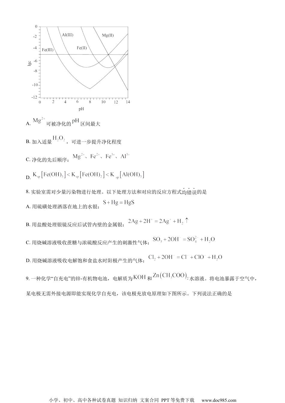 小学、初中、高中各种试卷真题知识归纳文案合同PPT等免费下载www.doc985.com福建省2022年高考化学试题1.福建多个科研机构经过长期联合研究发现,使用和改性的基催化剂,可打通从合成气经草酸二甲酯常压催化加氢制备乙二醇的技术难关。下列说法正确的是A.草酸属于无机物B.与石墨互为同分异构体C.属于过渡元素D.催化剂通过降低焓变加快反应速率2.络塞维是中药玫瑰红景天中含有的一种天然产物,分子结构见下图。关于该化合物下列说法正确的是A.不能发生消去反应B.能与醋酸发生酯化反应C.所有原子都处于同一平面D.络塞维最多能与反应3.常温常压下,电化学还原制氨气的总反应方程式:,设为阿伏加德罗常数的值,下列说法正确的是A.水中含有的孤电子对数为B.每产生失去的电子数为C.氨水中,含有的分子数少于D.消耗(己折算为标况)时,产生的分子数为4.某非线性光学晶体由钾元素(K)和原子序数依次增大的X、Y、Z、W四种短周期元素组成。X与Y、Z与W均为同周期相邻元素,X的核外电子总数为最外层电子数的2倍,Z为地壳中含量最多的元素。下列说法正确的是A.简单氢化物沸点:B.分子的空间构型为三角锥形小学、初中、高中各种试卷真题知识归纳文案合同PPT等免费下载www.doc985.comC.原子半径:D.最高价氧化物对应水化物的碱性:5.探究醋酸浓度与电离度关系的步骤如下,与相关步骤对应的操作或叙述正确的步骤操作或叙述AⅠ.用标准溶液标定醋酸溶液浓度滴定时应始终注视滴定管中的液面BⅡ.用标定后的溶液配制不同浓度的醋酸溶液应使用干燥的容量瓶CⅢ.测定步骤Ⅰ中所得溶液的应在相同温度下测定DⅣ.计算不同浓度溶液中醋酸的电离度计算式为A.AB.BC.CD.D6.用铬铁合金(含少量单质)生产硫酸铬的工艺流程如下:下列说法错误的是A.“浸出”产生的气体含有B.“除杂”的目的是除去元素C.流程中未产生六价铬化合物D.“滤渣2”的主要成分是7.锂辉石是锂的重要来源,其焙烧后的酸性浸出液中含有和杂质离子,可在0~14范围内调节对其净化(即相关离子浓度)。时,与关系见下图(碱性过强时和会部分溶解)。下列说法正确的是小学、初中、高中各种试卷真题知识归纳文案合同PPT等免费下载www.doc985.comA.可被净化的区间最大B.加入适量,可进一步提升净化程度C.净化的先后顺序:D.8.实验室需对少量污染物进行处理。以下处理方法和对应的反应方程式均错误的是A.用硫磺处理洒落在地上的水银:B.用盐酸处理银镜反应后试管内壁的金属银:C.用烧碱溶液吸收蔗糖与浓硫酸反应产生的刺激性气体:D.用烧碱溶液吸收电解饱和食盐水时阳极产生的气体:9.一种化学“自充电”的锌-有机物电池,电解质为和水溶液。将电池暴露于空气中,某电极无需外接电源即能实现化学自充电,该电极充放电原理如下图所示。下列说法正确的是小学、初中、高中各种试卷真题知识归纳文案合同PPT等免费下载www.doc985.comA.化学自充电时,增大B.化学自充电时,电能转化为化学能C.化学自充电时,锌电极反应式:D.放电时,外电路通过电子,正极材料损耗10.氨是水体污染物的主要成分之一,工业上可用次氯酸盐作处理剂,有关反应可表示为:①②在一定条件下模拟处理氨氮废水:将的氨水分别和不同量的混合,测得溶液中氨去除率、总氮(氨氮和硝氮的总和)残余率与投入量(用x表示)的关系如下图所示。下列说法正确的是小学、初中、高中各种试卷真题知识归纳文案合同PPT等免费下载www.doc985.comA.的数值为0.009B.时,C.时,x越大,生成的量越少D.时,11.粉煤灰是火电厂的大宗固废。以某电厂的粉煤灰为原料(主要含和等)提铝的工艺流程如下:回答下列问题:(1)“浸出”时适当升温的主要目的是_______,发生反应的离子方程式为_______。(2)“浸渣”的主要成分除残余外,还有_______。实验测得,粉煤灰(的质量分数为)经浸出、干燥后得到“浸渣”(的质量分数为),的浸出率为_______。(3)“沉铝”时,体系中三种物质的溶解度曲线如下图所示,加入沉铝的目的是_______,“沉铝”的最佳方案为_______。小学、初中、高中各种试卷真题知识归纳文案合同PPT等免费下载www.doc985.com(4)“焙烧”时,主要反应的化学方程式为_______。(5)“水浸”后得到的“滤液2”可返回...