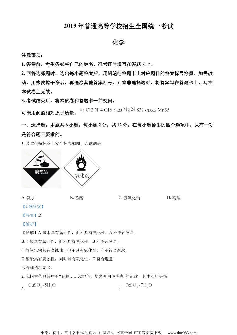 小学、初中、高中各种试卷真题知识归纳文案合同PPT等免费下载www.doc985.com2019年普通高等学校招生全国统一考试化学注意事项:1.答卷前,考生务必将自己的姓名、准考证号填写在答题卡上。2.回答选择题时,选出每小题答案后,用铅笔把答题卡上对应题目的答案标号涂黑。如需改动,用橡皮擦干净后,再选涂其他答案标号。回答非选择题时,将答案写在答题卡上。写在本试卷上无效。3.考试结束后,将本试卷和答题卡一并交回。可能用到的相对原子质量:一、选择题:本题共6小题,每小题2分,共12分,在每小题给出的四个选项中,只有一项是符合题目要求的。1.某试剂瓶标签上安全标志如图,该试剂是A.氨水B.乙酸C.氢氧化钠D.硝酸【1题答案】【答案】D【解析】【详解】A.氨水具有腐蚀性,但不具有氧化性,A不符合题意;B.乙酸具有腐蚀性,但不具有氧化性,B不符合题意;C.氢氧化钠具有腐蚀性,但不具有氧化性,C不符合题意;D.硝酸具有腐蚀性,同时具有氧化性,D符合题意;故合理选项是D。2.我国古代典籍中有“石胆……浅碧色,烧之变白色者真”的记载,其中石胆是指A.B.小学、初中、高中各种试卷真题知识归纳文案合同PPT等免费下载www.doc985.comC.D.【2题答案】【答案】A【解析】【详解】在选项给出的四种物质中只有、晶体有色,而和均为无色晶体,加热分解生成CuSO4和H2O,CuSO4呈白色;而加热发生分解反应,生成的Fe2O3呈红棕色,所以符合题意的物质是,故合理选项是A。3.反应C2H6(g)C2H4(g)+H2(g)△H>0,在一定条件下于密闭容器中达到平衡。下列各项措施中,不能提高乙烷平衡转化率的是A.增大容器容积B.升高反应温度C.分离出部分氢气D.等容下通入惰性气体【3题答案】【答案】D【解析】【分析】【详解】A.该反应的正反应是气体体积增大的吸热反应,增大反应容器的容积,体系的压强减小,化学平衡正向移动,能提高乙烷平衡转化率,A不符合题意;B.该反应的正反应是气体体积增大的吸热反应,升高反应温度,化学平衡正向移动,可提高乙烷的平衡转化率,B不符合题意;C.分离出部分氢气,减少了生成物浓度,平衡正向移动,可提高乙烷的平衡转化率,C不符合题意;D.等容下通入惰性气体,体系的总压强增大,物质的浓度不变,因此化学平衡不移动,对乙烷的平衡转化率无影响,D符合题意;故合理选项是D。4.下列各组化合物中不互为同分异构体的是A.B.小学、初中、高中各种试卷真题知识归纳文案合同PPT等免费下载www.doc985.comC.D.【4题答案】【答案】B【解析】【分析】【详解】A.二者分子式都是C6H6,分子式相同,结构不同,二者是同分异构体,A不符合题意;B.前者分子式是C14H24,后者分子式是C13H22,分子式不相同,二者不是同分异构体,B符合题意;C.前者分子式是C3H6O2,后者分子式是C3H6O2,分子式相同,结构不同,二者是同分异构体,C不符合题意;D.前者分子式是C6H6O3,后者分子式是C6H6O3,分子式相同,结构不同,二者是同分异构体,D不符合题意;故合理选项是B。5.根据图中的能量关系,可求得的键能为A.B.C.D.【5题答案】【答案】A【解析】【详解】根据图示可知1molCH4分解变为1molC(g)原子和4molH(g)原子共吸收的能量是(75+717+864)kJ=1656kJ的能量,则C-H键的键能为1656kJ÷4mol=414kJ/mol,故合理选项是A。6.实验室通过称量样品受热脱水前后的质量来测定x值,下列情况会导致测定值偏低的是小学、初中、高中各种试卷真题知识归纳文案合同PPT等免费下载www.doc985.comA.实验前试样未经干燥B.试样中含有少量碳酸氢铵C.试样中含有少量氯化钠D.加热过程中有试样迸溅出来【6题答案】【答案】C【解析】【详解】A.实验前试样未经干燥,加热后剩余固体质量偏少,导致结晶水含量偏高,A不符合题意;B.试样中含有少量碳酸氢铵,碳酸氢铵受热分解成氨气、二氧化碳和水,加热分解后剩余固体质量偏少,导致结晶水含量偏高,B不符合题意;C.试样中含有少量氯化钠,氯化钠受热不分解,加热分解后剩余固体质量偏大,导致结晶水的含量偏低,C符合题意;D.加热过程中有试样迸溅出来,加热分解后剩余固体质量偏少,会使结晶水的质量偏高,导致结晶水的含量偏高,D不符合题意;故合理选项是C。二、选择题:...