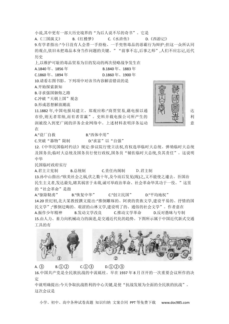 小学、初中、高中各种试卷真题知识归纳文案合同PPT等免费下载www.doc985.com2018年11月浙江省学考选考试卷历史一、选择题(本大题共30小题,每小题2分,共60分。每小题列出的4个选项中只有一个是符合题目要求的,不选、多选、错选均不得分)1.马克思指出:“理论在一个国家实现的程度,总是取决于理论满足这个国家的需要的程度。”在春秋战国国家走向统一的时代,讲求“耕战”,富国强兵,“满足”秦实现统一的理论是A.儒家思想B.道家思想C.法家思想D.墨家思想2.论及“汉承秦制”,有学者指出:“尽管表面上与秦及其制度划清了界限,但汉朝实质上重建了秦的中央集权官僚政治。”下列项中能够体现上述认识的是A.分封诸侯王,郡国并存B.划分监察区,建立十三部刺史C.限制相权,建立“中朝”决策机制D.设司隶校尉,加强对官吏的监督3.盛唐时代,可算得中国历史上“令人振奋”的一段时期,文学艺术达到鼎盛。后人歌咏唐代灿烂文化星空中“双子星座”的典型诗文是A.“颜柳二公书尤多”B.“唐之文章称韩柳”C.“奔放雄杰有若苏辛”D.“李杜诗篇万口传”4.谈到宋代对外贸易情况,有论著谓:“海洋中的航线取代了沿着海岸的线路。船只配备了密闭舱,航行不再完全依赖顺风,船舵的改进、指南针的运用以及对季风更深入的了解使这样的航行成为可能……中国港口城市建有阿拉伯人和波斯人的聚居区。”下列项中与上述材料相对应的史实是①指南针对航海事业的发展意义重大②聚居区严格按坊市制度进行管理③宋代彻底放弃了唐代的海外贸易航线④瓷器成为“海上丝绸之路”重要的外销商品A.①④B.②③C.①②③D.②③④5.独具时代特色的历史信息在风云流转的时空中,是社会发展的一个个指示性坐标。下表所列信息,按朝代(周、秦、唐、元)先后排列正确的是A.①②④③B.①④②③C.③②①④D.④②①③6.古代理学家所提倡的“慎思明辨,格物致知”,旨在强调A.知行合一B.本心即天理C.穿衣吃饭即是人伦物理D.日积月累与循序渐进7.说到某项举措实施的原委,史载:“盖以国家事务殷繁,人情弊端种种,诸臣有陈奏之心,或有不便显言之处,故令……密陈朕前……欲以众人之耳目,为朕之耳目,使民隐得闻,万事就理”。据此判断,下列项中与之相符的是A.建立通政司B.建立密折制C.设立枢密院D.设立军机处8.文化是一个民族的灵魂。中国古代不同时期,文学形式异彩纷呈。明清涌现出著名的四大小学、初中、高中各种试卷真题知识归纳文案合同PPT等免费下载www.doc985.com小说,其中更有一部大历史境界的“为后人说不尽的奇书”。它是A.《三国演义》B.《红楼梦》C.《水浒传》D.《西游记》9.有学者指出:“今日没有人会替一手持枪、一手兜售毒品的恶霸行为辩护;但这一众所认同的观点,依旧未把毒品本身当作问题的关键。”“前事不忘,后事之师”,人们不应忘记,近代历史上,以维护可耻的毒品贸易为目的发动的两次侵略战争发生在A.1840年、1856年B.1840年、1883年C.1860年、1894年D.1860年、1900年10.请看右图书影。下列项中对该书内容解读错误的是A.开始探索新知B.寻求强国御侮之路C.冲破“天朝上国”观念D.形成思想解放潮流11.1882年,中国电报局建立。郑观应称:“商贾贸易,藉电报以通达市价,则无者常绌,而有者常赢”。史料并载电报公司所产生的利润被投入到更广阔的洋务企业网络中。上述材料表明洋务运动意在A.“设厂自救B.“西体中用”C.突破“器物”限制D.“求富”以“自强”12.《中华民国临时约法》规定:参议院行使立法权,有权选举临时大总统、弹劾临时大总统及国务员;临时大总统及国务员行使行政权,国务员“辅佐临时大总统,负其责任”。这说明中华民国临时政府实行A.君主立宪制B.总统制C.责任内阁制D.君主制13.孙中山指出:“欧美社会之祸,伏之数十年,及今而后发见(现)之,又不能使之遽去。吾国治民生主义者,发达最先,睹其祸害于未萌,诚可举政治革命、社会革命毕其功于一役。”这里的“社会革命”是指A.“驱除鞑虏”B.“恢复中华”C.“创立民国”D.“平均地权”14.20世纪初,北大某教授撰文提出:“推倒雕琢的、阿谀的贵族文学,建设平易的、抒情的国民文学”;“推倒迂晦的、艰涩的山林文学,建设明了的、通俗的社会文学”。作者意在A.振作少年精神B.发动文学改良C....