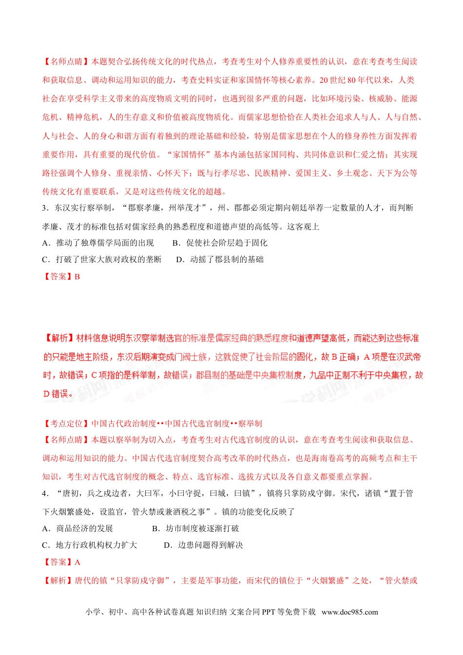 本卷共20小题,每小题2分,共40分。在每小题给出的四个选项中,只有一项是符合题目要求的。1.考古工作者在河南辉县琉璃阁发掘了一座春秋时期的诸侯墓,出土了只有周天子才能使用的九鼎。这反映了A.宗法制度的瓦解B.分封制度的崩溃C.等级制度的颠覆D.礼乐制度的破坏【答案】D【考点定位】中国古代政治制度••商周政治制度••礼乐制度【名师点睛】本题以春秋时期的诸侯墓为切入点,考查考生对中国早期政治制度的认识,意在考查考生阅读和获取信息、调动和运用知识的能力,考查时空意识和历史解释等核心素养。礼乐制度和宗法分封制盛行于西周、春秋时期破坏、战国时期崩溃瓦解,礼乐制度是西周维护宗法分封制的工具,是为了维护和调和等级制度。2.“物格而后知至,知至而后意诚,意诚而后心正,心正而后身修,身修而后家齐,家齐而后国治,国治而后天下平。”下列各项中,最接近这一说法的是A.其身正,不令而行;其不正,虽令不从B.视天下犹一家,中国犹一人C.勿以恶小而为之,勿以善小而不为D.居庙堂之高,则忧其民;处江湖之远,则忧其君【答案】A【解析】材料信息“物格——知至——意诚——心正——身修——家齐——国治——天下齐”体现了“修身、齐家、治国、平天下”的思想,强调个人修养的重要性。“其身正,不令而行;其不正,虽令不从”说明了修身的重要性,故A项正确;B项反映的是专制思想,故排除;C项强调向善的思想,故排除;D项强调的是个人的责任感,不符合材料信息,故排除。【考点定位】中国古代传统主流思想的演变••儒家思想••个人修养的重要想小学、初中、高中各种试卷真题知识归纳文案合同PPT等免费下载www.doc985.com【名师点睛】本题契合弘扬传统文化的时代热点,考查考生对个人修养重要性的认识,意在考查考生阅读和获取信息、调动和运用知识的能力,考查史料实证和家国情怀等核心素养。20世纪80年代以来,人类社会在享受科学主义带来的高度物质文明的同时,也遇到很多严重的问题,比如环境污染、核威胁、能源危机、精神危机,人的生存意义和价值被高度物质化。而儒家思想恰恰在人类社会追求人与人、人与自然、人与社会、人的身心和谐方面有着独到的理论基础和经验,特别是儒家思想在个人的修身养性方面发挥着重要作用,具有重要的现代价值。“家国情怀”基本内涵包括家国同构、共同体意识和仁爱之情;其实现路径强调个人修身、重视亲情、心怀天下;既与行孝尽忠、民族精神、爱国主义、乡土观念、天下为公等传统文化有重要联系,又是对这些传统文化的超越。3.东汉实行察举制,“郡察孝廉,州举茂才”,州、郡都必须定期向朝廷举荐一定数量的人才,而判断孝廉、茂才的标准包括对儒家经典的熟悉程度和道德声望的高低等。这客观上A.推动了独尊儒学局面的出现B.促使社会阶层趋于固化C.打破了世家大族对政权的垄断D.动摇了郡县制的基础【答案】B【考点定位】中国古代政治制度••中国古代选官制度••察举制【名师点睛】本题以察举制为切入点,考查考生对古代选官制度的认识,意在考查考生阅读和获取信息、调动和运用知识的能力。中国古代选官制度契合高考改革的时代热点,也是海南卷高考的高频考点和主干知识,考生对古代选官制度的概念、特点、选官标准、选拔方式以及各自意义都要重点掌握。4.“唐初,兵之戍边者,大曰军,小曰守捉,曰城,曰镇”,镇将只掌防戍守御。宋代,诸镇“置于管下火烟繁盛处,设监官,管火禁或兼酒税之事”。镇的功能变化反映了A.商品经济的发展B.坊市制度被逐渐打破C.地方行政机构权力扩大D.边患问题得到解决【答案】A【解析】唐代的镇“只掌防戍守御”,主要是军事功能,而宋代的镇位于“火烟繁盛”之处,“管火禁或小学、初中、高中各种试卷真题知识归纳文案合同PPT等免费下载www.doc985.com兼酒税之事”,这说明经济职能增强,这一变化反映出宋代商品经济的发展,故A正确;坊市制度指的是城市布局,材料没有体现出坊市制度被打破,故B错误;材料体现的是城镇职能的变化,体现不出地方行政机构的权力大小变化,故C错误;依据所学知识可知,终宋一代,边患问题始终没有得到解决,故D错误。【考点定位】中...