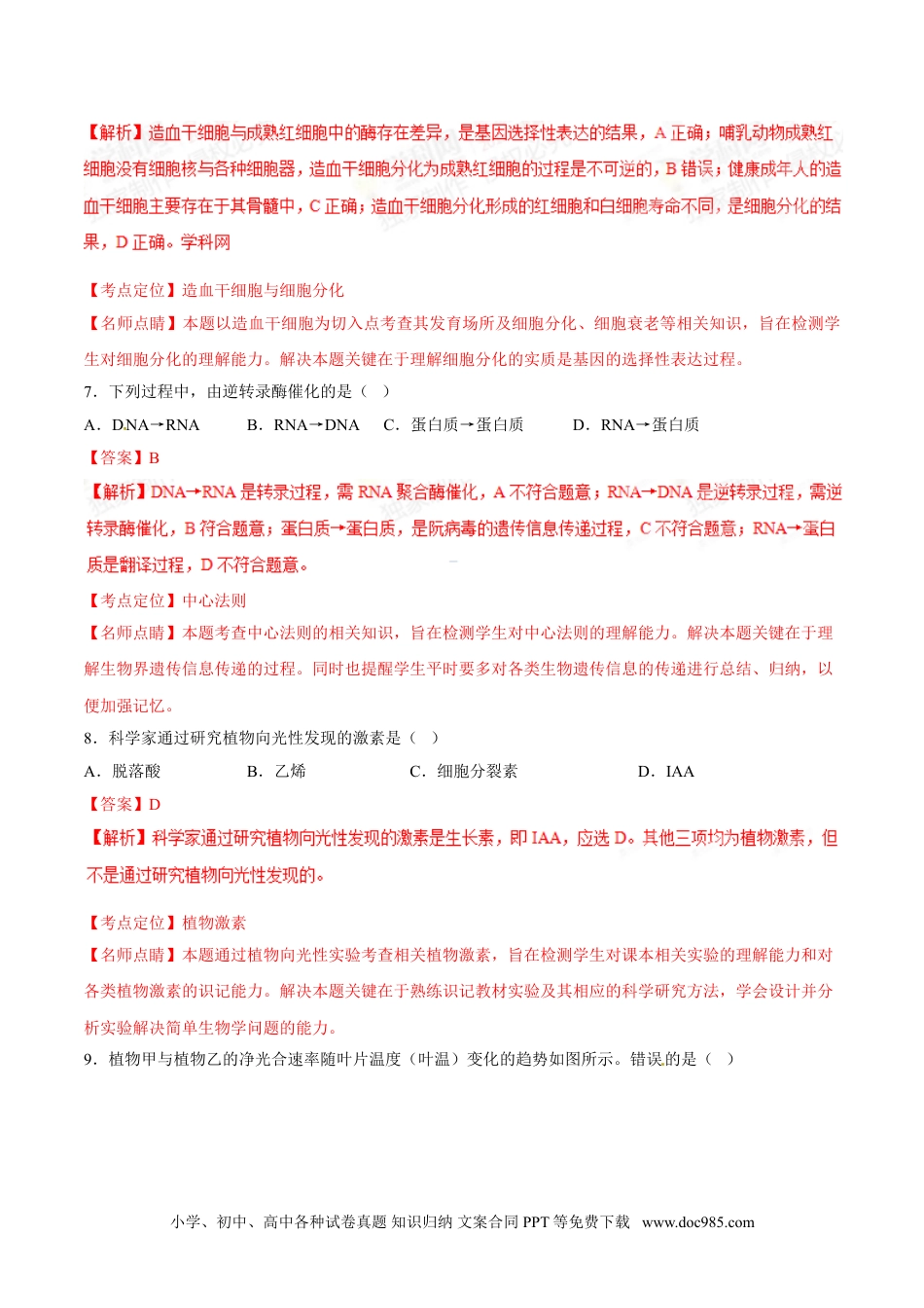 1.细胞膜是细胞的重要结构。关于细胞膜的叙述,错误的是()A.细胞膜是一种选择透过性膜B.乙醇通过细胞膜需要消耗ATPC.氨基酸借助膜蛋白可通过细胞膜D.蛋白质分子可以嵌入磷脂双分子层中【答案】B【考点定位】细胞膜的结构与功能【名师点睛】本题考查细胞膜的结构及物质跨膜运输等相关知识,旨在检测学生对细胞膜的流动镶嵌模型的理解能力和判断能力。解决本题关键在于理解细胞膜结构特点与功能特点及其关系。2.细胞是生命活动的基本单位。关于细胞结构的叙述,错误的是()A.细菌有核塘体,无叶绿体B.蓝藻无细胞核,也无核糖体C.水绵有细胞核,也有叶绿体D.酵母菌有细胞核,无叶绿体【答案】B【考点定位】原核细胞结构与真核细胞结构【名师点睛】本题综合考查了原核细胞结构与真核细胞结构等相关知识,旨在检测学生对相关基础知识的掌握情况,同时也提醒学生平时要多对相关知识点进行总结、归纳,以便加强记忆,如细胞结构与功能的统一性等。3.ATP是直接为细胞生命活动提供能量的有机物。关于ATP的叙述,错误的是()A.酒精发酵过程中有ATP生成B.ATP可为物质跨膜运输提供能量C.ATP中高能磷酸键水解可释放能量D.ATP由腺嘌呤、脱氧核糖和磷酸组成【答案】D小学、初中、高中各种试卷真题知识归纳文案合同PPT等免费下载www.doc985.com【考点定位】ATP【名师点睛】本题考查ATP的结构、功能及来源等相关知识,旨在检测学生对ATP相关的知识的理解能力和判断能力。解决本题关键在于区分ATP的结构及ATP与ADP之间的相互转化关系。4.关于生物体产生的酶的叙述,错误的是()A.酶的化学本质是蛋白质或RNAB.脲酶能够将尿素分解成氨和CO2C.蛋白酶和淀粉酶都属于水解酶类D.纤维素酶能够降解植物细胞壁和细菌细胞壁[来源:学|科|网]【答案】D【考点定位】酶【名师点睛】本题考查酶的成分及常见的酶功能等相关知识,旨在检测学生对酶的成分及功能的专一性等相关知识的理解能力和判断能力。同时也提醒学生平时要多对相关的酶进行总结、归纳,以便加强记忆,理解酶的催化功能具有专一性的特点。5.关于细胞凋亡的叙述,错误的是()A.细胞凋亡受细胞自身基因的调控B.细胞凋亡也称为细胞编程性死亡C.细胞凋亡不出现在胚胎发育过程中D.被病原体感染的细胞可通过细胞凋亡清除【答案】C【考点定位】细胞凋亡【名师点睛】本题考查细胞凋亡及其原因等相关知识,旨在检测学生对细胞凋亡的相关知识的理解能力和记忆能力。解决本题关键在于识记并理解细胞凋亡的原因。6.关于人体造血干细胞的叙述,错误的是()A.造血干细胞与成熟红细胞中的酶存在差异B.造血干细胞分化为成熟红细胞的过程是可逆的C.健康成年人的造血干细胞主要存在于其骨髓中D.造血干细胞分化形成的红细胞和白细胞寿命不同【答案】B小学、初中、高中各种试卷真题知识归纳文案合同PPT等免费下载www.doc985.com【考点定位】造血干细胞与细胞分化【名师点睛】本题以造血干细胞为切入点考查其发育场所及细胞分化、细胞衰老等相关知识,旨在检测学生对细胞分化的理解能力。解决本题关键在于理解细胞分化的实质是基因的选择性表达过程。7.下列过程中,由逆转录酶催化的是()A.DNA→RNAB.RNA→DNAC.蛋白质→蛋白质D.RNA→蛋白质【答案】B【考点定位】中心法则【名师点睛】本题考查中心法则的相关知识,旨在检测学生对中心法则的理解能力。解决本题关键在于理解生物界遗传信息传递的过程。同时也提醒学生平时要多对各类生物遗传信息的传递进行总结、归纳,以便加强记忆。8.科学家通过研究植物向光性发现的激素是()A.脱落酸B.乙烯C.细胞分裂素D.IAA【答案】D【考点定位】植物激素【名师点睛】本题通过植物向光性实验考查相关植物激素,旨在检测学生对课本相关实验的理解能力和对各类植物激素的识记能力。解决本题关键在于熟练识记教材实验及其相应的科学研究方法,学会设计并分析实验解决简单生物学问题的能力。9.植物甲与植物乙的净光合速率随叶片温度(叶温)变化的趋势如图所示。错误的是()[来源:学,科,网Z,X,X,K]小学、初中、高中各种试卷真题知识归纳文案合同PPT等免费下载www.doc985.comA.植物甲和...