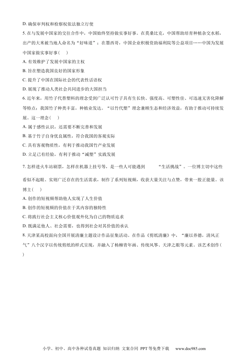 小学、初中、高中各种试卷真题知识归纳文案合同PPT等免费下载www.doc985.com2023年天津高考政治试卷一、选择题。1.党的二十大报告强调“中国化时代化的马克思主义行”。中国化时代化的马克思主义贴近国情、贴近时代、贴近人民,回答了中国之问、世界之问、人民之问、时代之问,成为中国共产党能、中国特色社会主义好的理论支撑。强调“中国化时代化的马克思主义行”()①彰显了中国共产党人的理论自信②要求我们不断开辟马克思主义中国化时代化新境界③意味着中国化时代化的马克思主义是检验真理的标准④明确中国化时代化的马克思主义是世界各国的行动指南A.①②B.①④C.②③D.③④2.“晋江经验”集中体现了习近平总书记推进县域现代化的思路。晋江在福建率先推出居住证制度,在教育就业等方面坚持同城同待遇、保障全覆盖;在发展经济的同时,积极推进文化惠民、让老百姓在家门口享受到丰富多彩的文化生活。晋江的这些做法折射出推进中国式现代化要()①构建新发展格局②着力维护和促进社会公平正义③实现区域优势互补④坚持物质文明和精神文明协调发展A.①②B.①③C.②④D.③④3.2023年全国两会前夕,代表委员们走进群众收集意见建议,准备议案提案。在广东,杨登辉代表广泛征集建议,笔记本上写满技能人才培养的“金点子”;在河南,马萧林委员把调研重点放在红色遗产保护利用上,积极探索让文物“活”起来的有效方式……代表委员们()A.深入基层汇集民意,是全过程人民民主的生动实践B.建言献策贡献智慧力量,使议案提案顺利转化为政府决策C.解决了群众关心的突出问题,助力党和国家事业兴旺发达D.把群众意见化为议案提案,是对国家大事行使决定权的表现4.司法公开是评判一个国家法治水平的重要标准。我国司法机关不断探索司法公开的新方式、新渠道,使人民群众通过政务网站、手机客户端等了解司法、走近司法、评价司法,让司法权在阳光下运行。这表明,司法公开()A.发挥人民监督作用推进公正司法B.保证司法程序和司法结果的公正C.合理设定司法机关的权力与责任小学、初中、高中各种试卷真题知识归纳文案合同PPT等免费下载www.doc985.comD.确保审判权和检察权依法独立行使5.在与发展中国家的交往合作中,中国始终坚持做实事好事。在莫桑比克,中国帮助培育种植杂交水稻,出产的大米被当地人命名为“好味道”;在墨西哥,中国企业积极资助福利院等公益项目……中国为发展中国家做实事好事()A.有效维护了发展中国家的主权B.旨在塑造我国良好的国家形象C.提升了中国在国际社会的代表性话语权D.展现了推动人类社会共同进步的大国担当6.近年来,用竹子代替塑料的理念受到广泛认可竹子具有生长快、强度高、可塑性佳、可迅速无害化降解等特点;我国竹子种类丰富,种植业发达。“以竹代塑”理念兼顾生态和经济效益,有助于推动可持续发展。这一理念()A.属于感性认识,还需要不断完善和发展B.基于竹子自身优良属性,符合我国的客观实际C.具有客观物质性,有利于推动我国竹产业发展D.立足已有经验,有利于推动“减塑”实践发展7.怎样进火车站刷票,怎样在机器上挂号等,是一些人可能遇到的“生活挑战”。一位博主切中这些看似不起眼、实则广泛存在的生活需求,制作了系列短视频,收获大量关注与点赞,带来一股正能量。该博主()A.创作的短视频帮助他人实现了人生价值B.创作的短视频的价值在于其内容的独特性C.将践行社会主义核心价值观外化为自己的物质追求D.既满足他人、社会需要,也得到社会对其价值的承认8.天津某高校面向全国开展清廉主题设计作品征集活动。在作品《剪纸清廉》中,“廉以养德,清风正气”八个汉字以传统剪纸的样式呈现,并融入了杨柳青年画、传统风筝、天津之眼等元素。该艺术创作()小学、初中、高中各种试卷真题知识归纳文案合同PPT等免费下载www.doc985.com①展现时代风貌,涵养高尚情操②丰富艺术内涵,推动认识发展③融通不同资源,实现艺术创新④追求社会效益,兼顾经济效益A.①②B.①③C.②④D.③④9.中华优秀传统文化源远流长、博大精深。要发挥中华优秀传统文化的当代价值,必须实现创造性转化与创新性发展。下列选项中体现这一要求的是()A.举办全景数字艺术...
